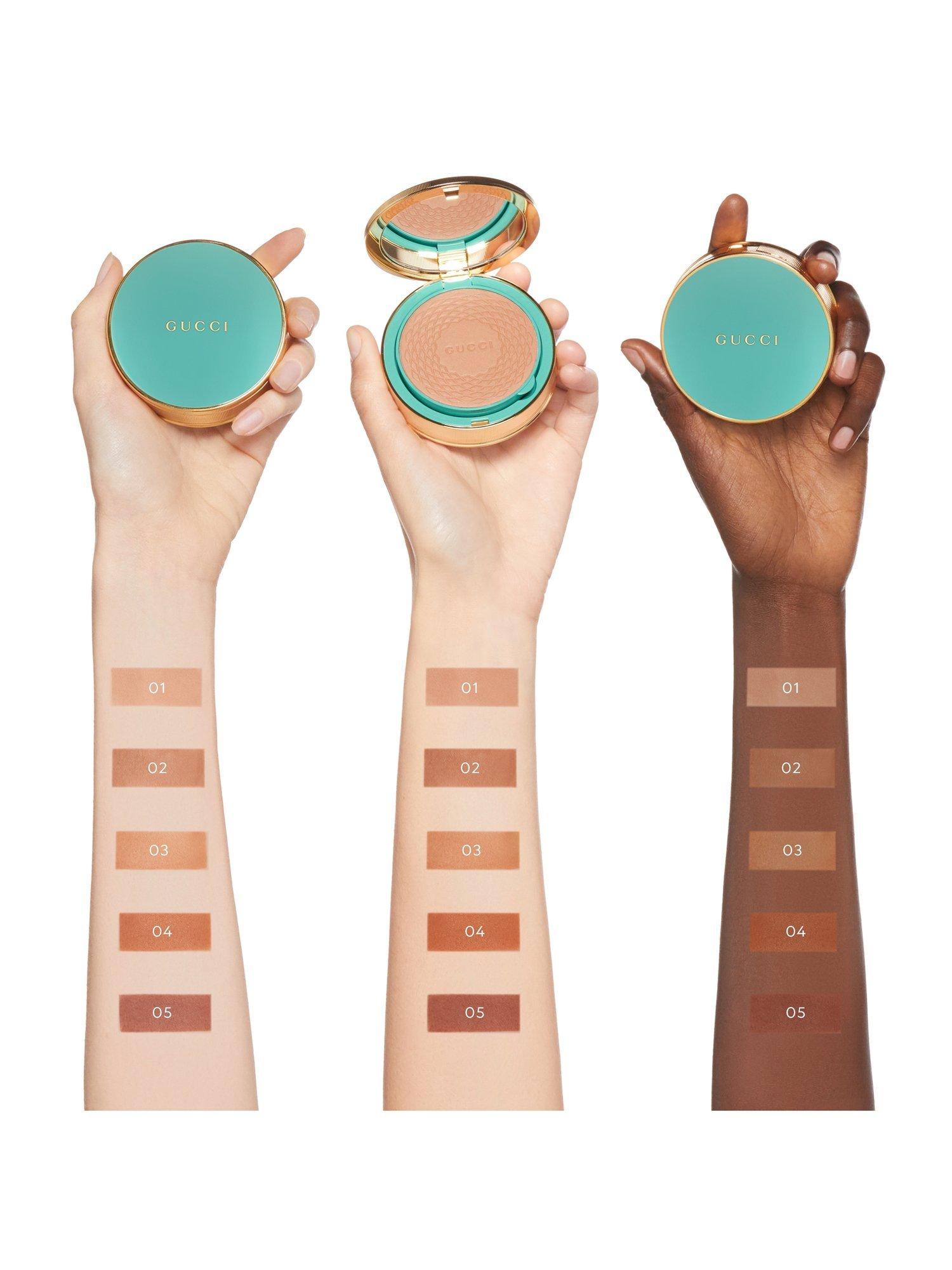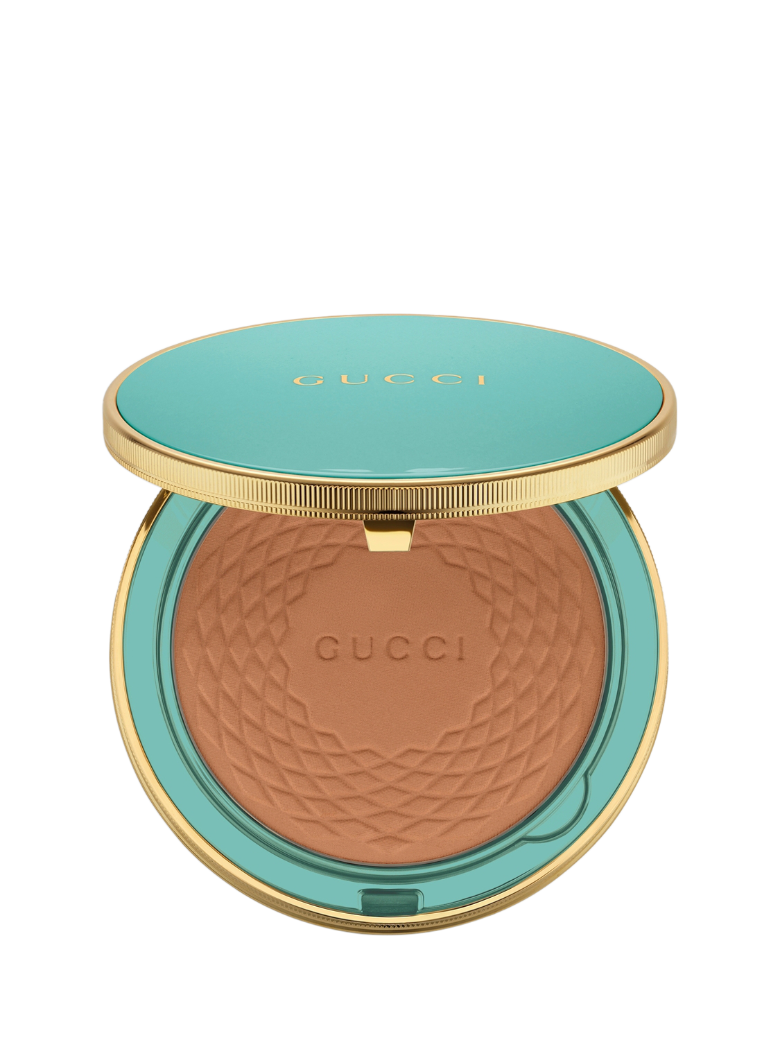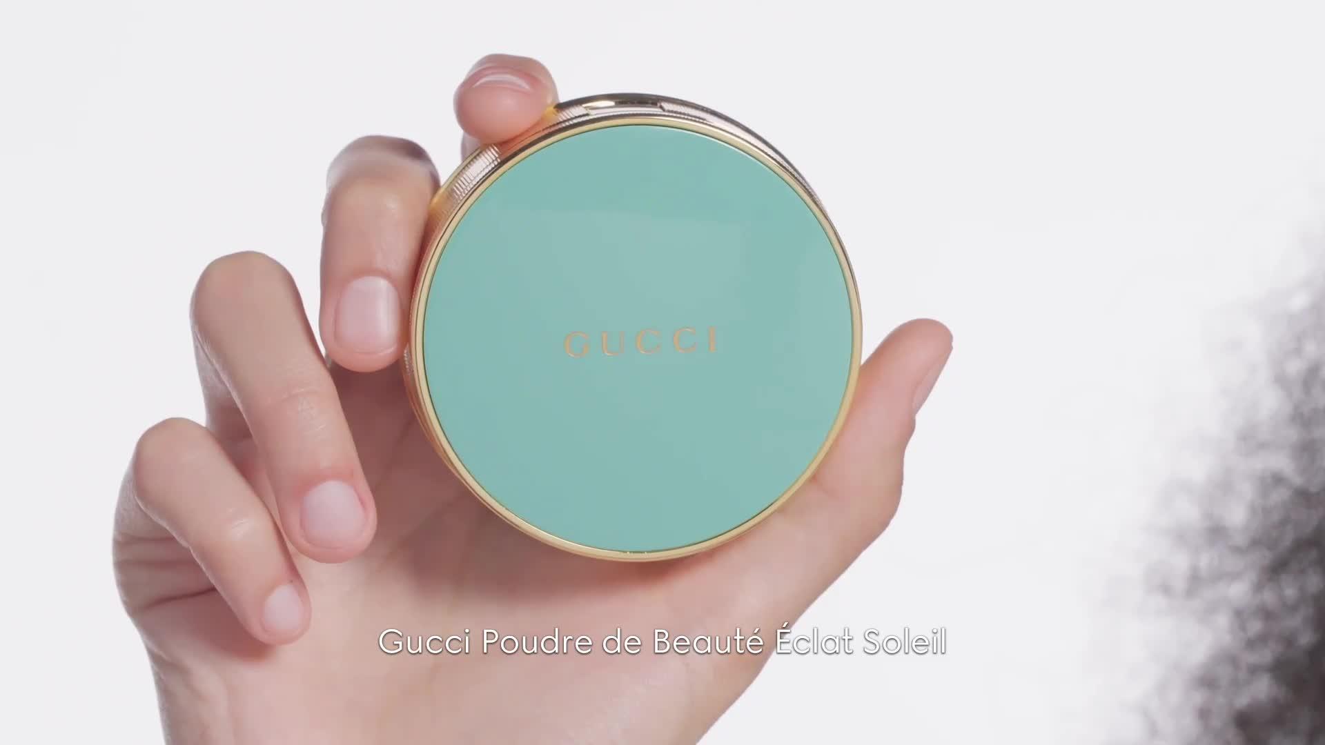 Available in five warming shades, Gucci Poudre De Beauté Éclat Soleil Beauty Powder is encased within an aqua blue and gold trim compact complete with an integrated applicator. It is a precious and lasting emblem of sustainable beauty.