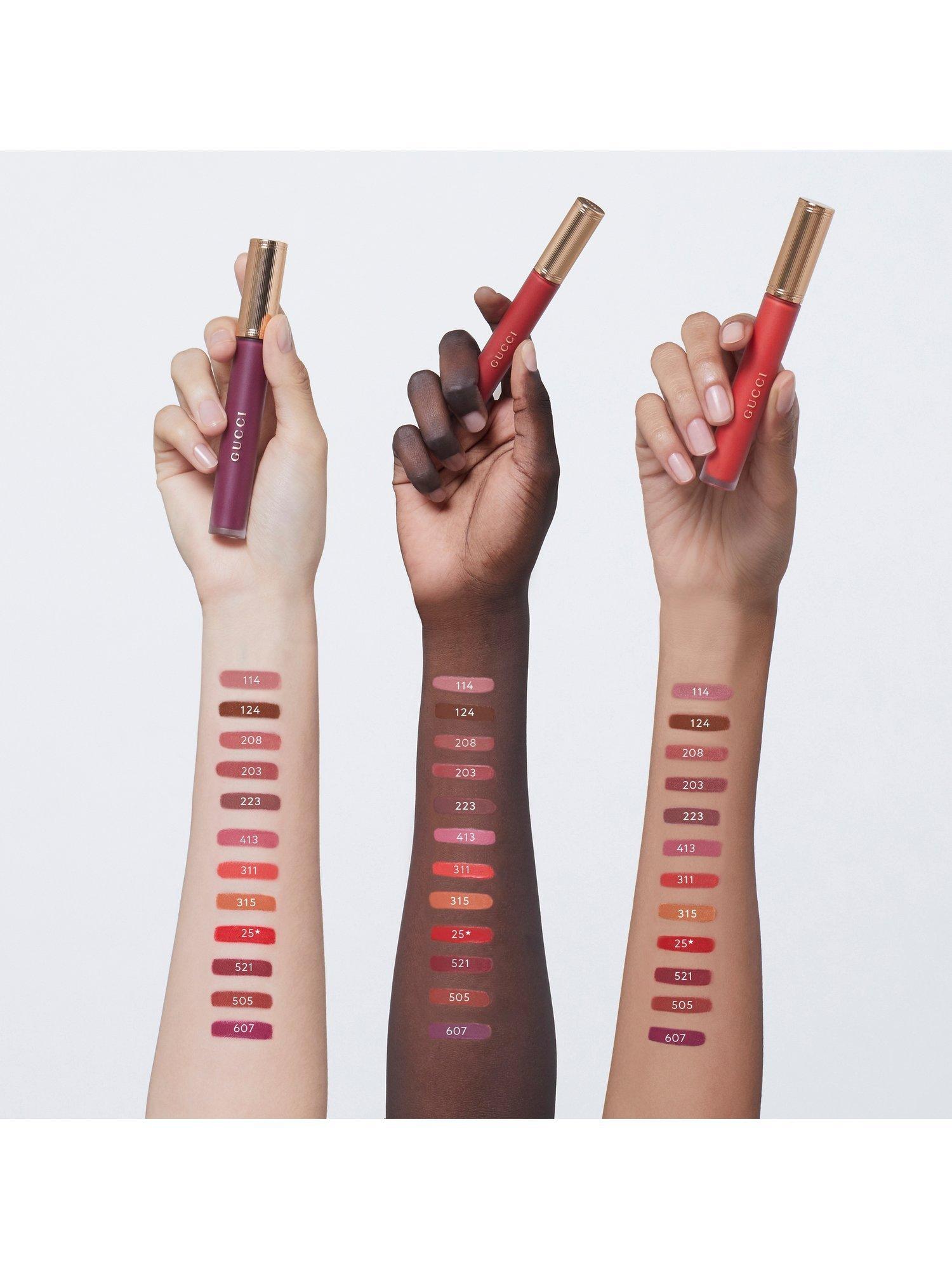 The design and range: Encased within a vintage long tube, frosted to showcase the shade within, Rouge À Lèvres Liquide Matte Gucci matte lipstick is topped with a gold lid and finished with gold lettering. Nine shades from natural, rosewood, orange to pink, red and plum capture the rainbow of shades in the sky as the sun begins to set, offering a lip colour choice for both warm and cool skin tones.