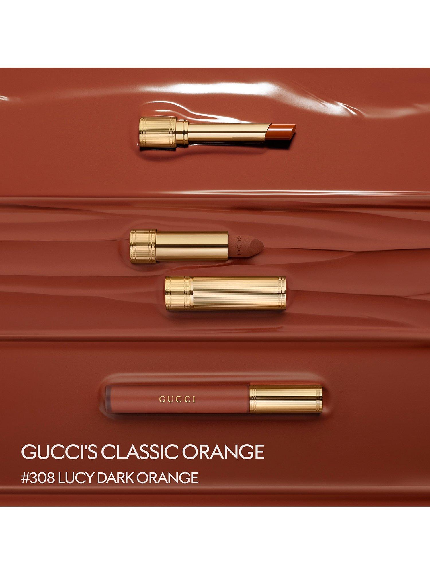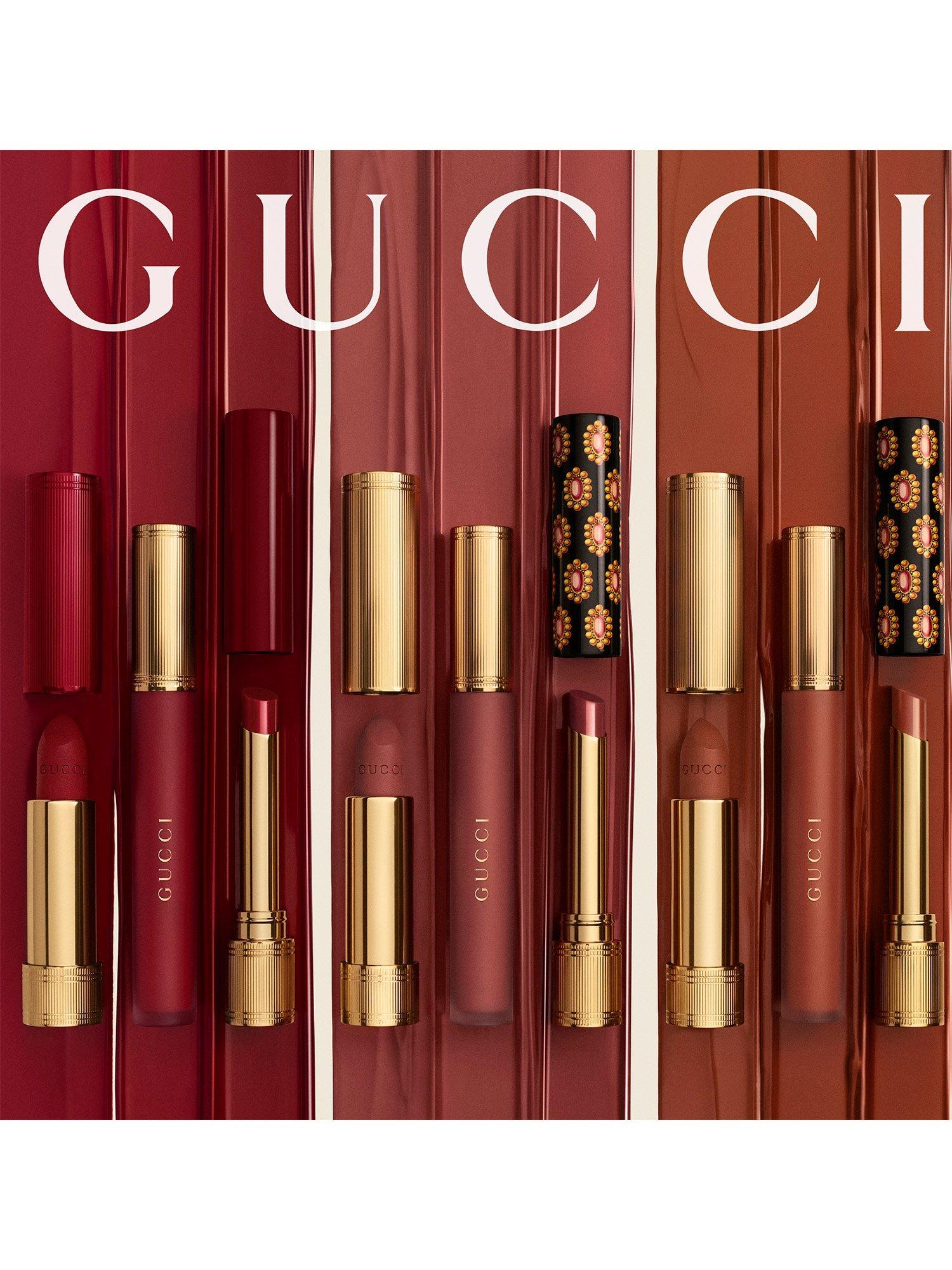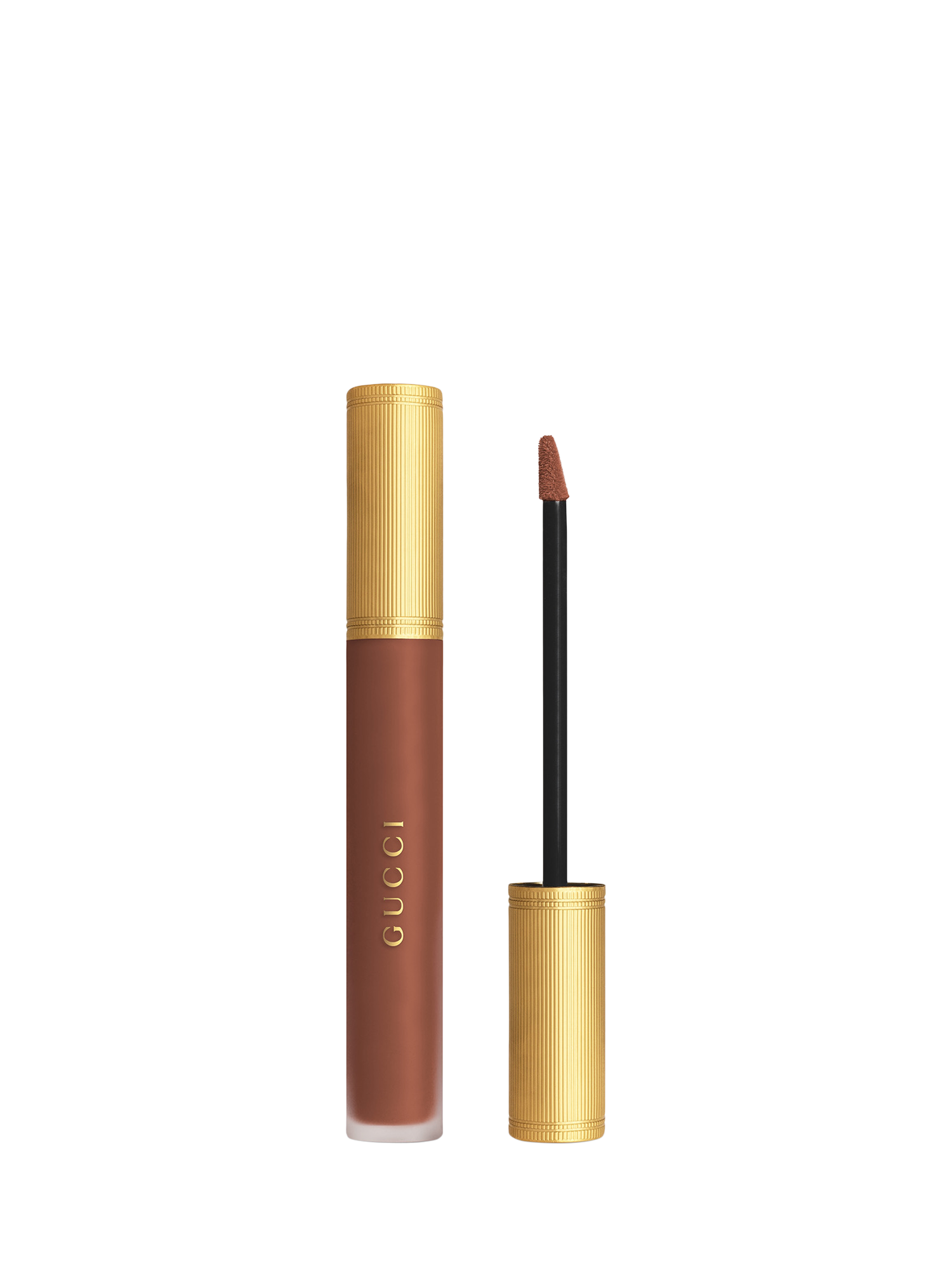 The formula and the application: Formulated with a caring combination of Black Rose oil and Hyaluronic Acid, and an infusion of Vitamin E, Rouge À Lèvres Liquide Matte Gucci lipstick smooths and cares for the lips. With a completely weightless texture, the highly pigmented colour is initially liquid and creamy before transforming to a powdery matte texture for a lightweight feeling. A soft and slanted applicator ensures the lipstick glides easily on. Entirely transfer-proof, it is a matte lipstick designed with the freedom to build and blend, whether the desired look is a soft blur or a defined finish.