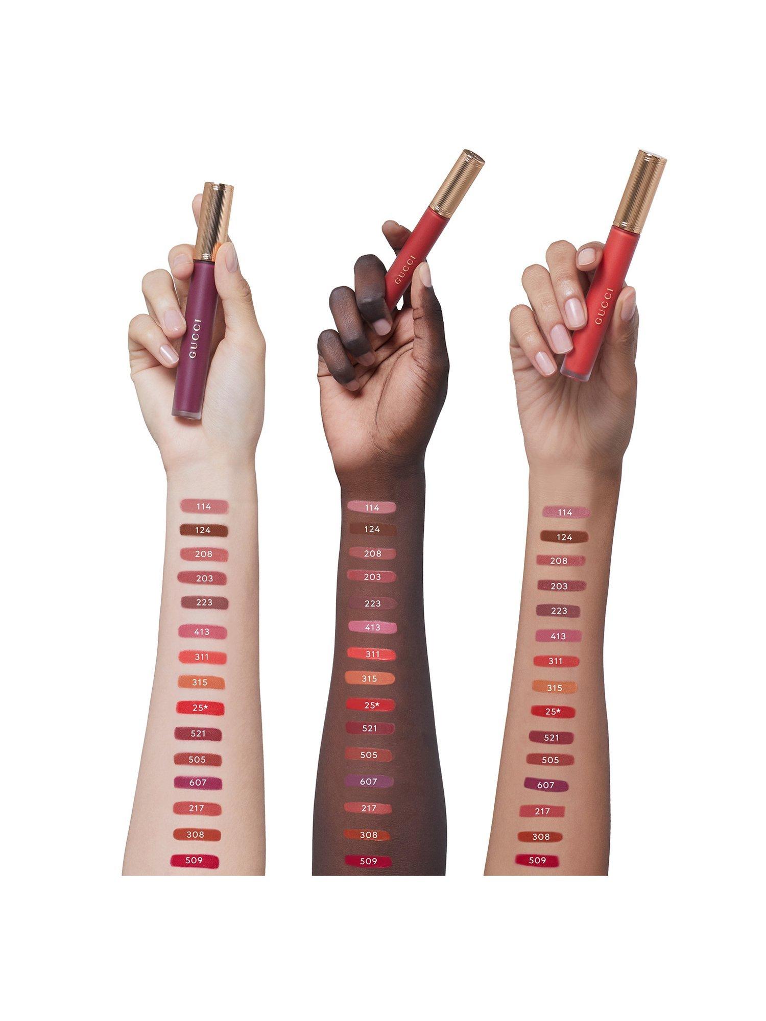 For lips that hypnotise. Rouge À Lèvres Liquide Matte is a transformative cream to powder Gucci liquid lipstick with a transfer-proof soft matte finish. Highly pigmented, the array of vibrant, sunset shades provides optimal coverage and striking colour, without the worry of it settling into lip lines, smudging or feathering, even on fabric. Created with comfort in mind, the colour feels entirely weightless on the lips.