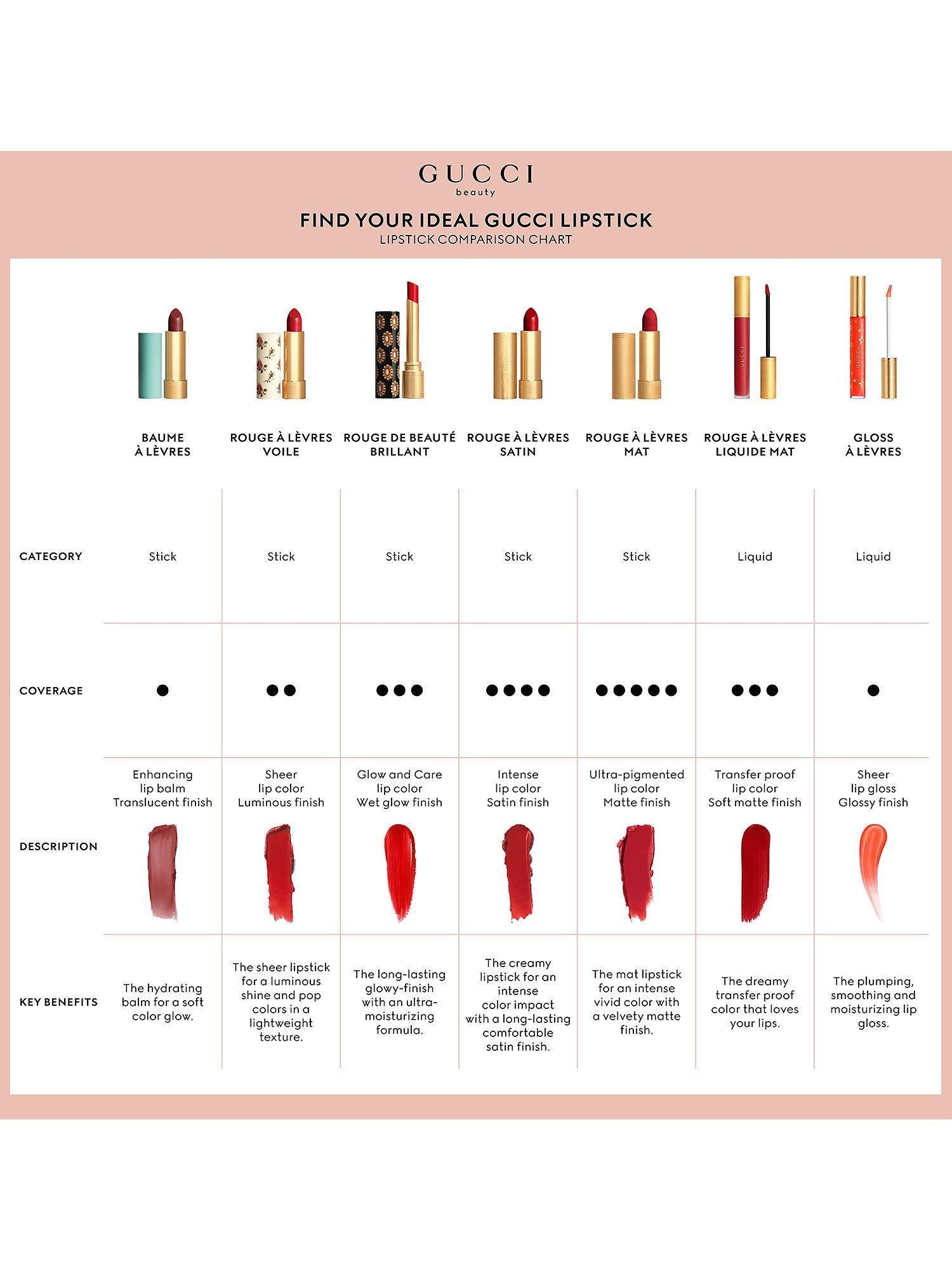 Rouge à Lèvres Matte Gucci lipstick delivers bright and rich lip colour with a soft and velvety feel. It has a silk-like texture enriched with oils and gelling waxes for a comfortable finish without drying out your lips or colour smudging.