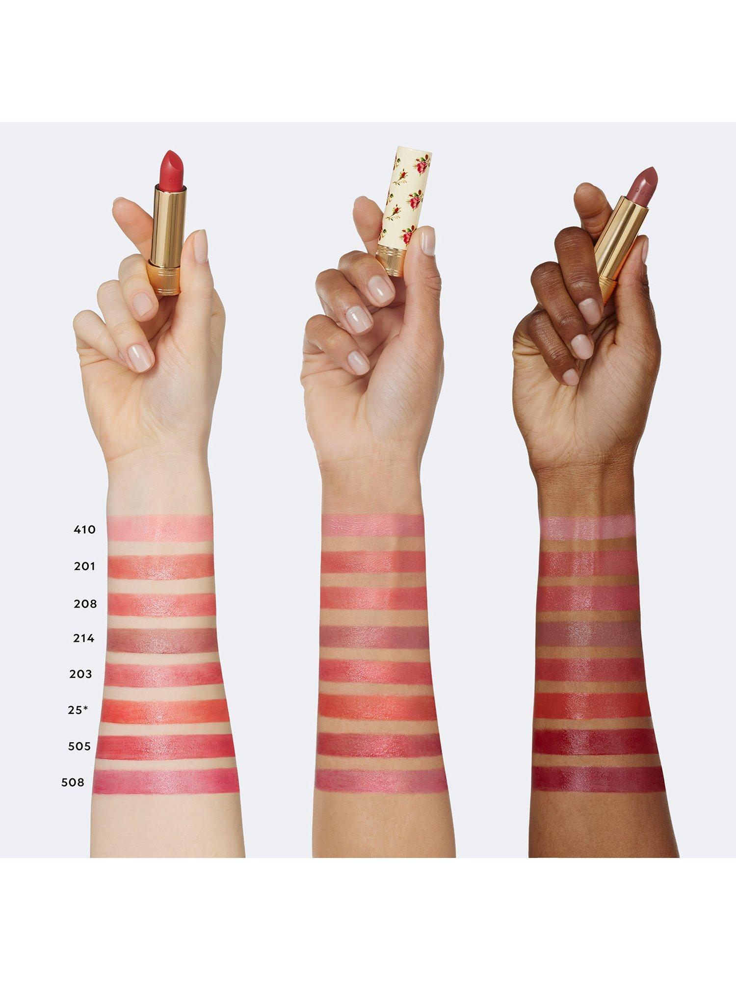 Your first step to 'Get the Gucci Glow'. Inspired by the golden age of Hollywood and Gucci’s bold creative spirit, the shade range speaks to a timeless yet expressive vision of beauty, where self-expression meets sheer luminosity. Encased in gold-toned tubes topped with vintage rose-print caps, these lipsticks recall the glamour of the 1950s, reimagined with a modern glow.