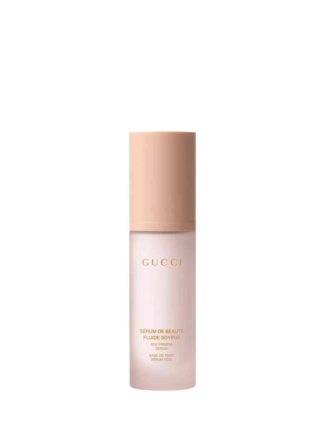 Available as one universal formula, Sérum De Beauté Fluide Soyeux Silk Priming Serum is presented in a heavy-set glass tube finished in frozen pink, with a pale pink cap and iconic Gucci lettering in gold.