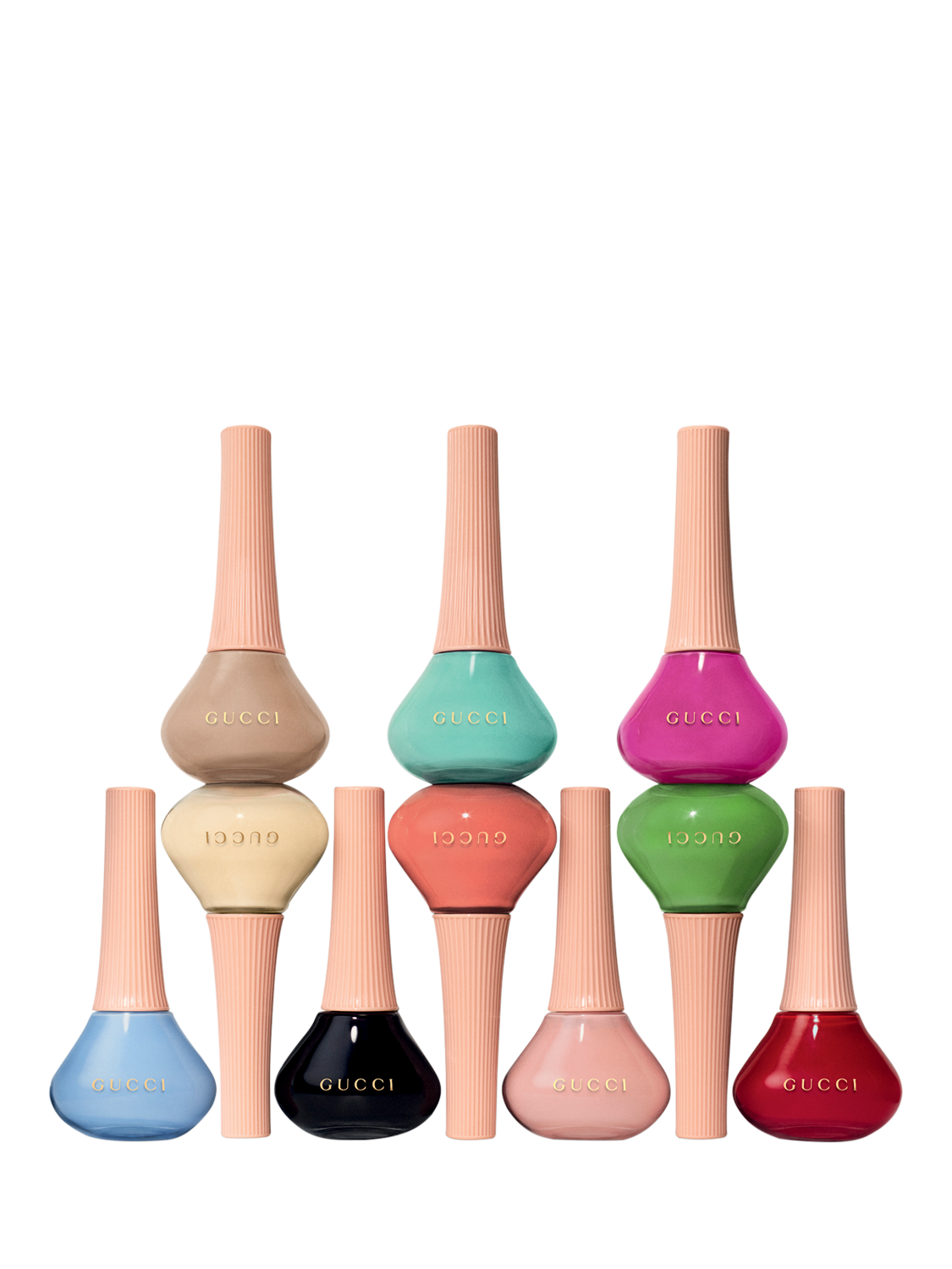 Inspired by vintage nail polish bottles, Vernis À Ongles nail polish is designed with a sleek ribbed grip handle, while the pear-shaped clear glass bottle is finished with Gucci lettering in gold. Available in ten shades – Alessandro Michele’s favourites – the collection of vibrant and intense colours covers all bases. From a muted mint green to a deep cobalt blue, blush pink and Gucci’s emblematic Goldie Red 25*, the range is perfect for multiple combinations, moods, and moments.