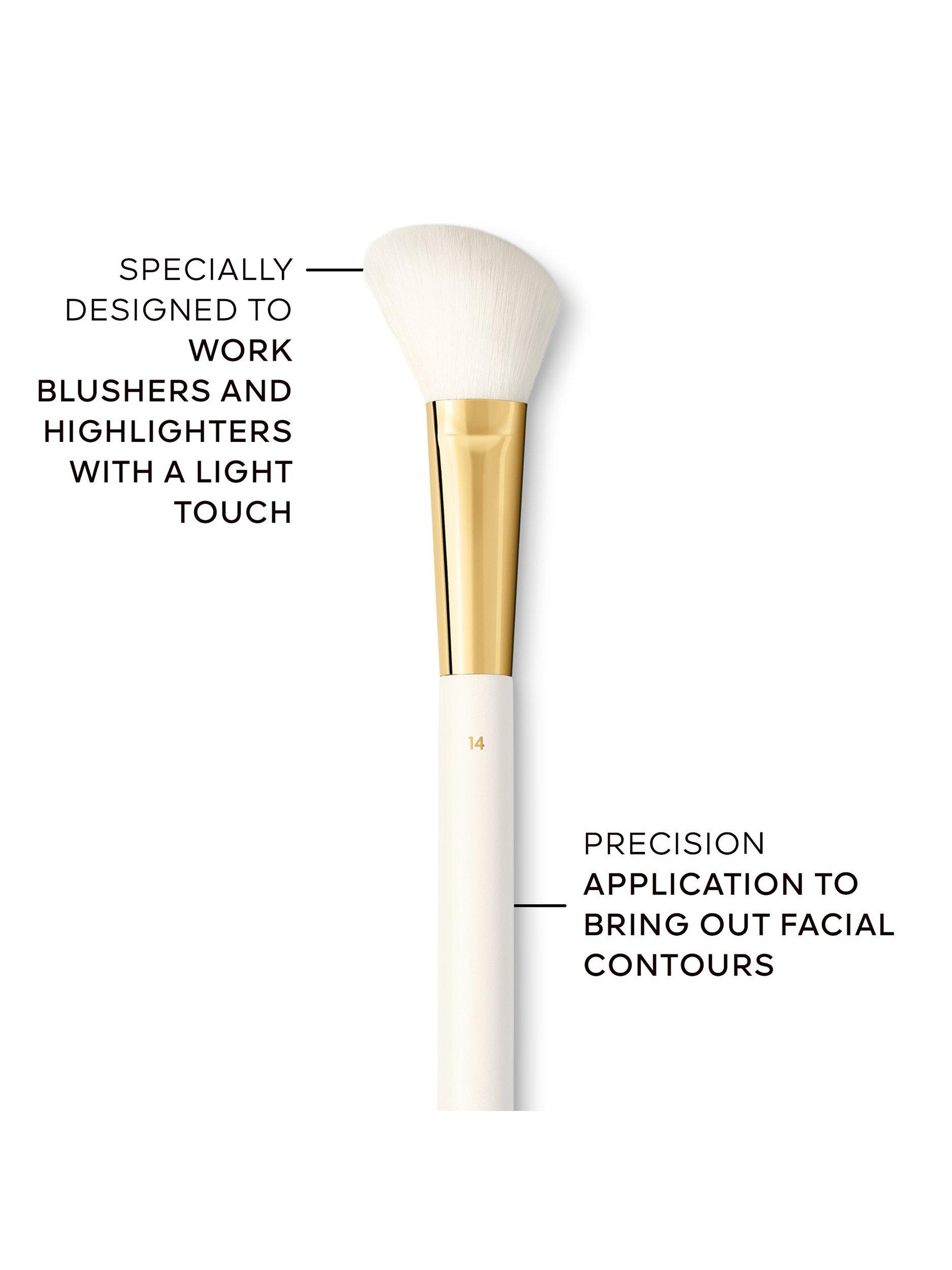 For blushers, using the flat side of Brush n°14, apply blusher to the apple of the cheek, blending upwards towards the temples.