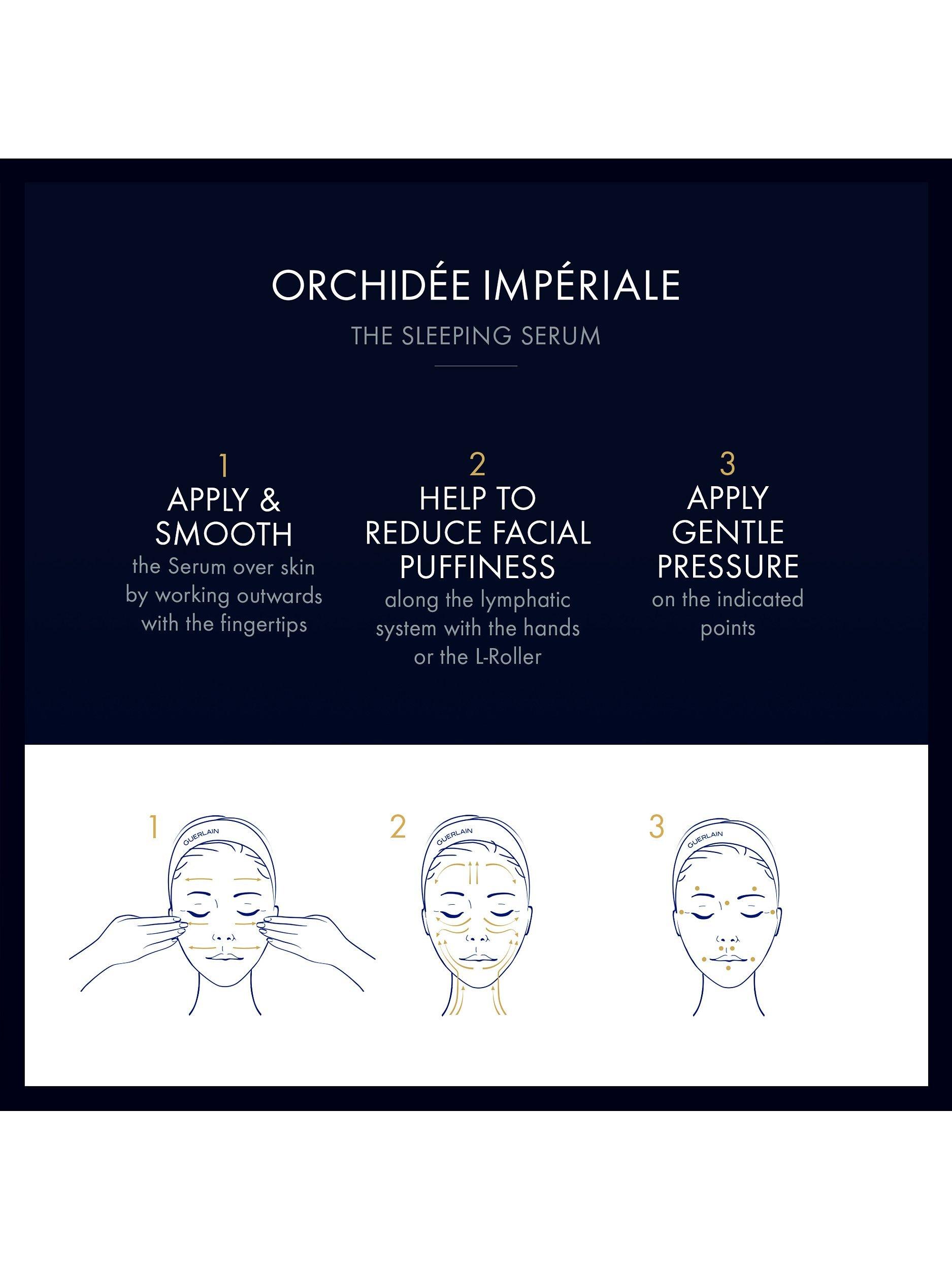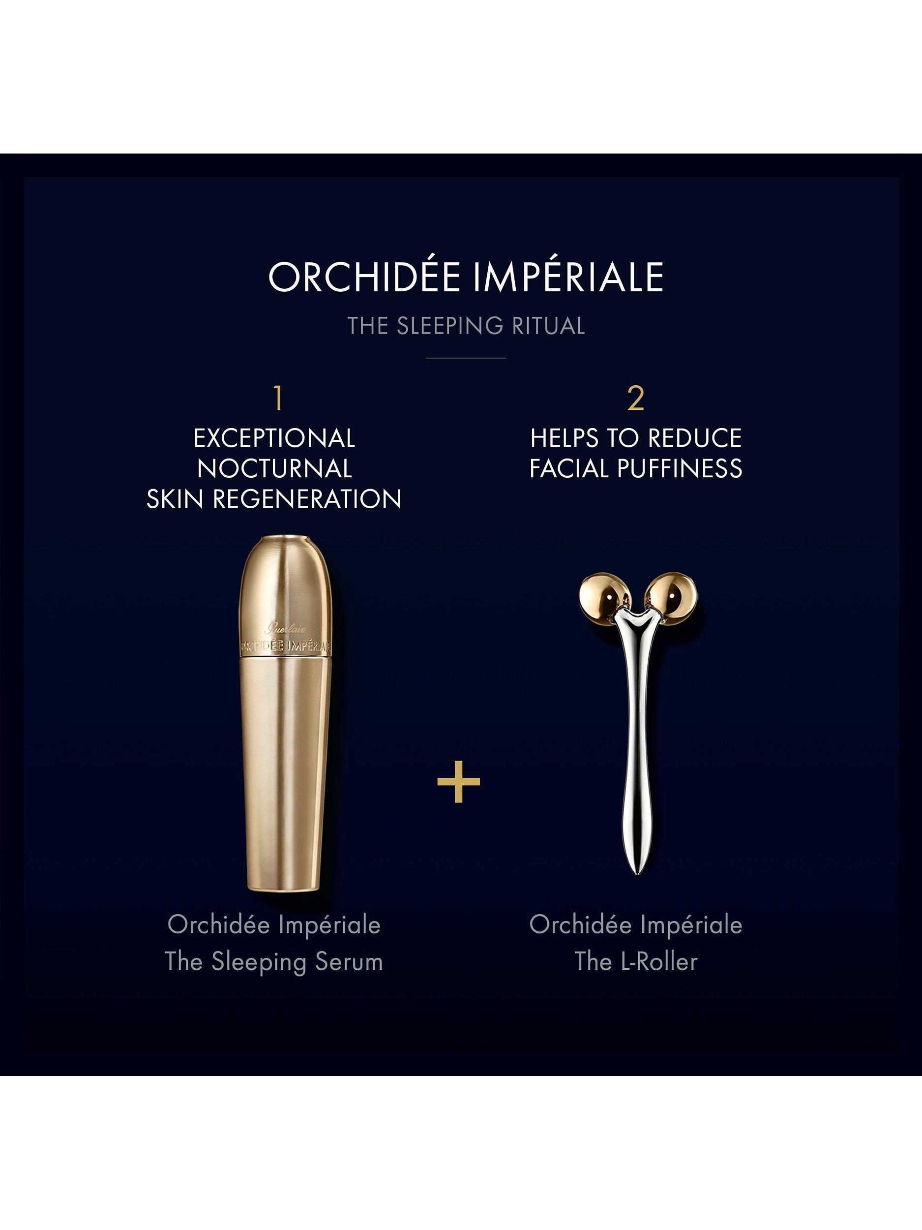 Guerlain Orchidée Impériale Sleeping Serum offers exceptional nocturnal regeneration. It targets sleep wrinkles and decongests the face. It offers the benefits of additional hours of sleep for the skin.