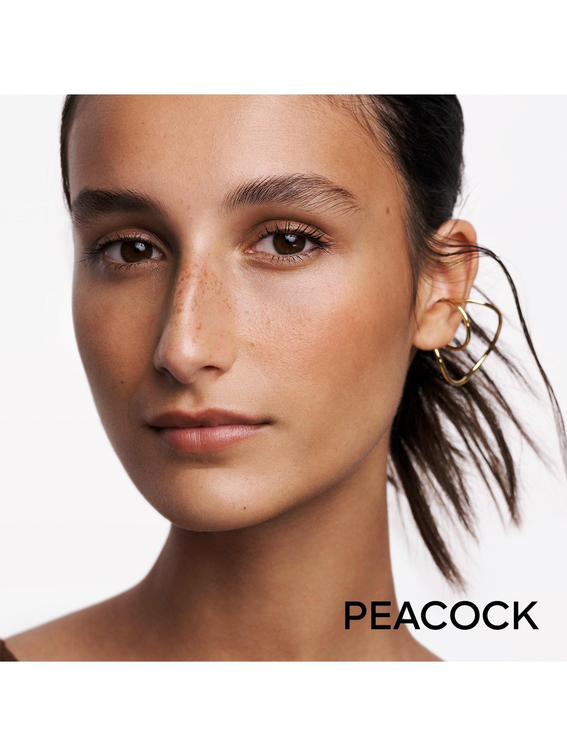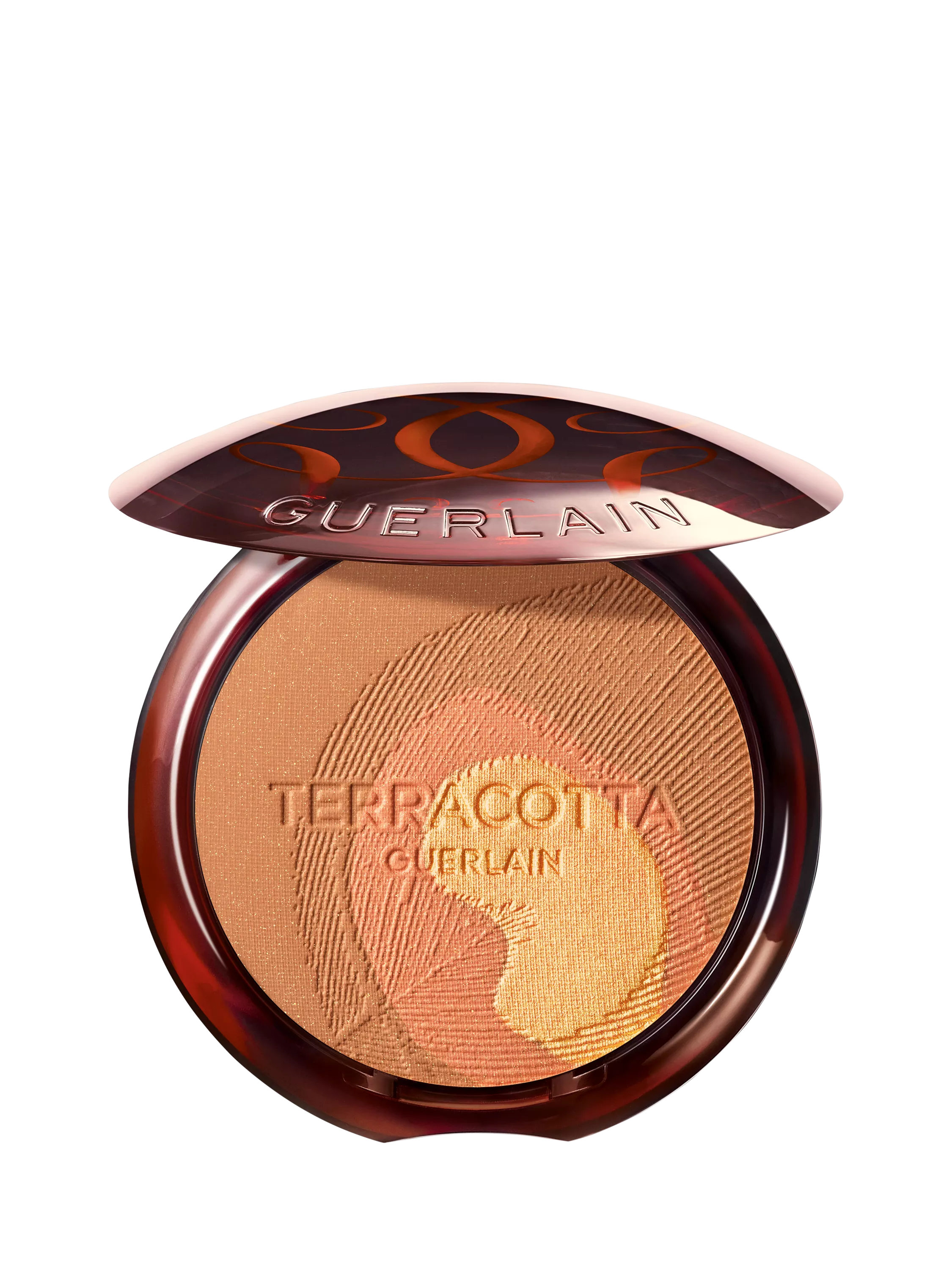The iconic healthy glow powder Terracotta 03 is adorned with a new motif, in which the blush pink of a Peacock feather is revealed under a temporary halo of golden spray.