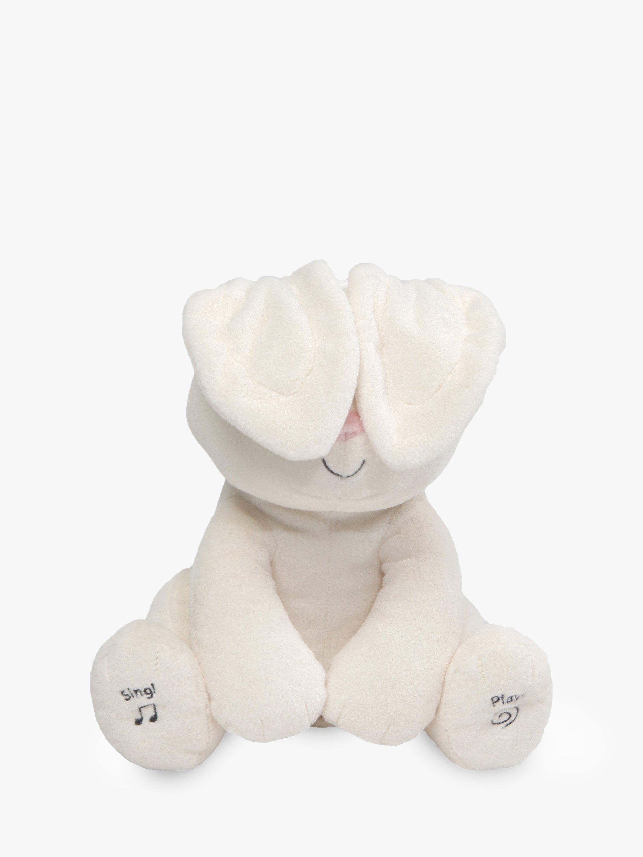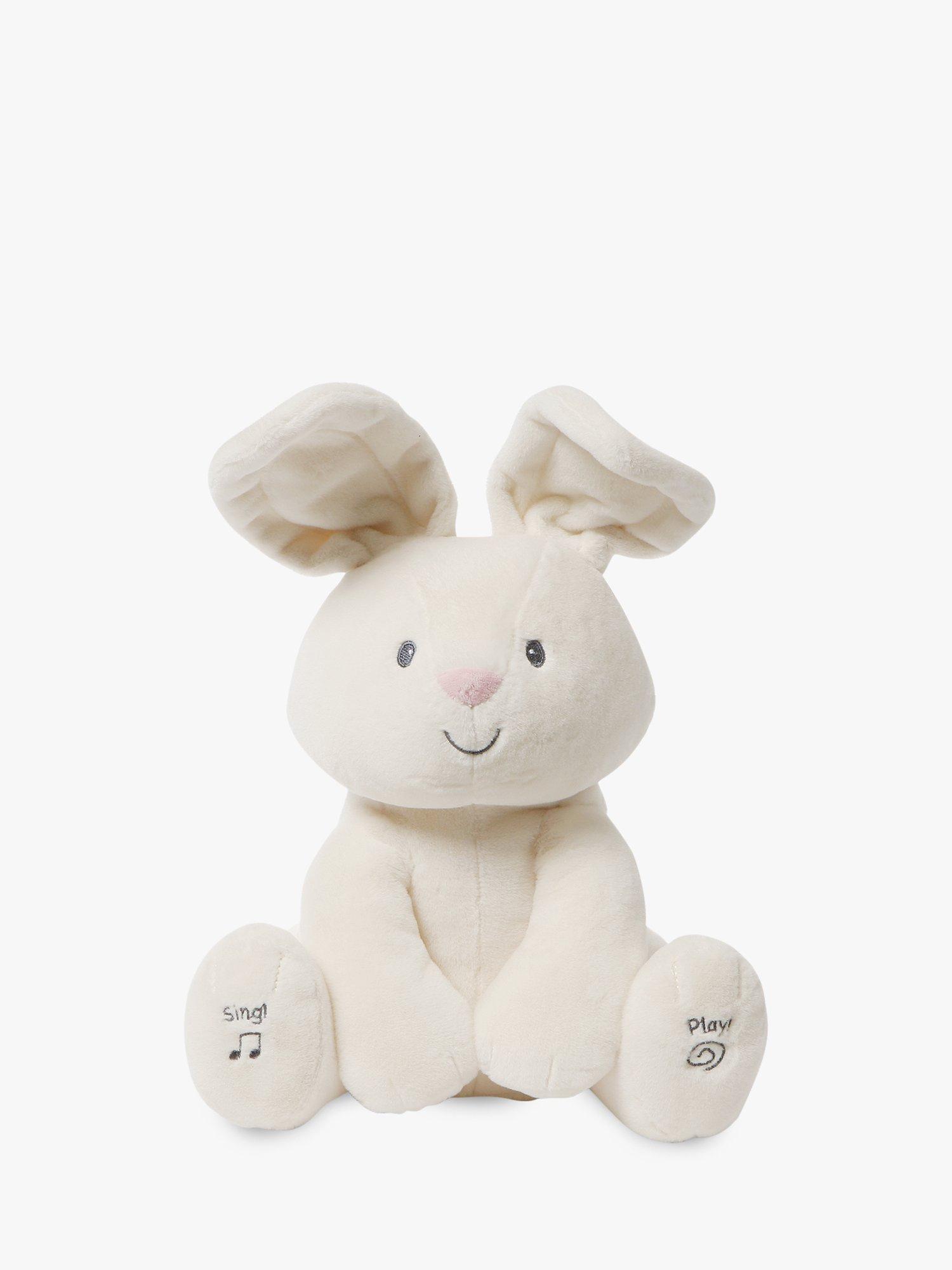 GUND is proud to present Flora a sweet, smiling bunny with two different play modes. Press the left foot to play an interactive game of peek-a-boo, and the right to hear the song 'Do Your Ears Hang Low' in a cute voice. Plush is surface washable and suitable from birth.
