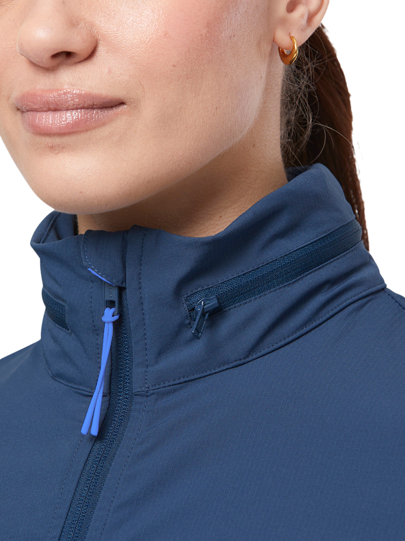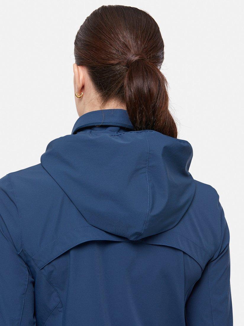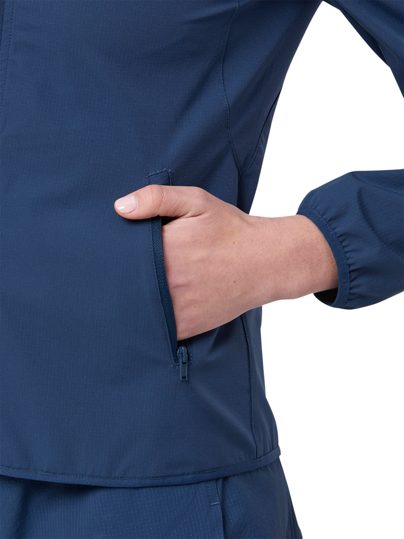 This jacket is made for running and outdoor exercise, but is equally stylish as your go-to when out and about. A woven ripstop fabric with just the right amount of stretch ensures a great fit but with plenty of room for movement. Featuring a packable hood in its collar, and built-in ventilation in the back of the jacket to keep air flowing when you're exercising, this jacket also has a chic and elegant look, with flashes of contrast colour on the zips and trims.