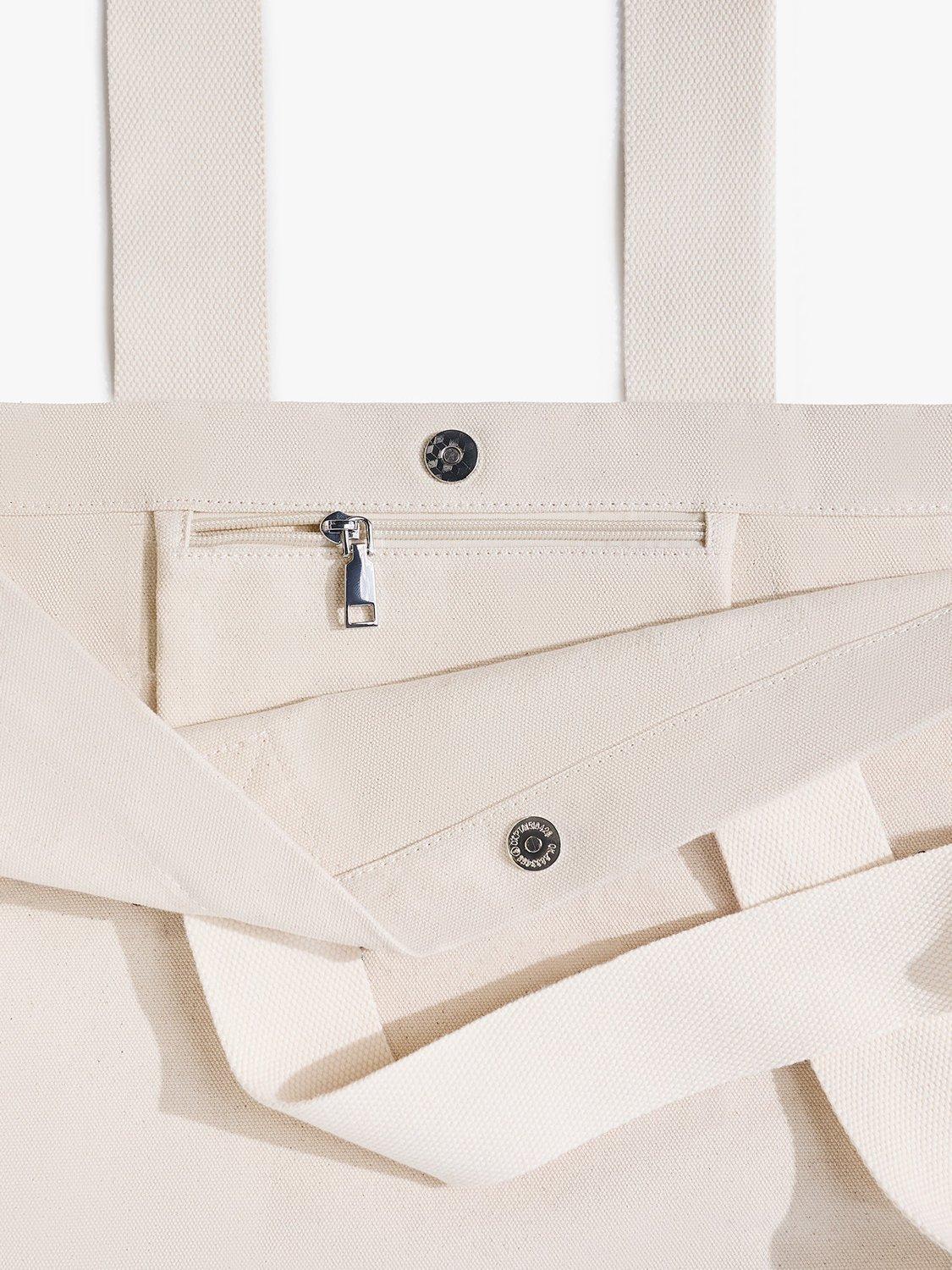 A tote bag with an internal zip pocket, an internal stud fastening, and an external front pouch pocket with metal press stud fastening.