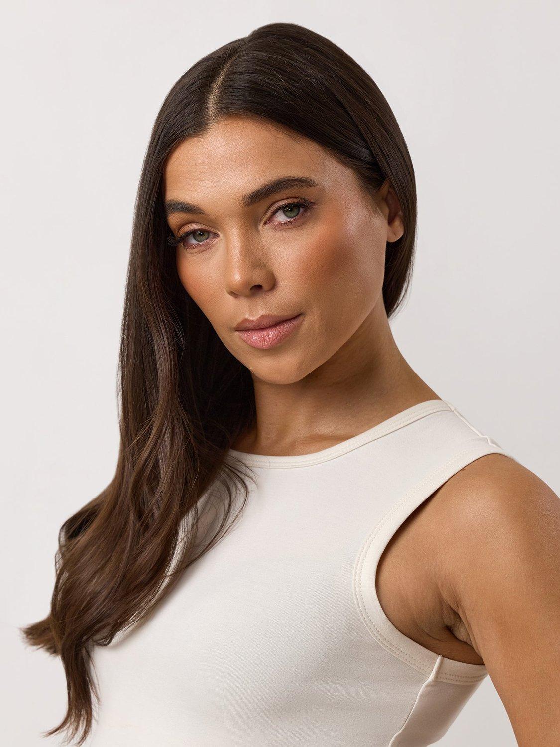 Fitted style vest top in a cropped length. Features include: square neckline, woven badge branding and soft touch, peached jersey fabric.
