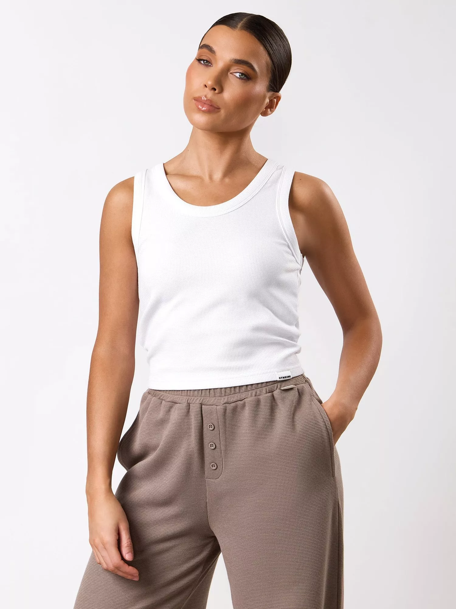 Fitted style, mid length top with a scoop neckline and premium, ultra soft textured waffle fabric.
