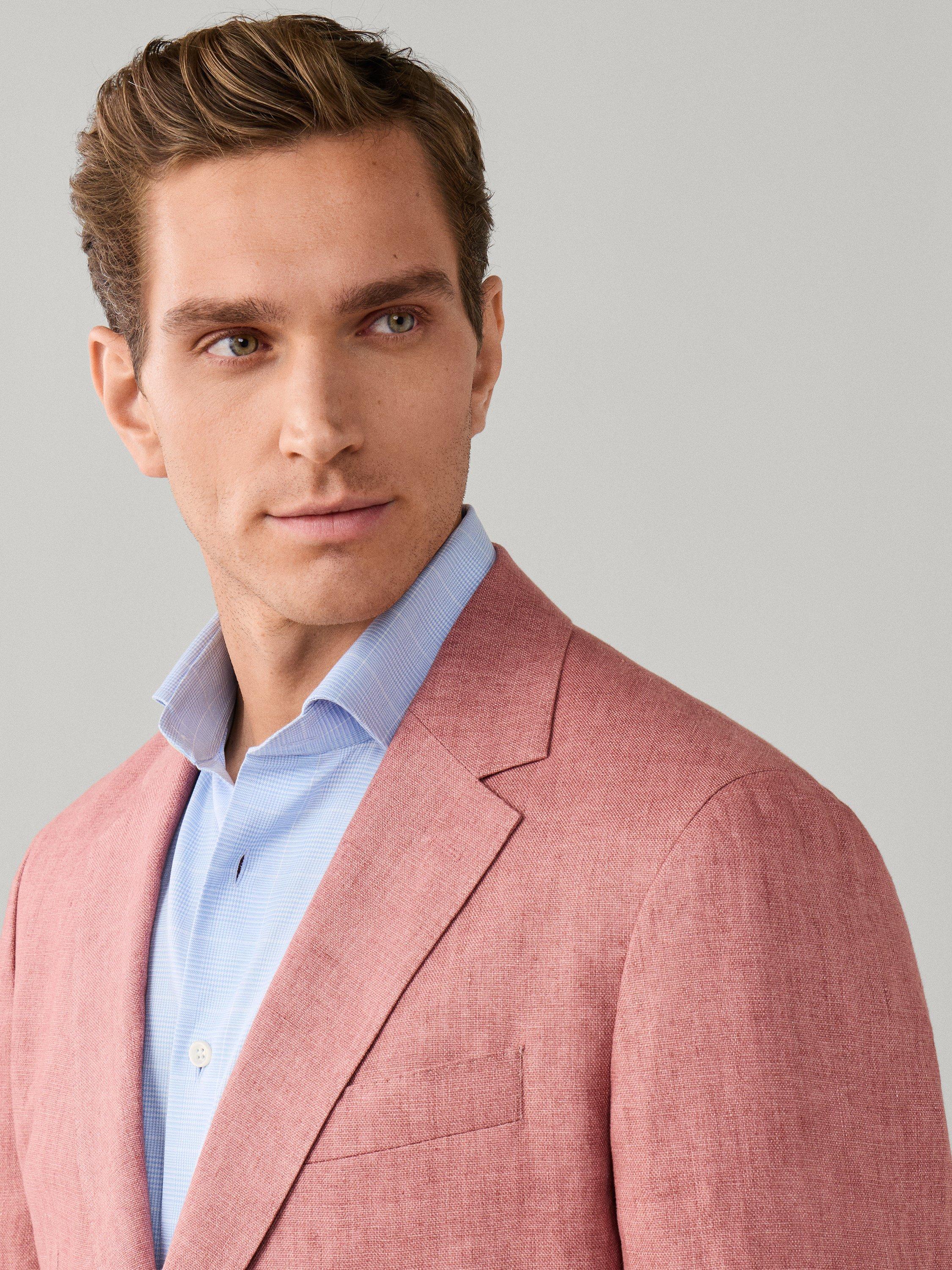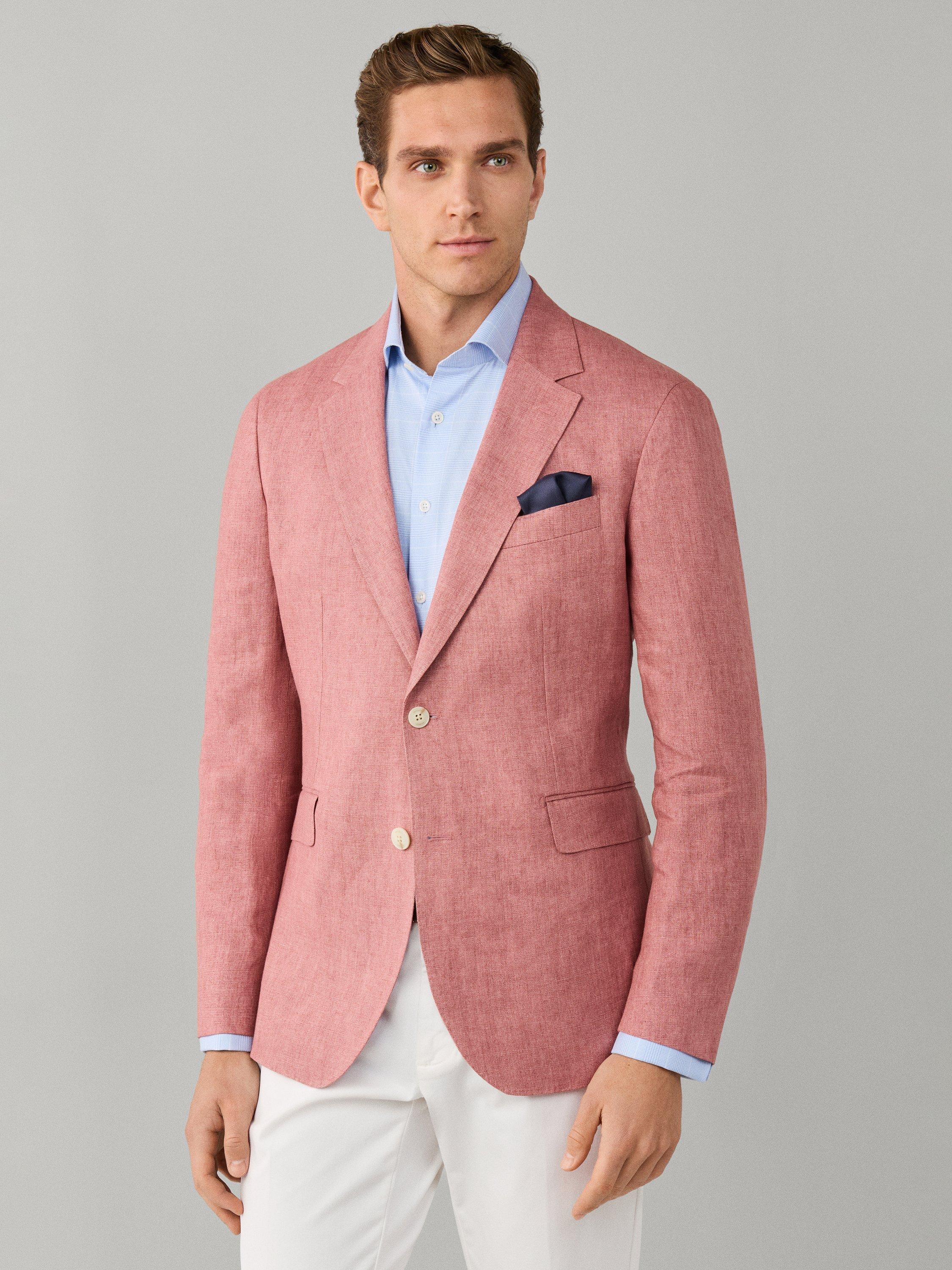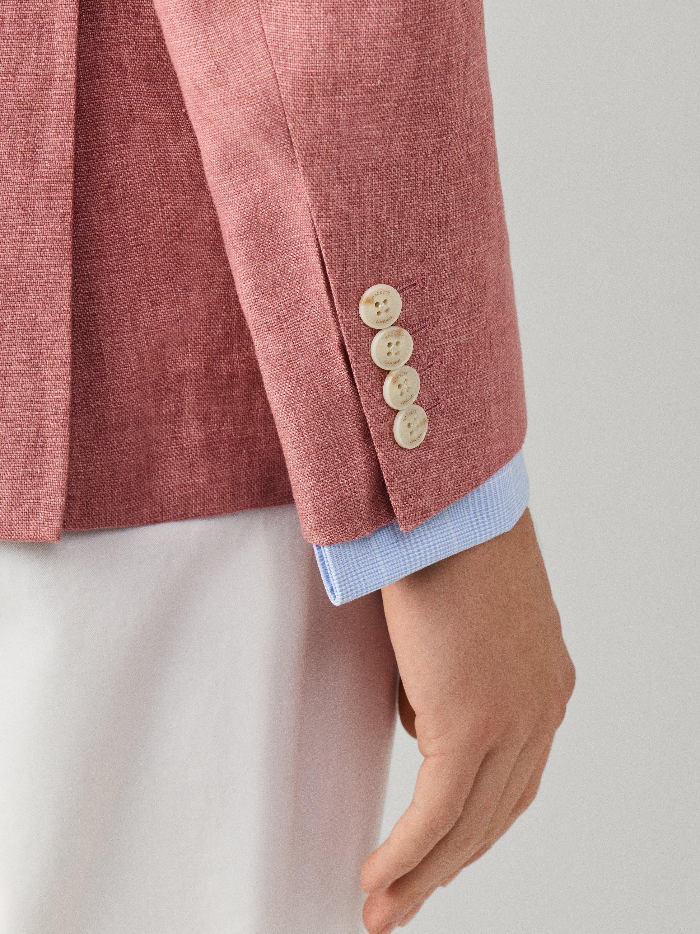 Made from lightweight and breathable linen, ideal for warm weather, this blazer is a versatile formal piece that pairs effortlessly with shirts or matching trousers for a polished look. From Hackett London, this jacket's Delavé textured weave uses a fabric woven in the finest Italian mills, ensuring premium quality. It features two buttons, a notch lapel, button cuffs and flap pockets.
