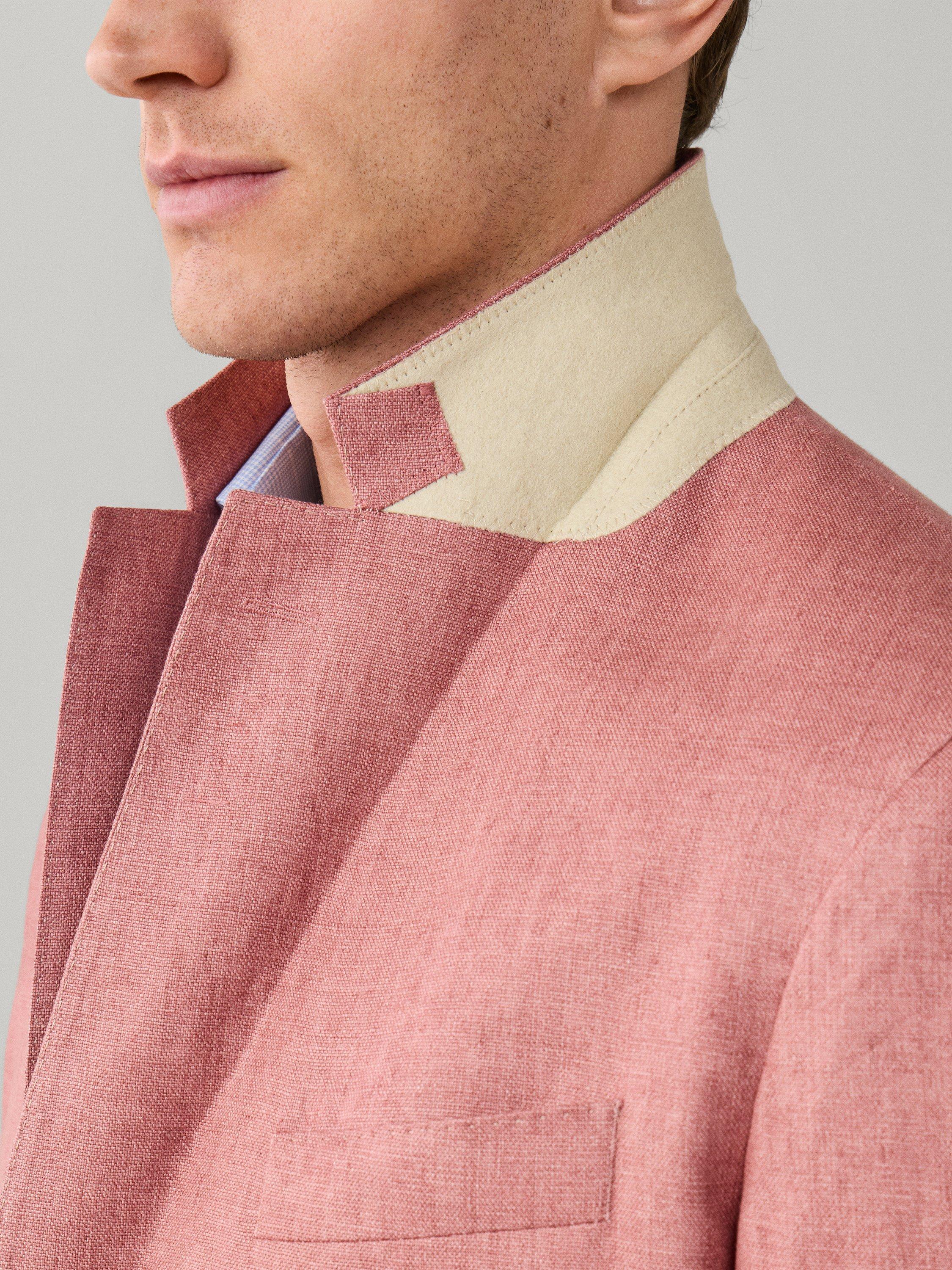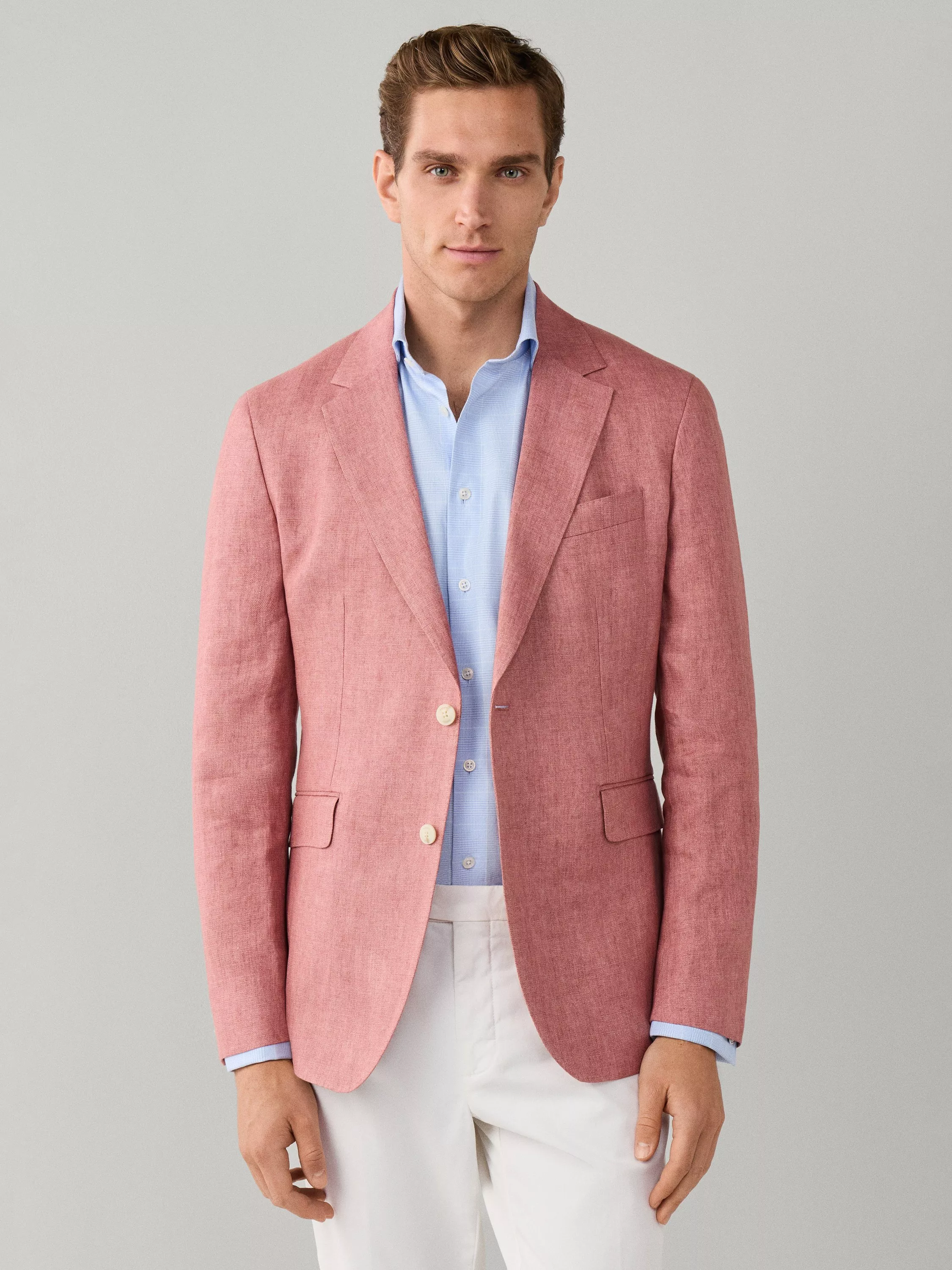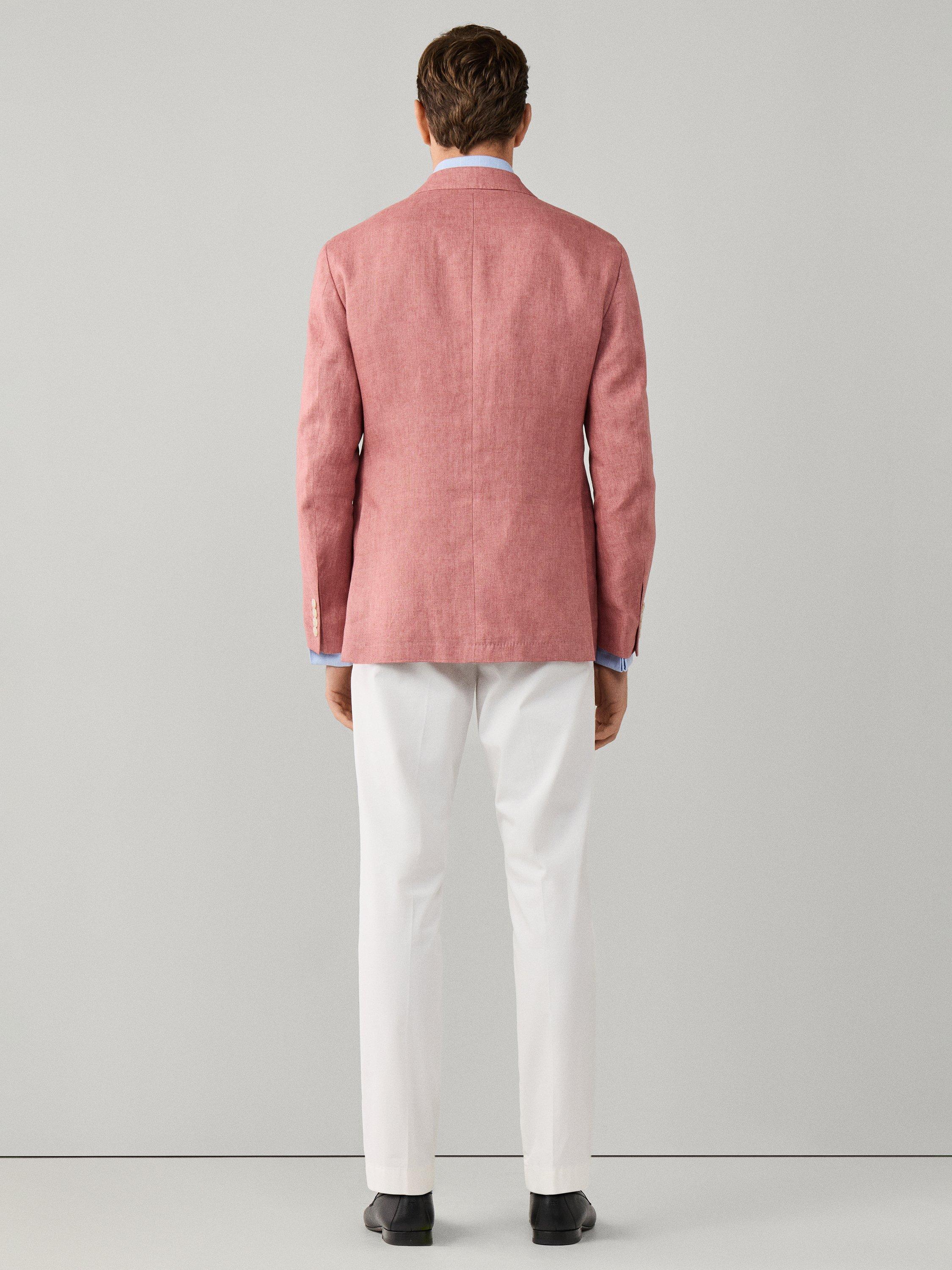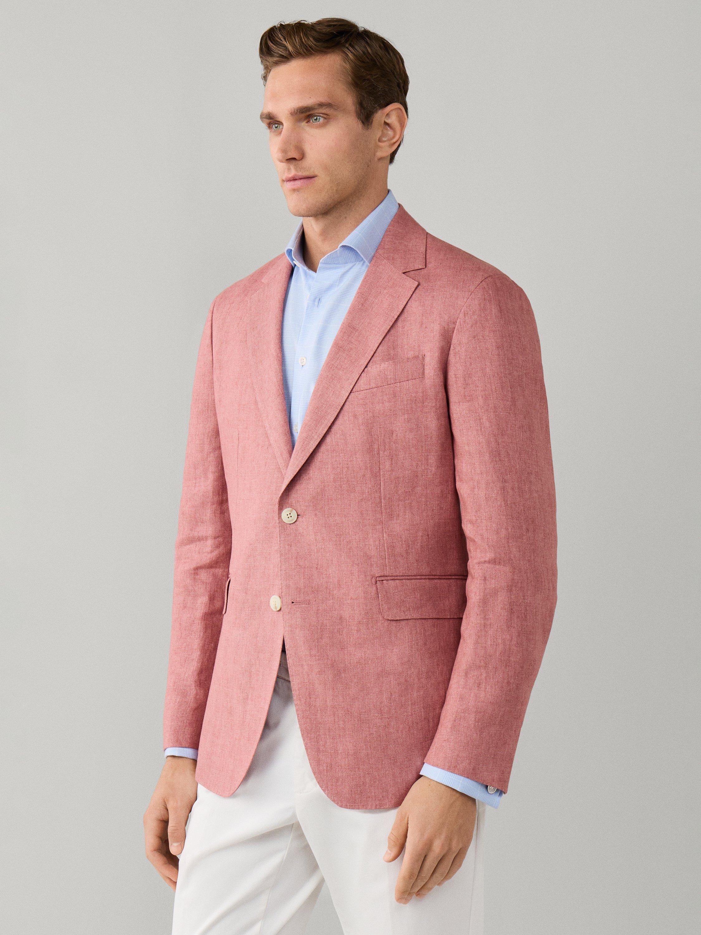 Made from lightweight and breathable linen, ideal for warm weather, this blazer is a versatile formal piece that pairs effortlessly with shirts or matching trousers for a polished look. From Hackett London, this jacket's Delavé textured weave uses a fabric woven in the finest Italian mills, ensuring premium quality. It features two buttons, a notch lapel, button cuffs and flap pockets.