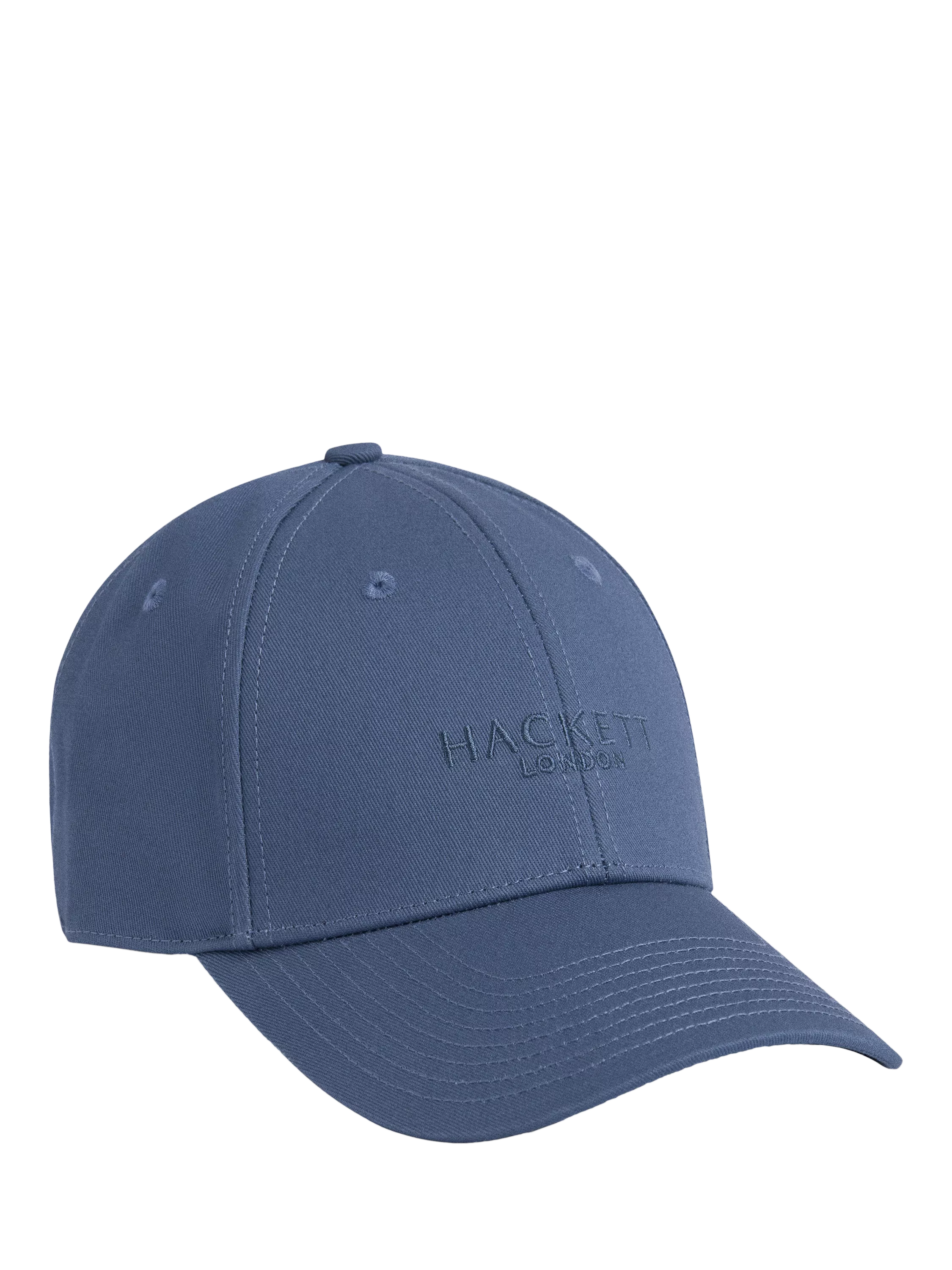 Cotton twill fabric baseball cap with a curved visor with stitching detail. Ventilation eyelets and an adjustable leather strap with metal buckle. Stitching detail on strap. Tone-on-tone HACKETT logo embroidered on front panel.