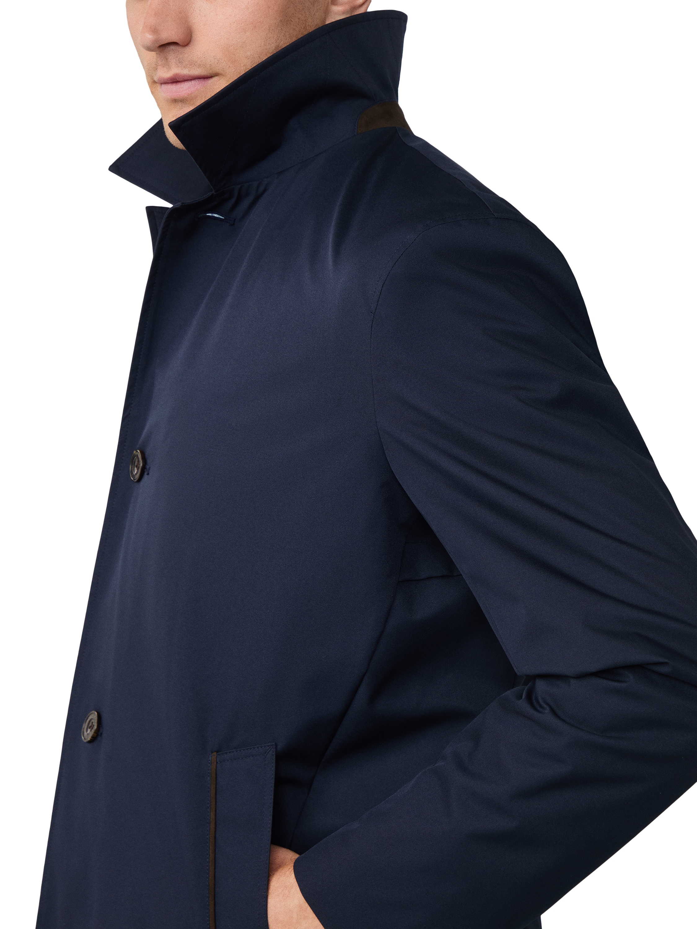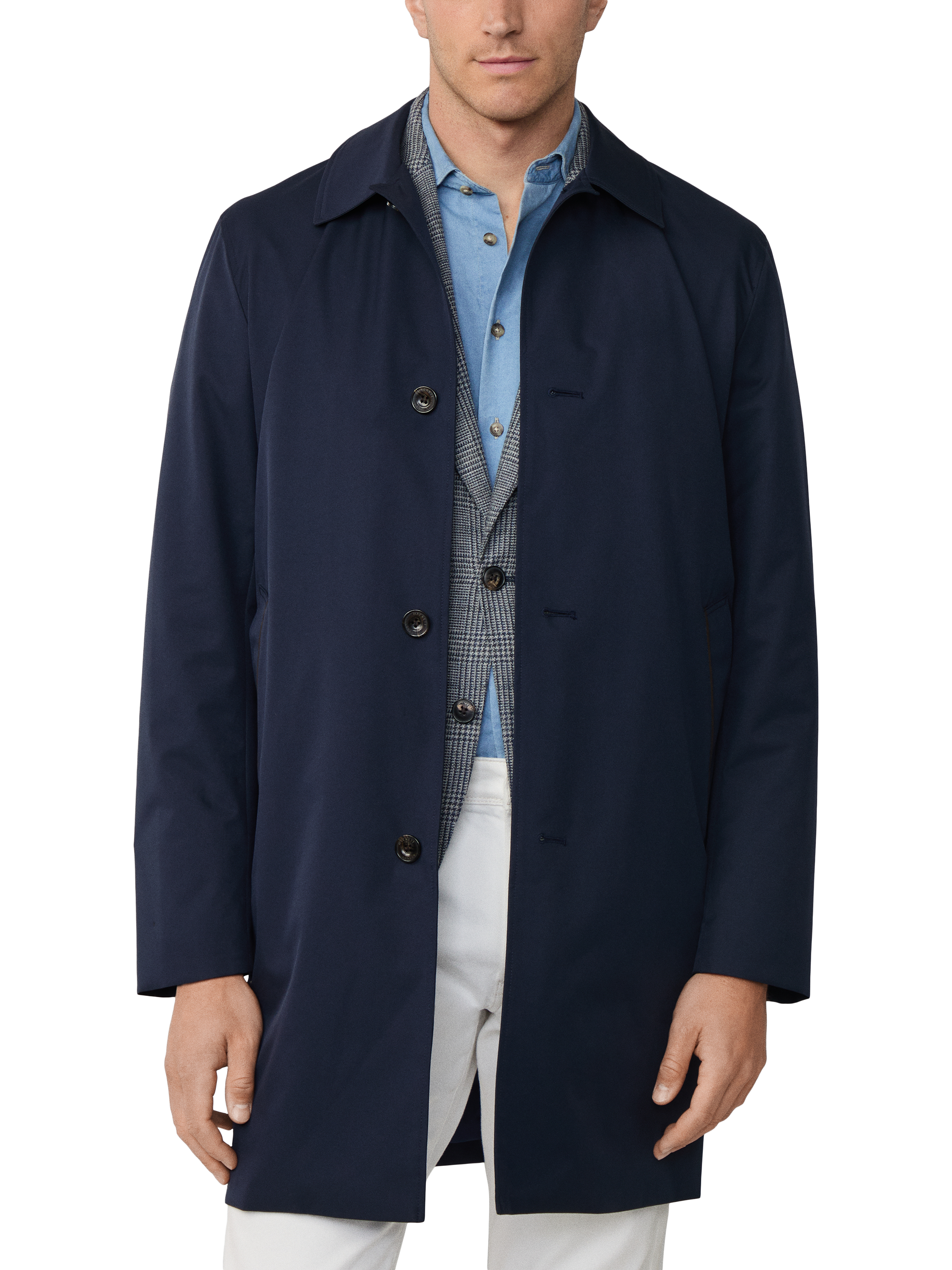 This four-button mac from Hackett London has a water-resistant finish with a British tattersal internal check. Also includes a suede trim on the outer collar stand and pocket jets. It's completed with minimalist branding on the back collar for a polished finish.