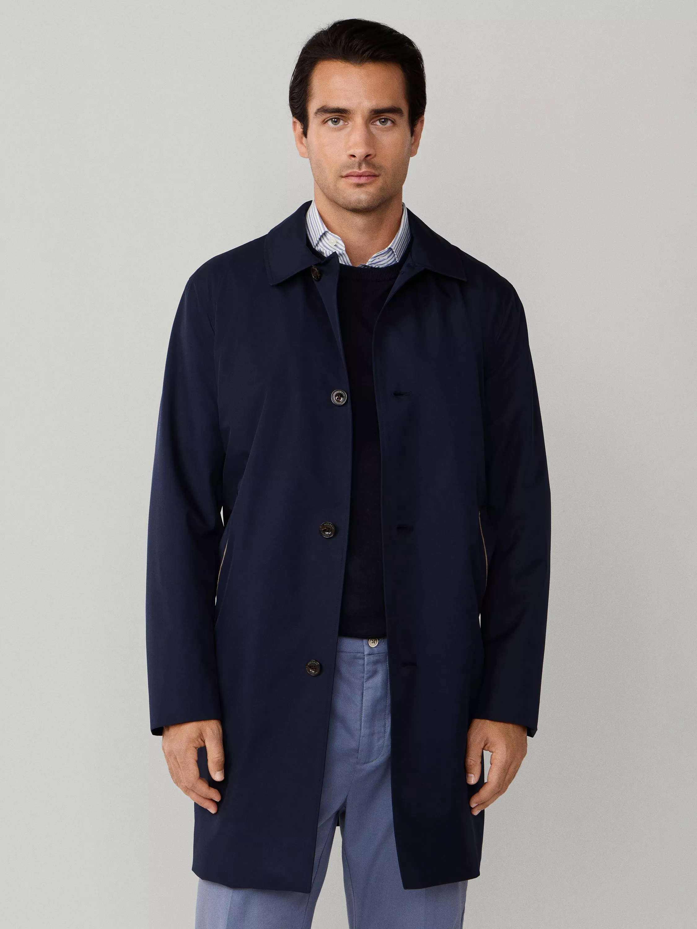 Whatever the weather, this four button mac keeps you dry while feeling light and comfortable. It blends timeless style with practical features, with a water-resistant finish and a British tattersall internal check.