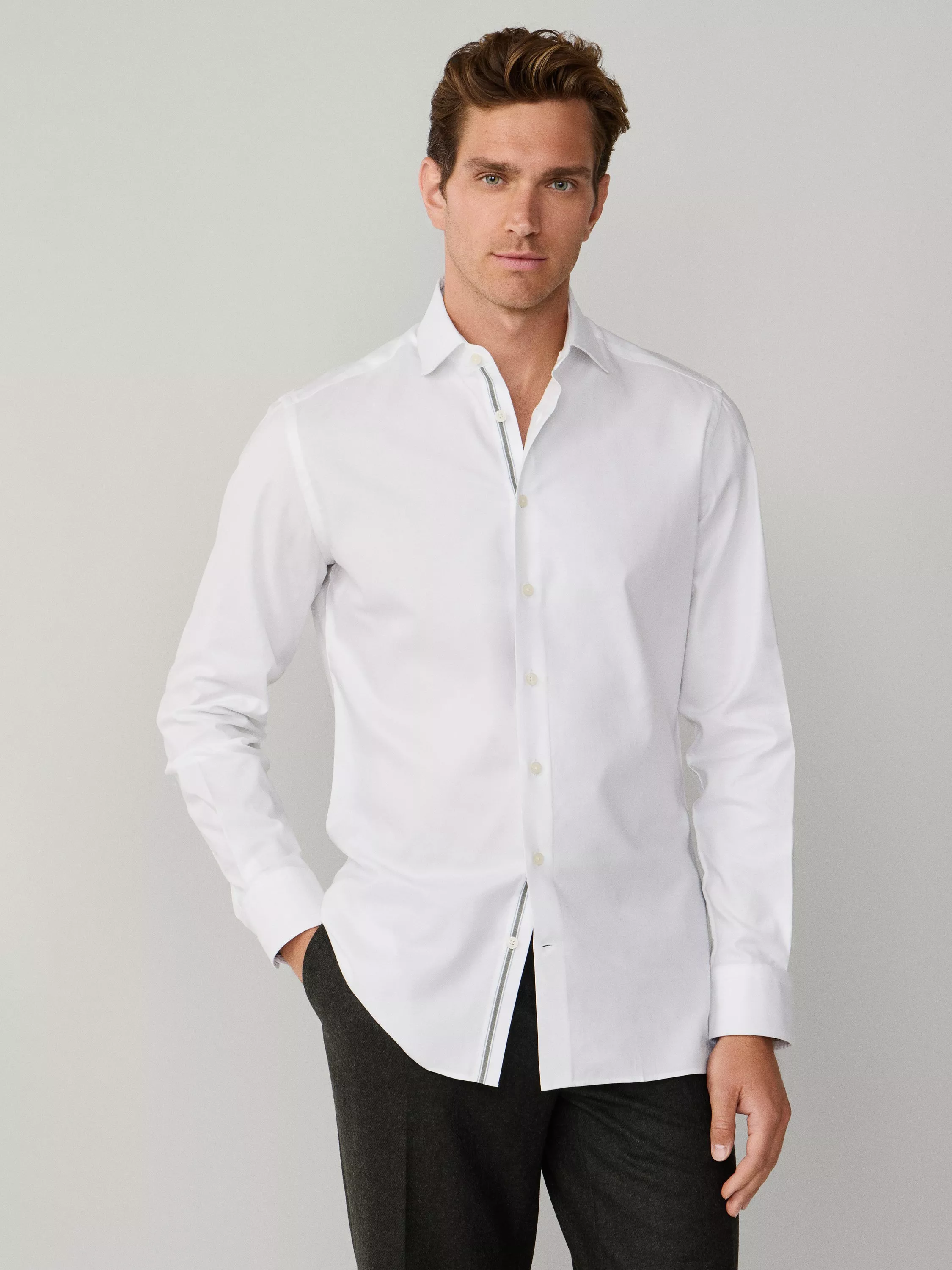 Designed for those who lead the pack, the French placket provides a cleaner, more formal aesthetic. The unexpected detail is found in the contrast woven stripes on the placket, inside collar, and cuffs, which offer a refined, subtle lift. This is a shirt that speaks with intelligence and expertise, proving that elevated style is essential for the modern professional.