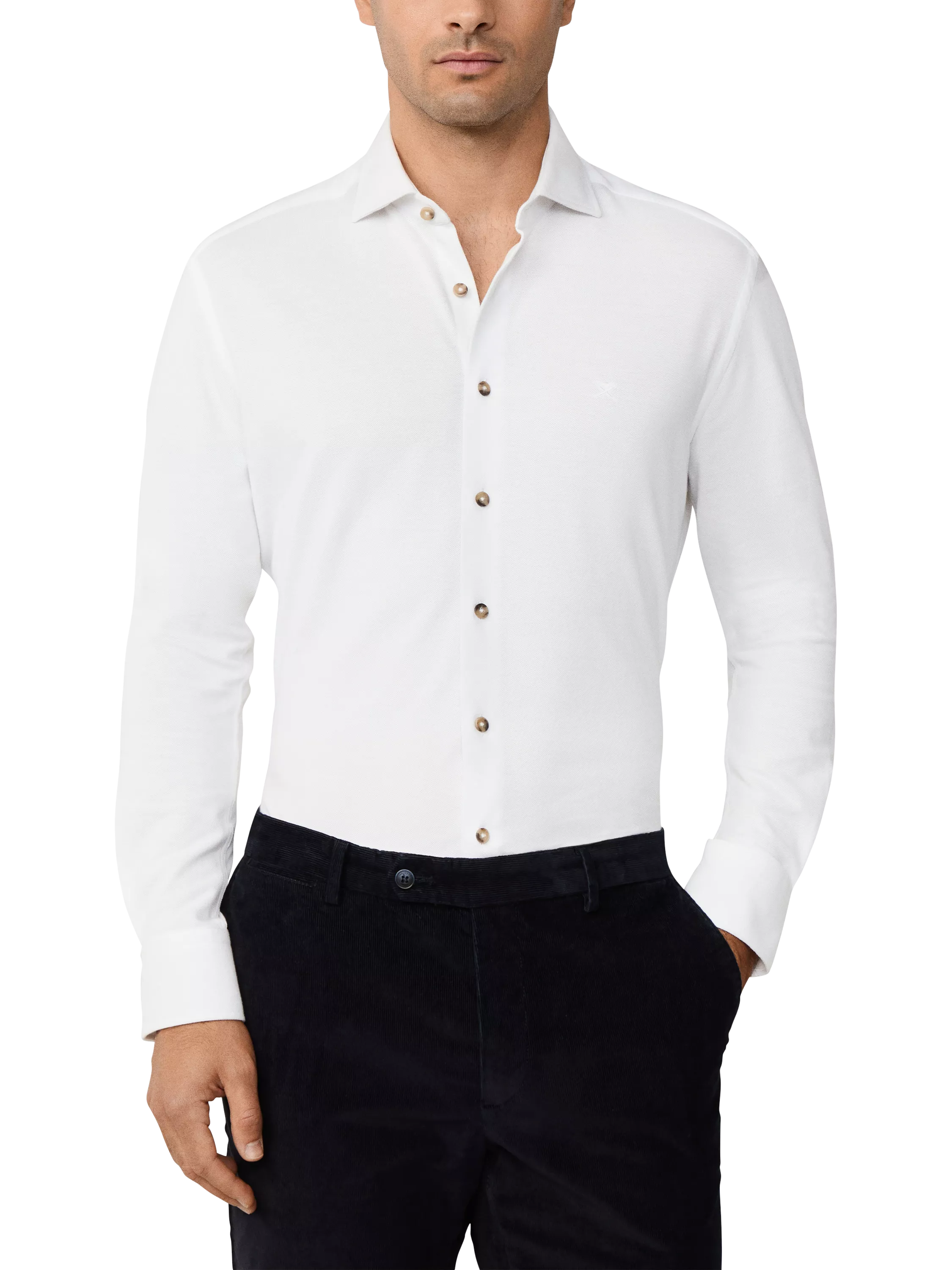 Cut to a tailored design for a sharp, structured look, this smart shirt is crafted from jersey pique fabric, providing warmth and comfort throughout winter. Features a Kent cutaway collar, a hallmark of Hackett’s classic shirt styles, while the French placket ensures a clean, modern finish and tonal chest embroidery adds a discreet brand detail.