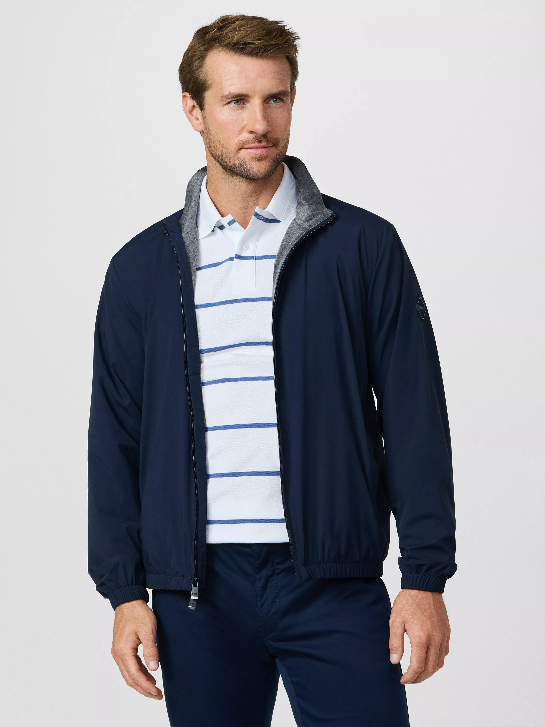 A regular-cut driver blouson jacket by Hackett London. Designed with comfortable four-way stretch and a contrast melange lining, the zip fastening makes pulling on quick and easy.