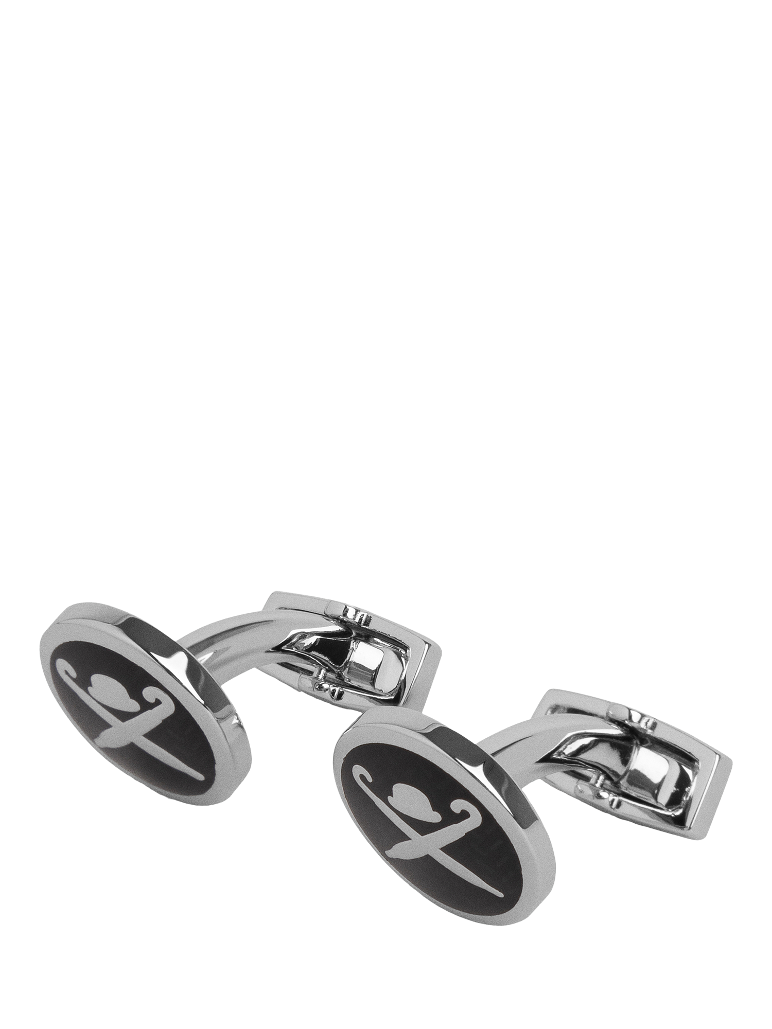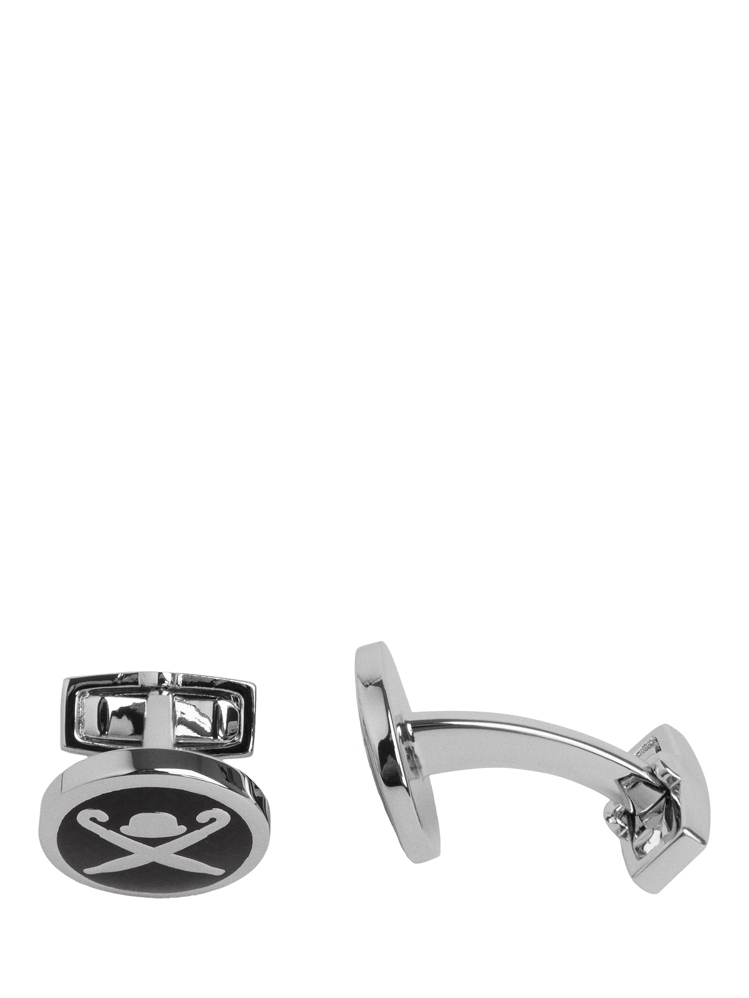 These handmade cufflinks are crafted from rhodium-plated metal and include: a logo design, enamelled finish on the button and a hinged bezel with branded engraving.
