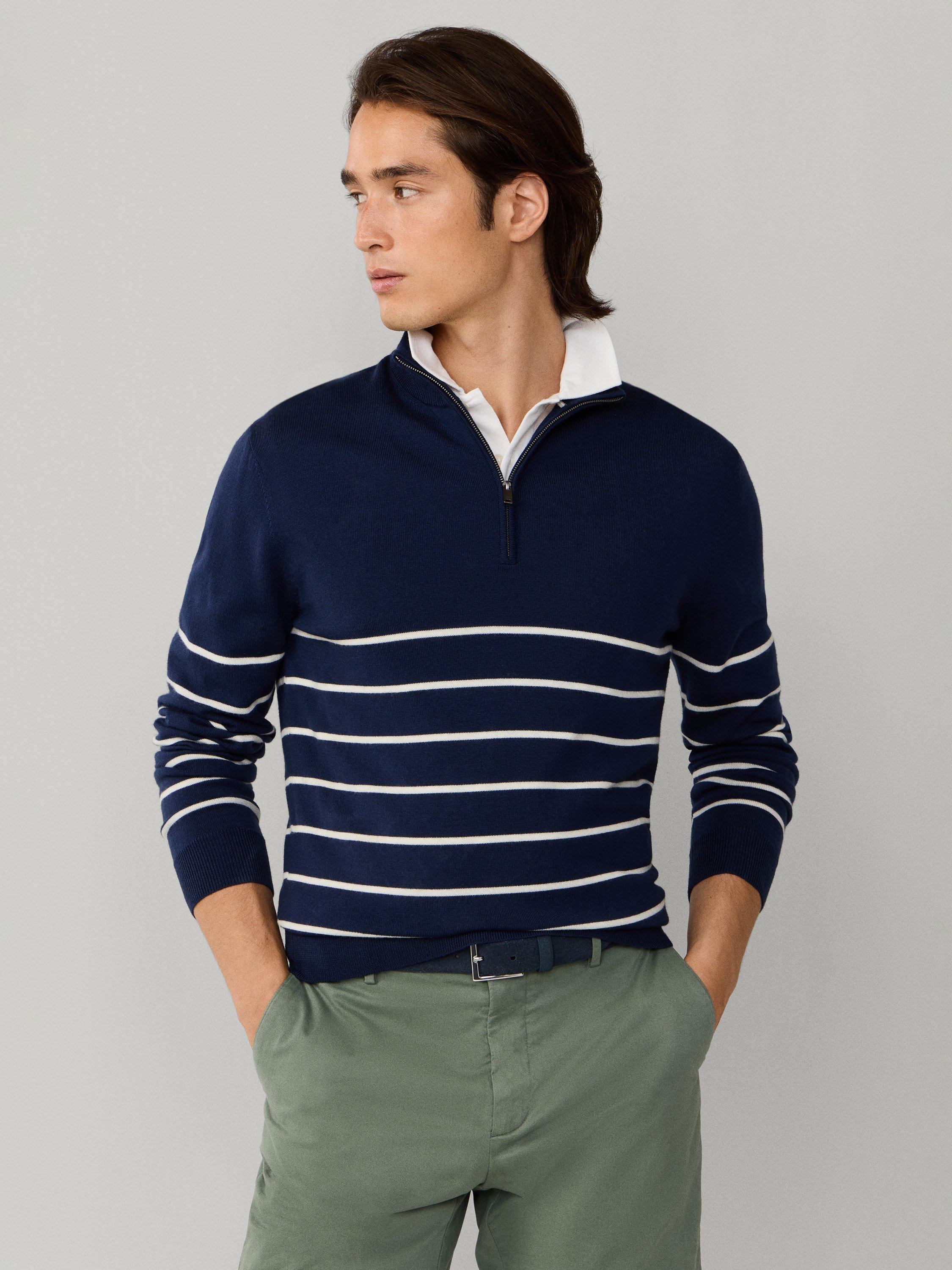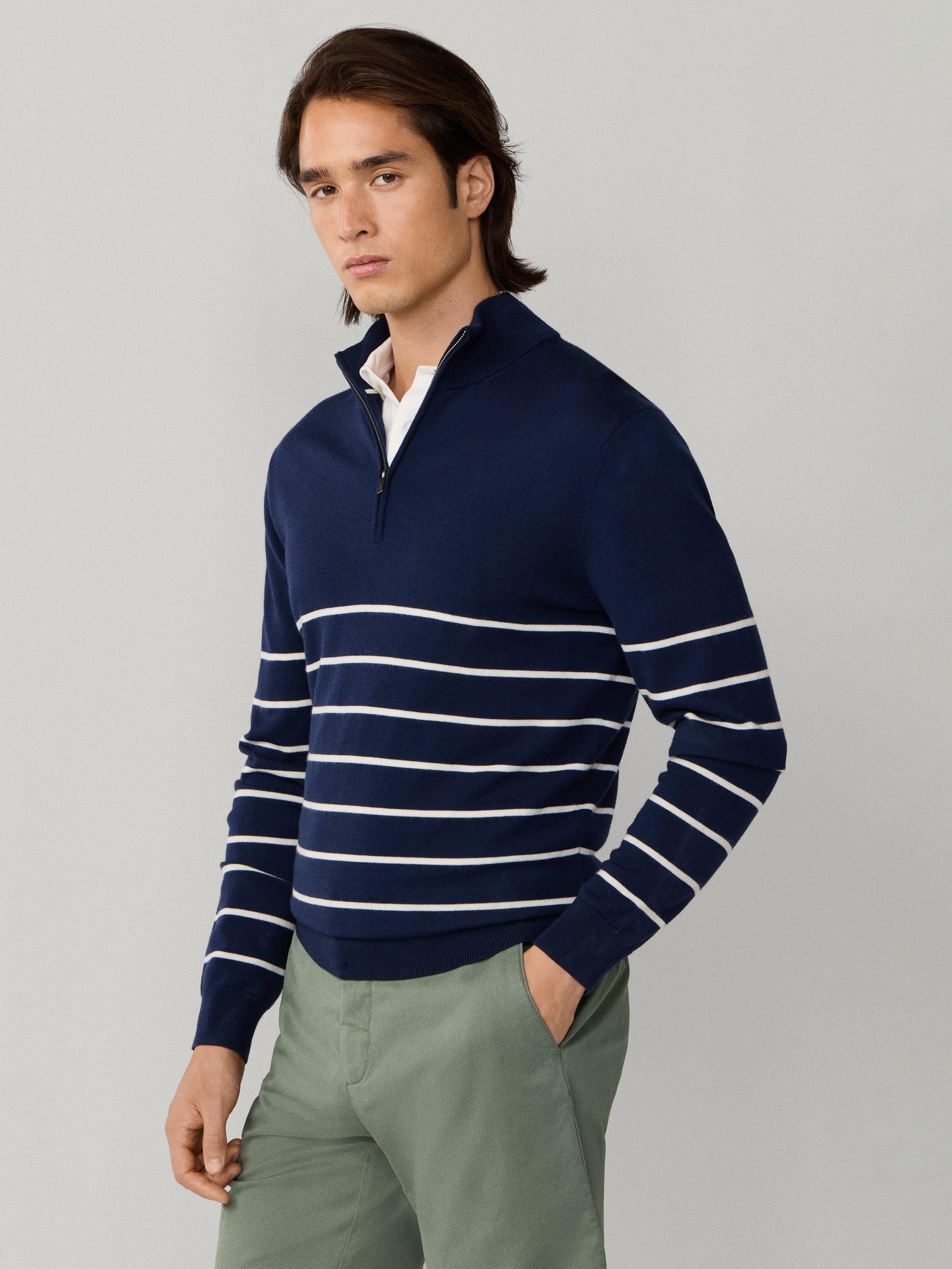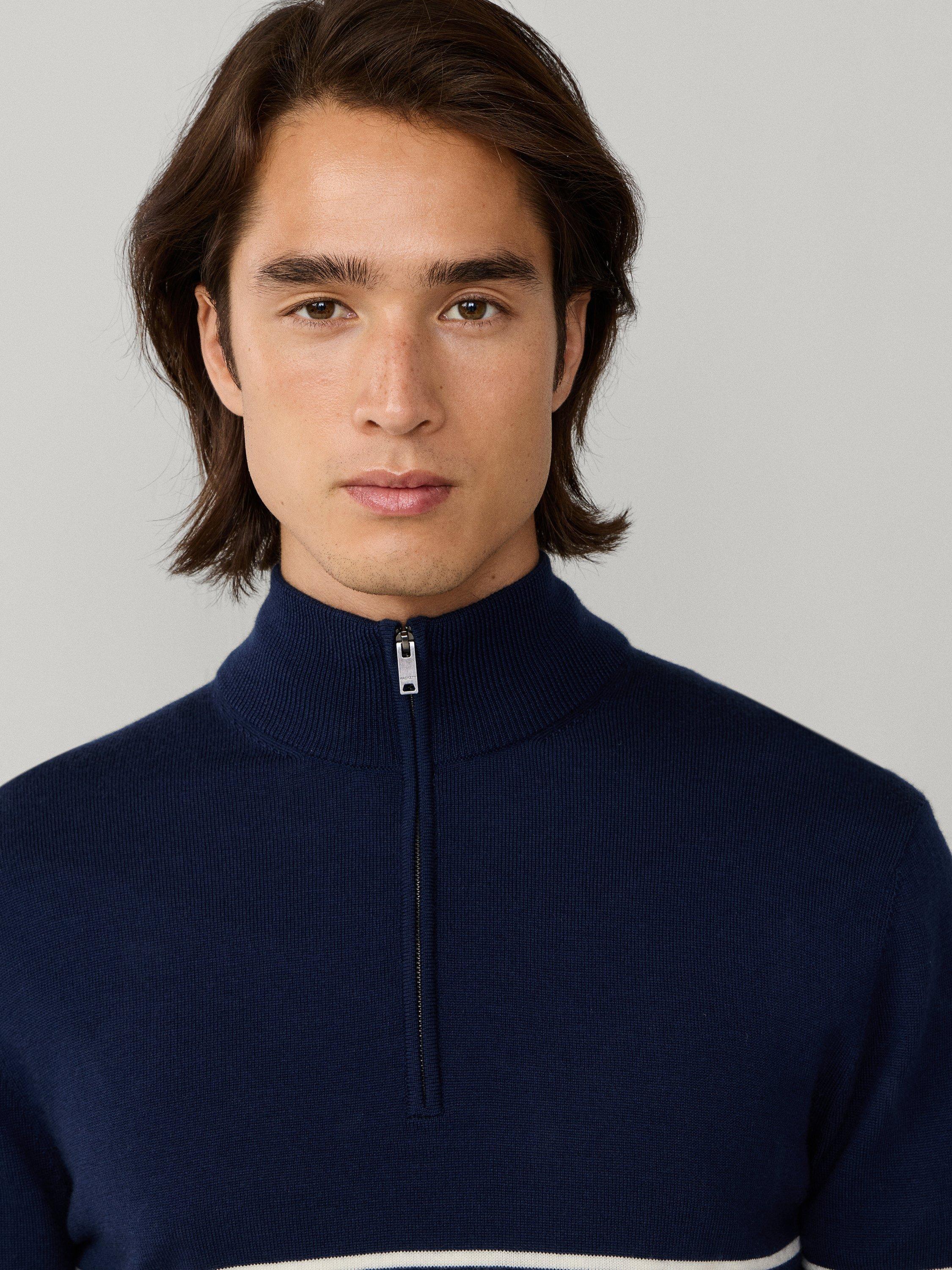 An everyday Hackett London half-zip neck jumper. The soft merino wool keeps you comfortable, while sharp stripes add a clever twist to any look.