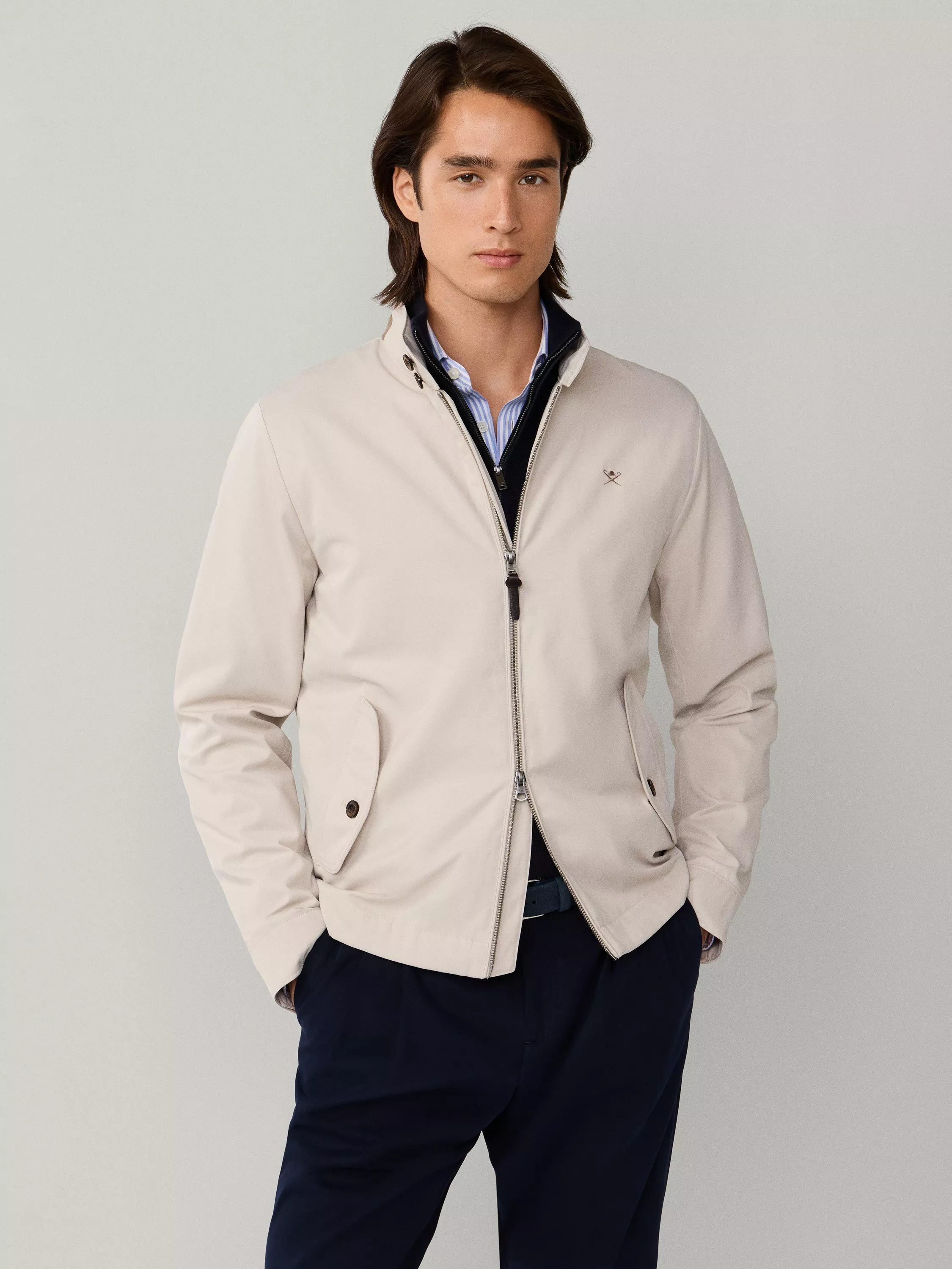 A regular-fit Harrington jacket by Hackett London. Its dual zip fastening and subtle chest logo add a sharp finish, finished with adjustable cuffs and welt pockets making it practical for your daily plans.