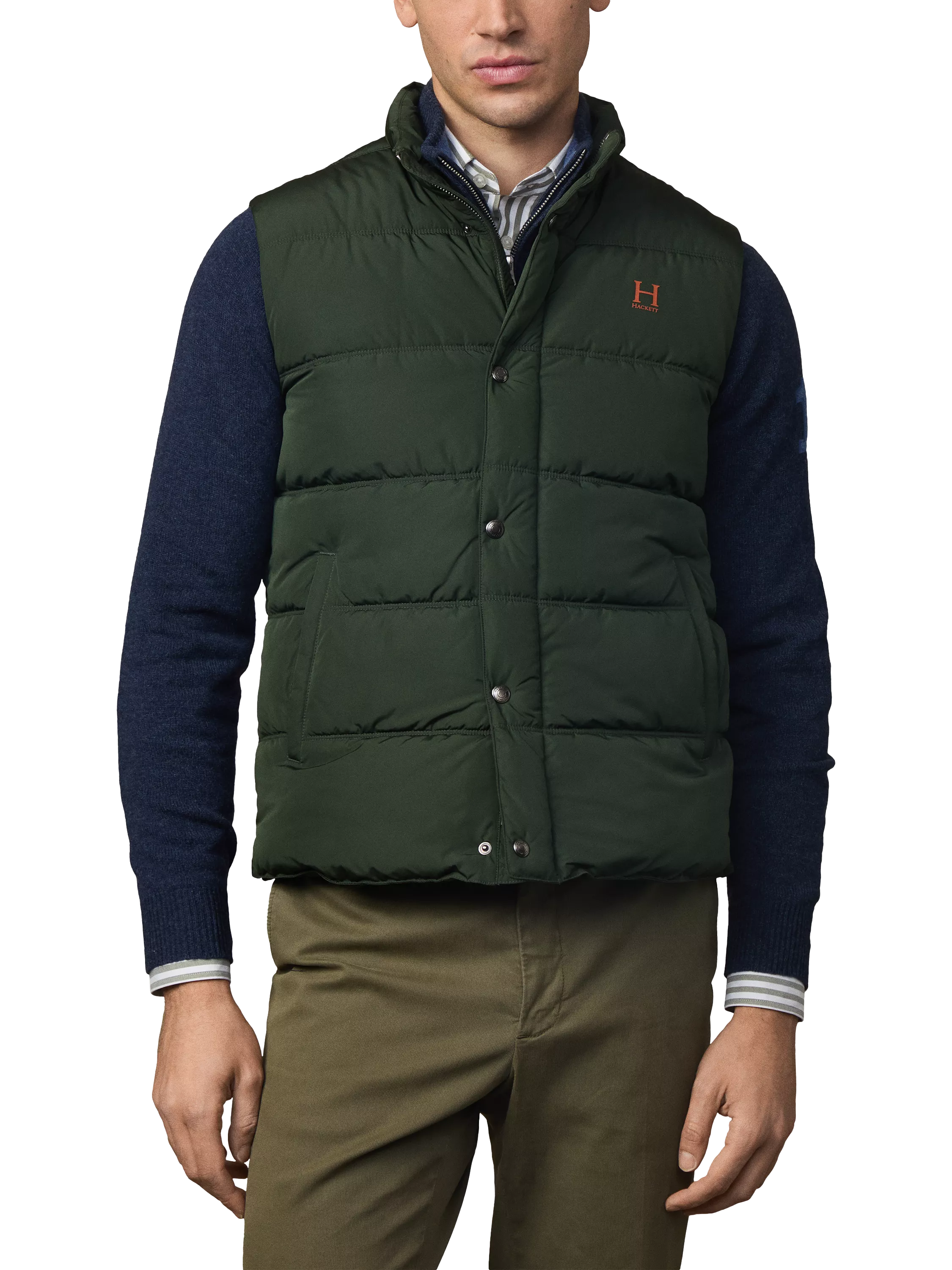 The Hackett Heritage gilet takes inspiration from the brand's archives, bringing a classic design into the modern day. The baffled, quilted body has a concealed zip and snap fastening, while a contrasting internal lining adds a subtle design detail. A printed logo on the chest gives it a modern, branded finish.