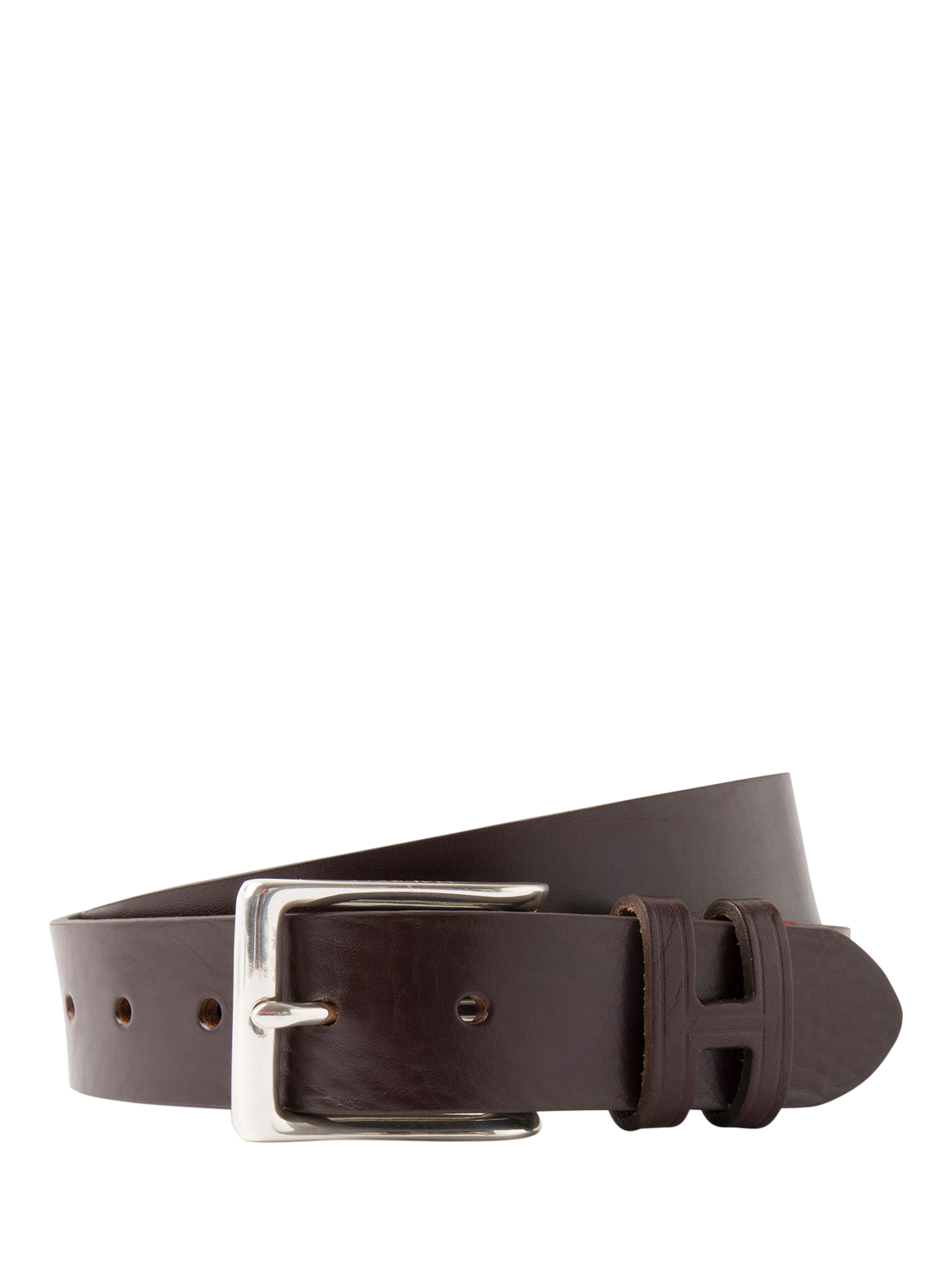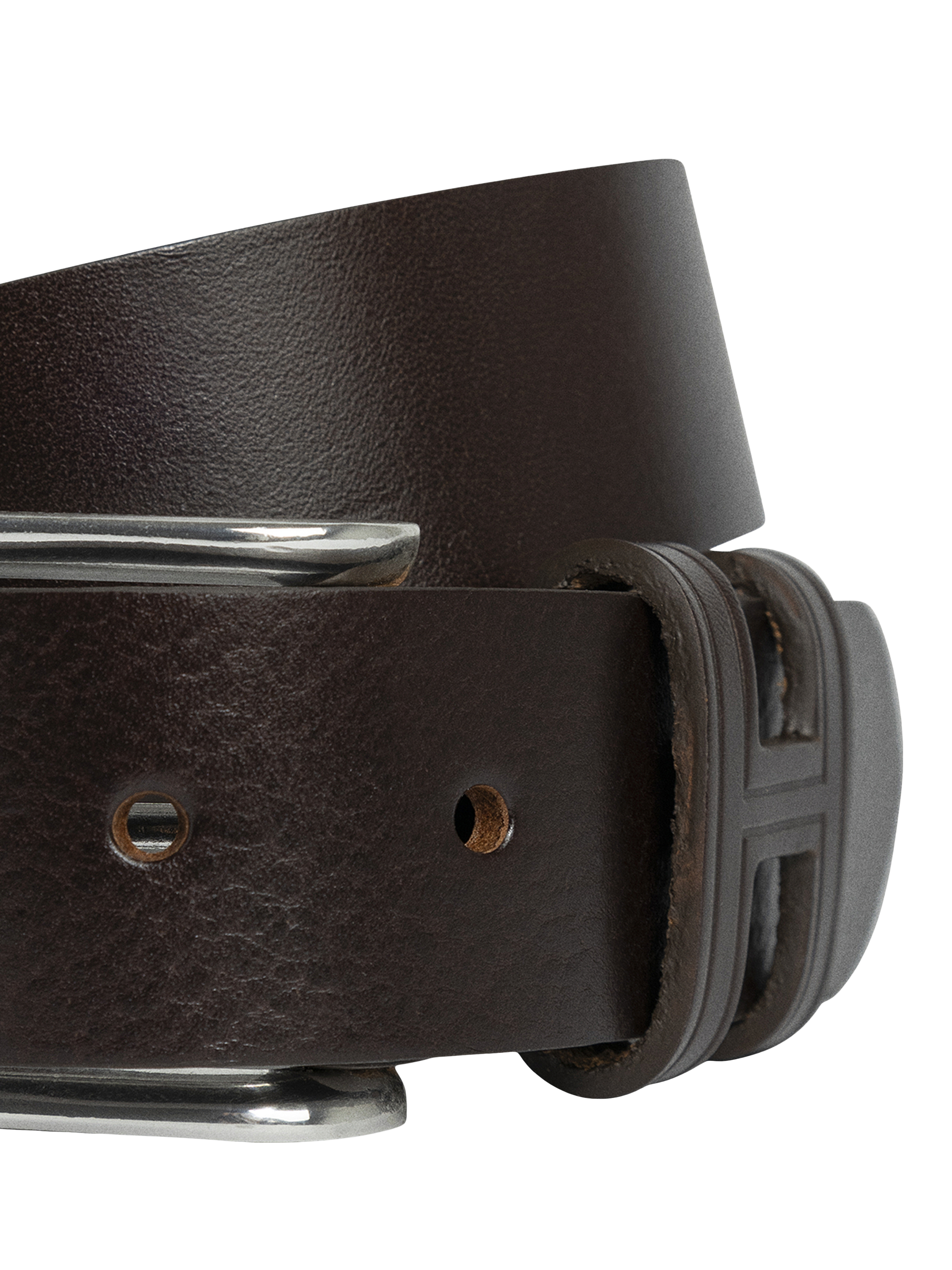 A grainy leather textured belt made from cowhide with a solid rectangular buckle and leather loop in an H monogram shape - made in England.