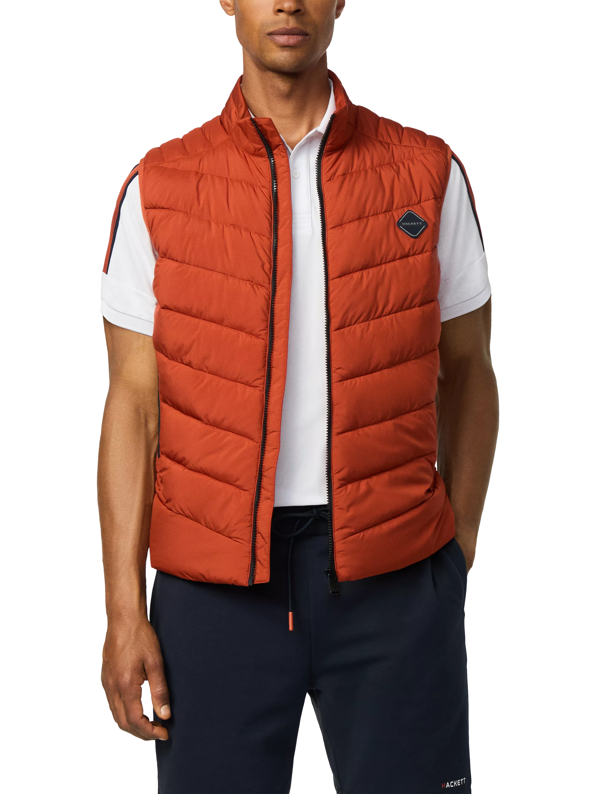 Drawing on a sporting aesthetic, this lightweight bonded gilet from Hackett Sport is designed for versatility. Moto-inspired stitch channels on the shoulders and sides give it a dynamic feel, while the gunmetal zip ends and Hackett Sport diamond badge on the chest add a premium finish.