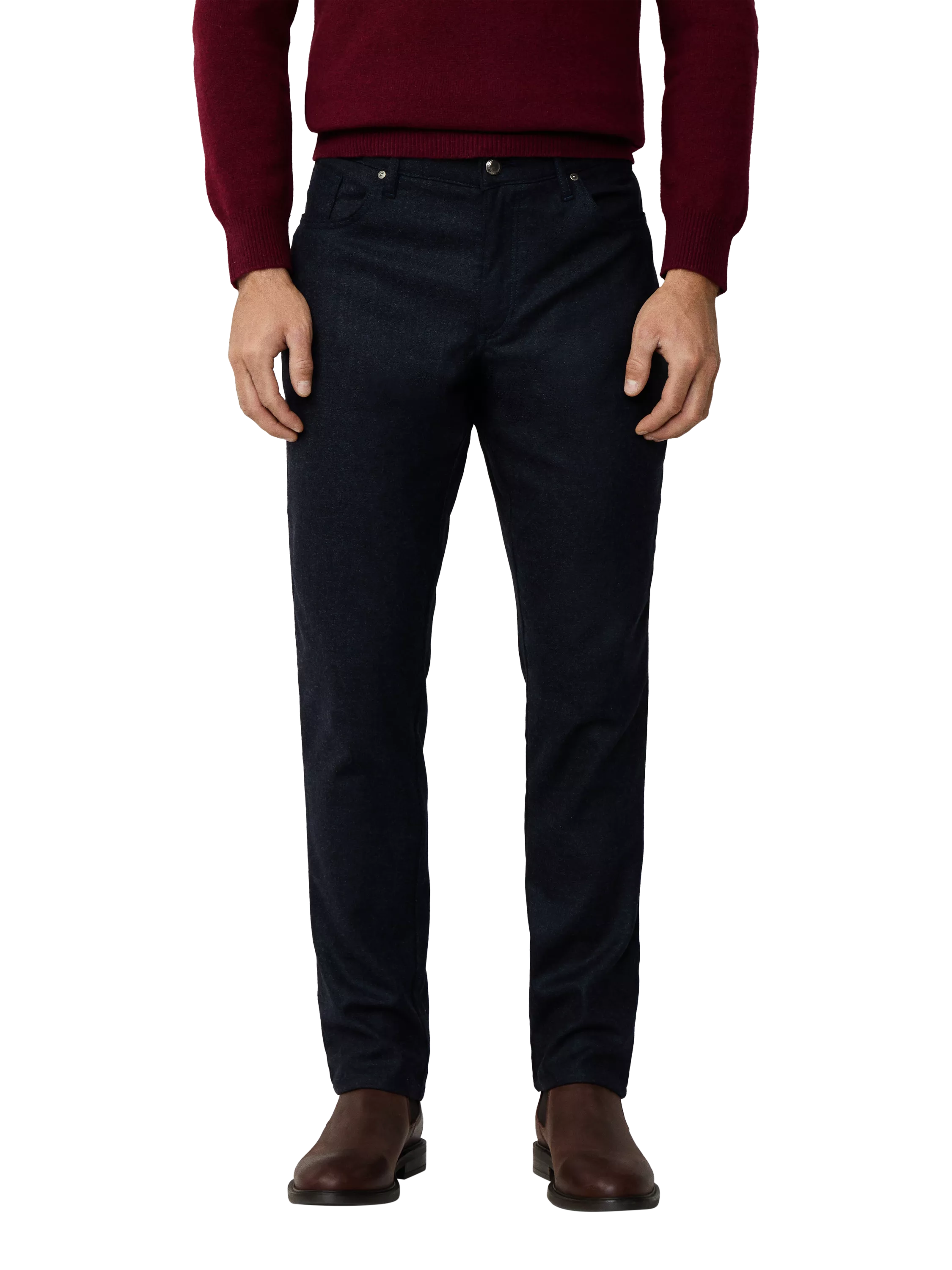 Hackett London- Regular Fit Trinity 5 Pocket trousers. Features belt loops, zip fly, embroidered logo on the front coin pocket and a branded back leather patch. Made from an Italian wool and cashmere blend. British salt and pepper design.