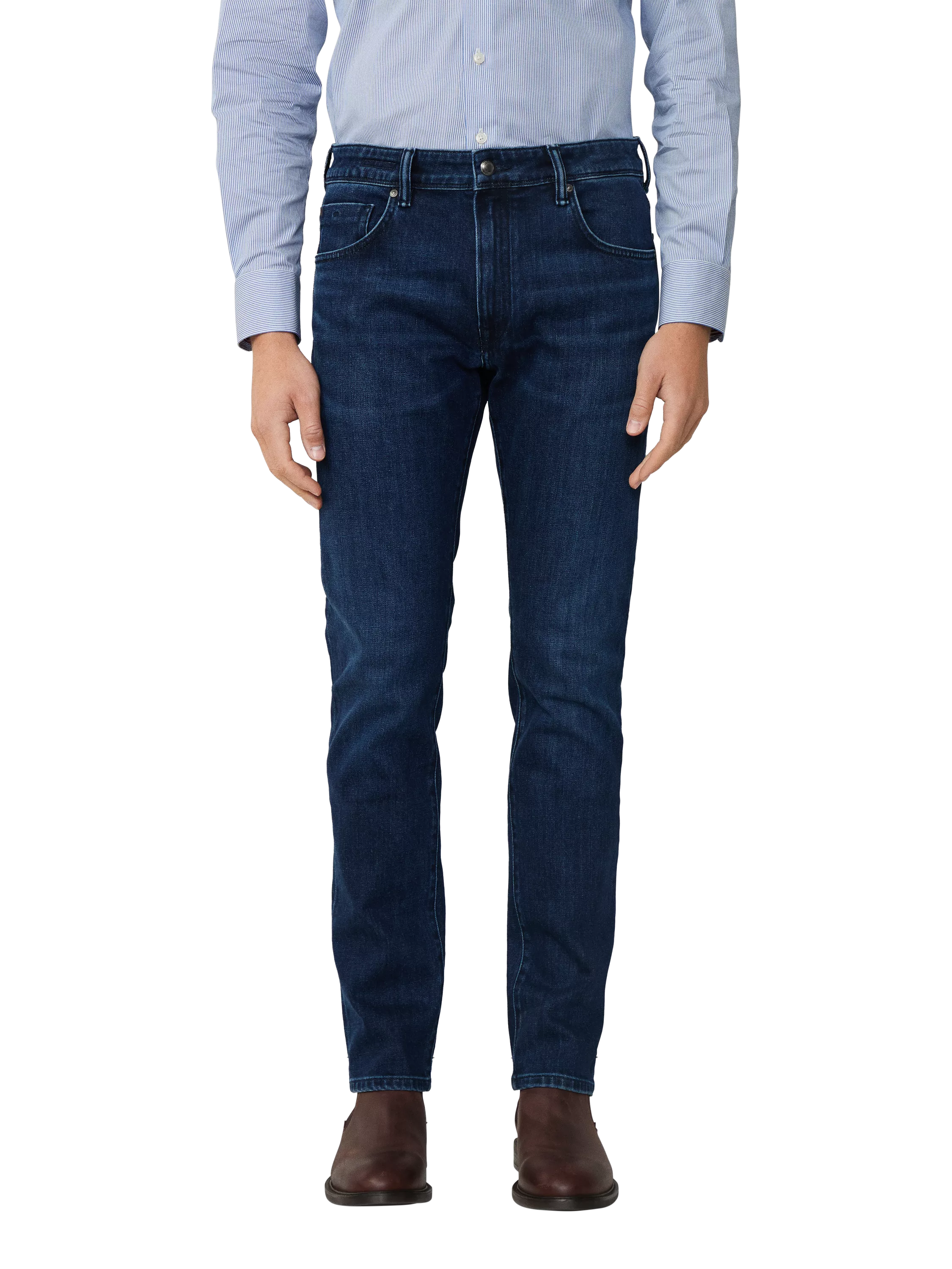Slim Fit jeans for a streamlined, modern silhouette. Crafted from Lux denim collection with comfort stretch cotton. Features a dark wash finish for a rich, versatile look. Branded leather back patch for a distinctive detail.