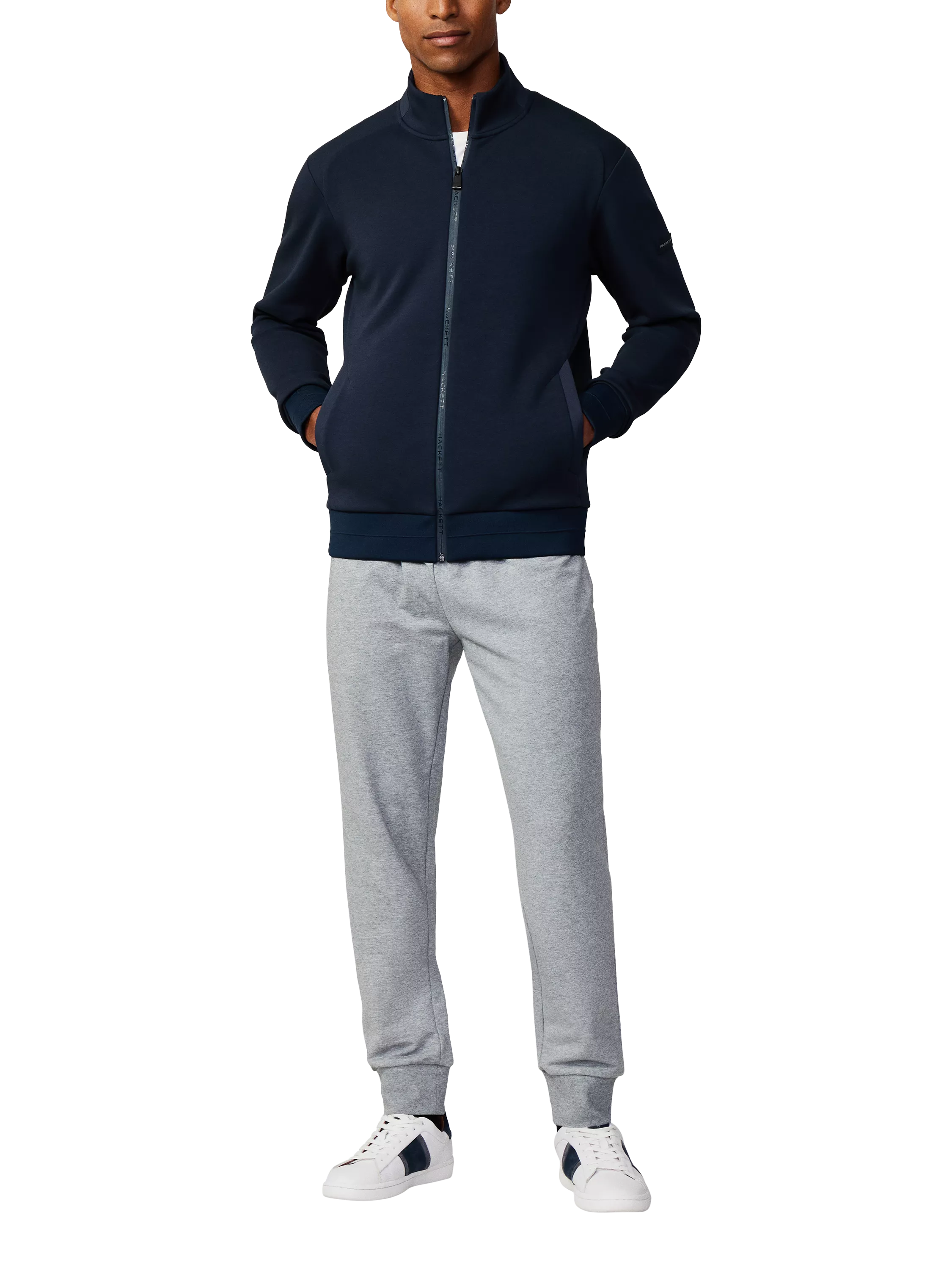 A sports jacket in interlock fabric, made from a blend of stretch cotton and polyester, is framed by a high neck for optimum coverage.