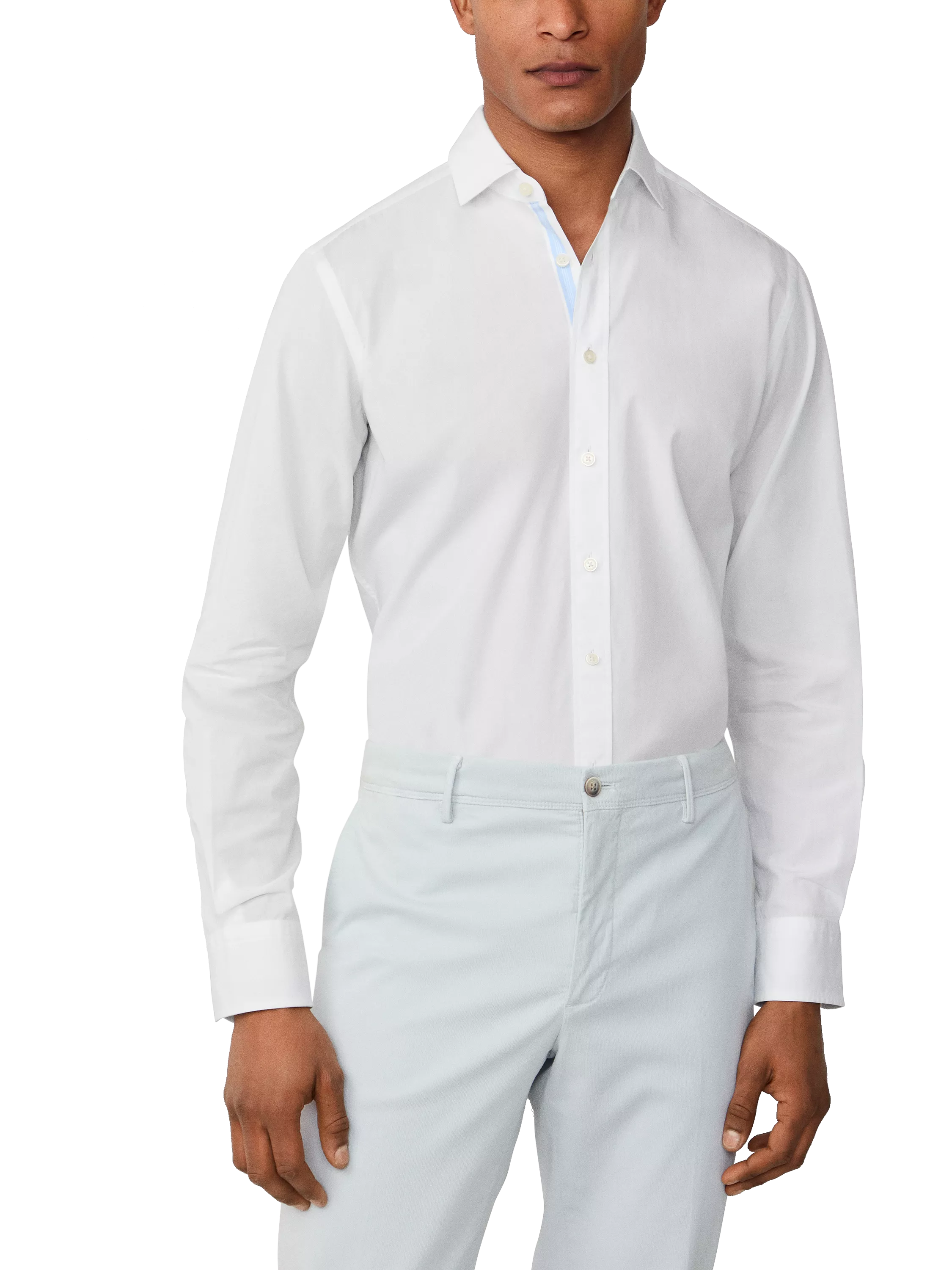 Tailored fit design shirt for a sharp structured look with a Kent cutaway collar, a hallmark of Hackett’s classic shirt styles. Contrast woven stripes on the placket, inside collar, and cuffs provide a refined touch.