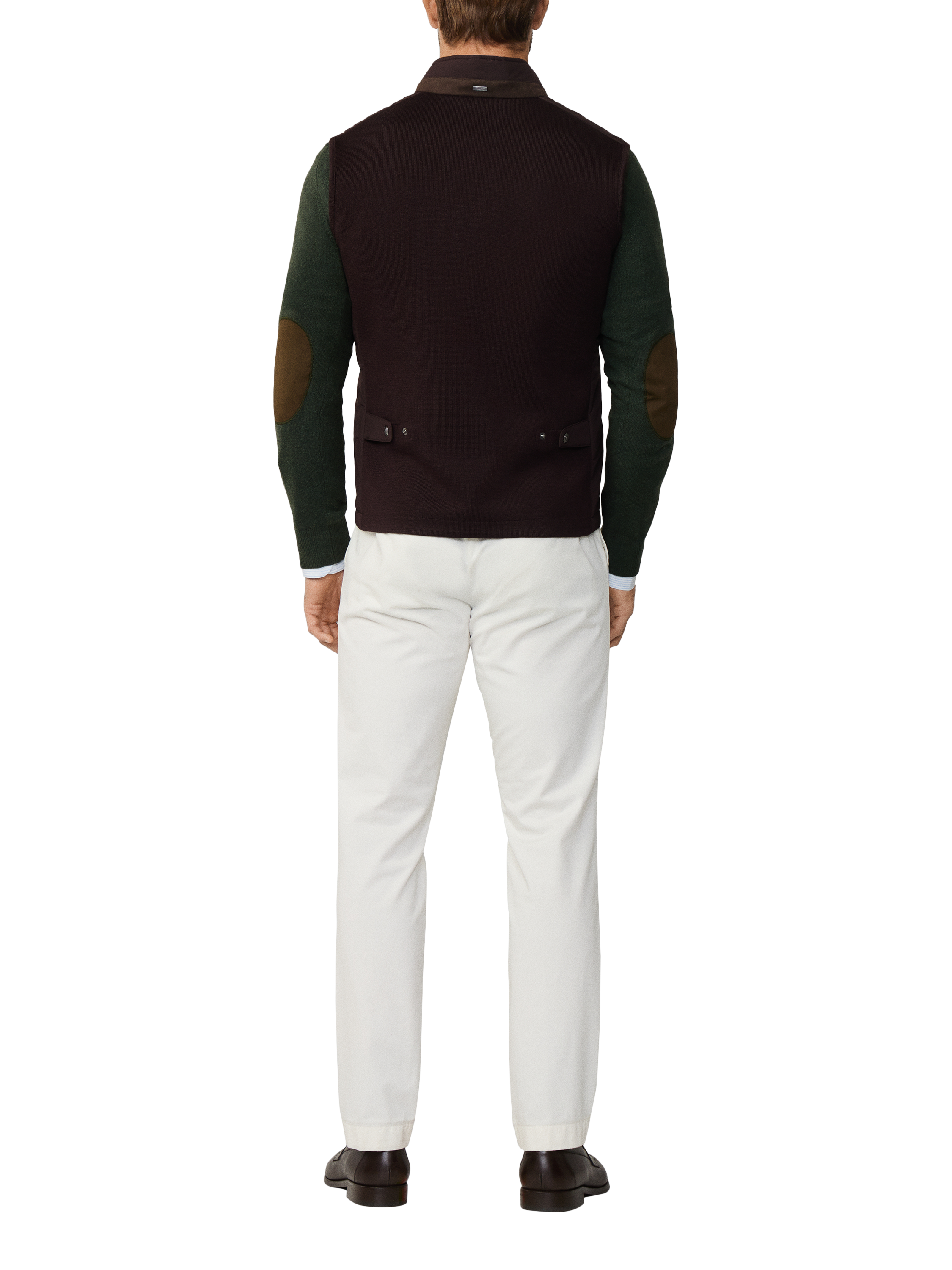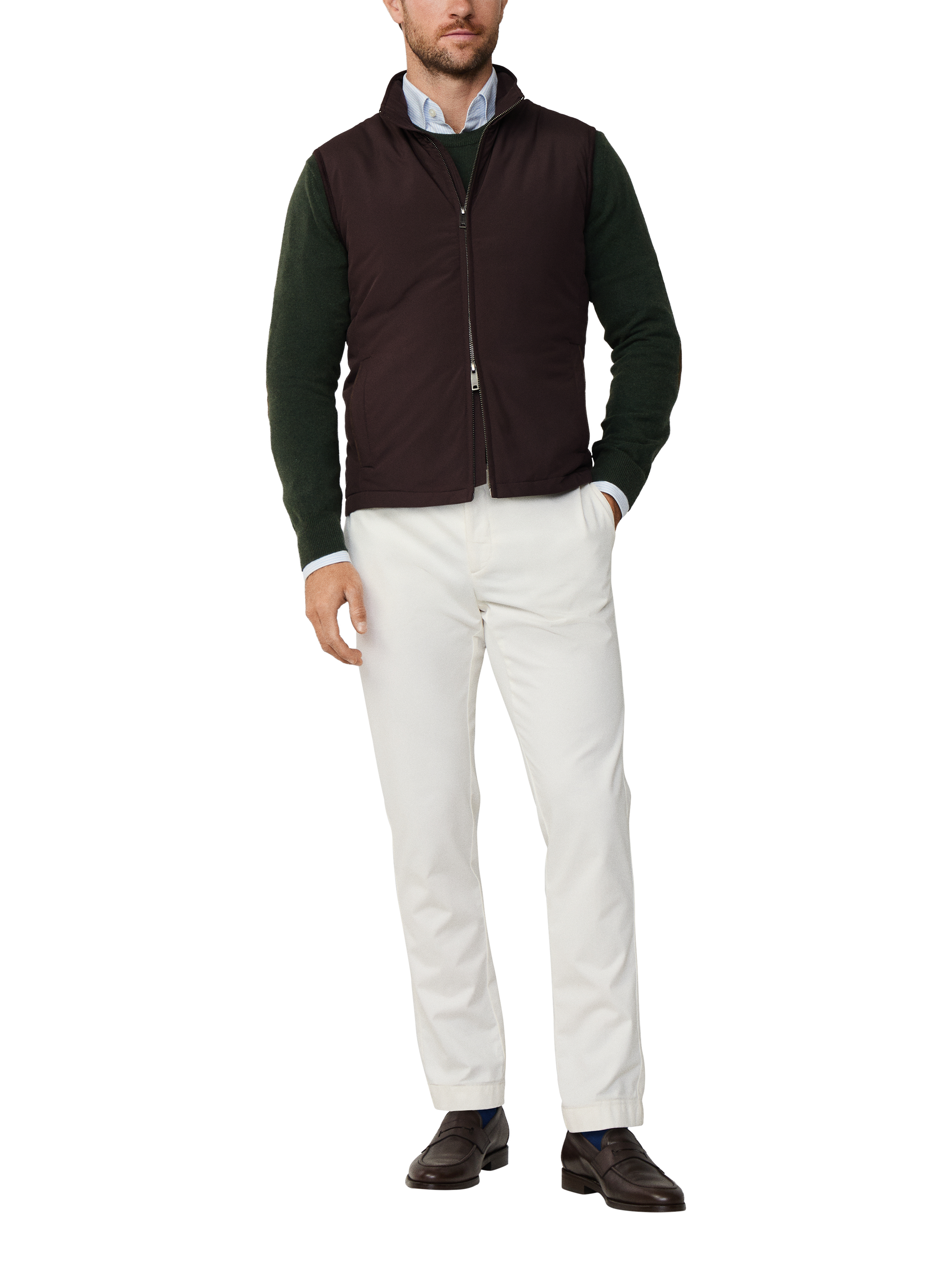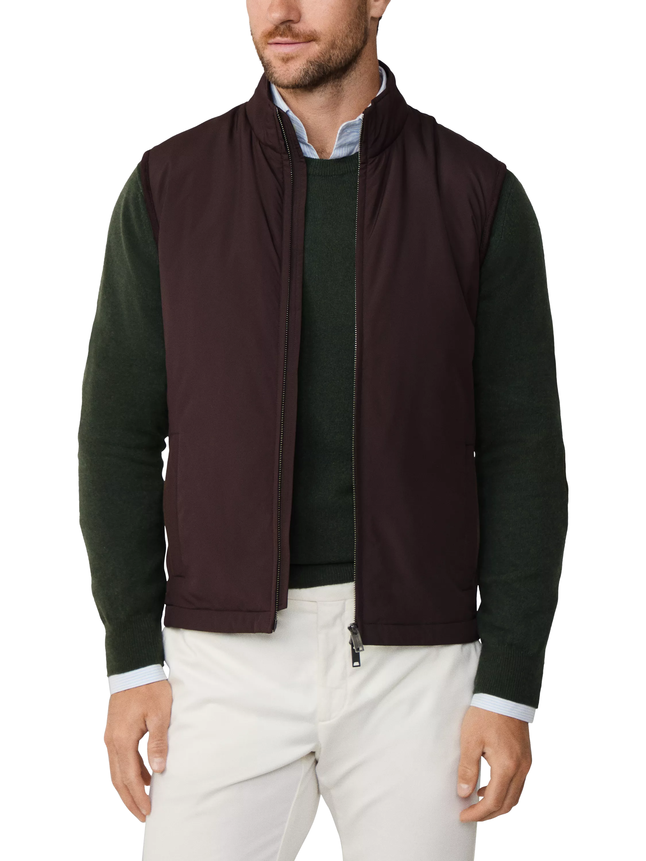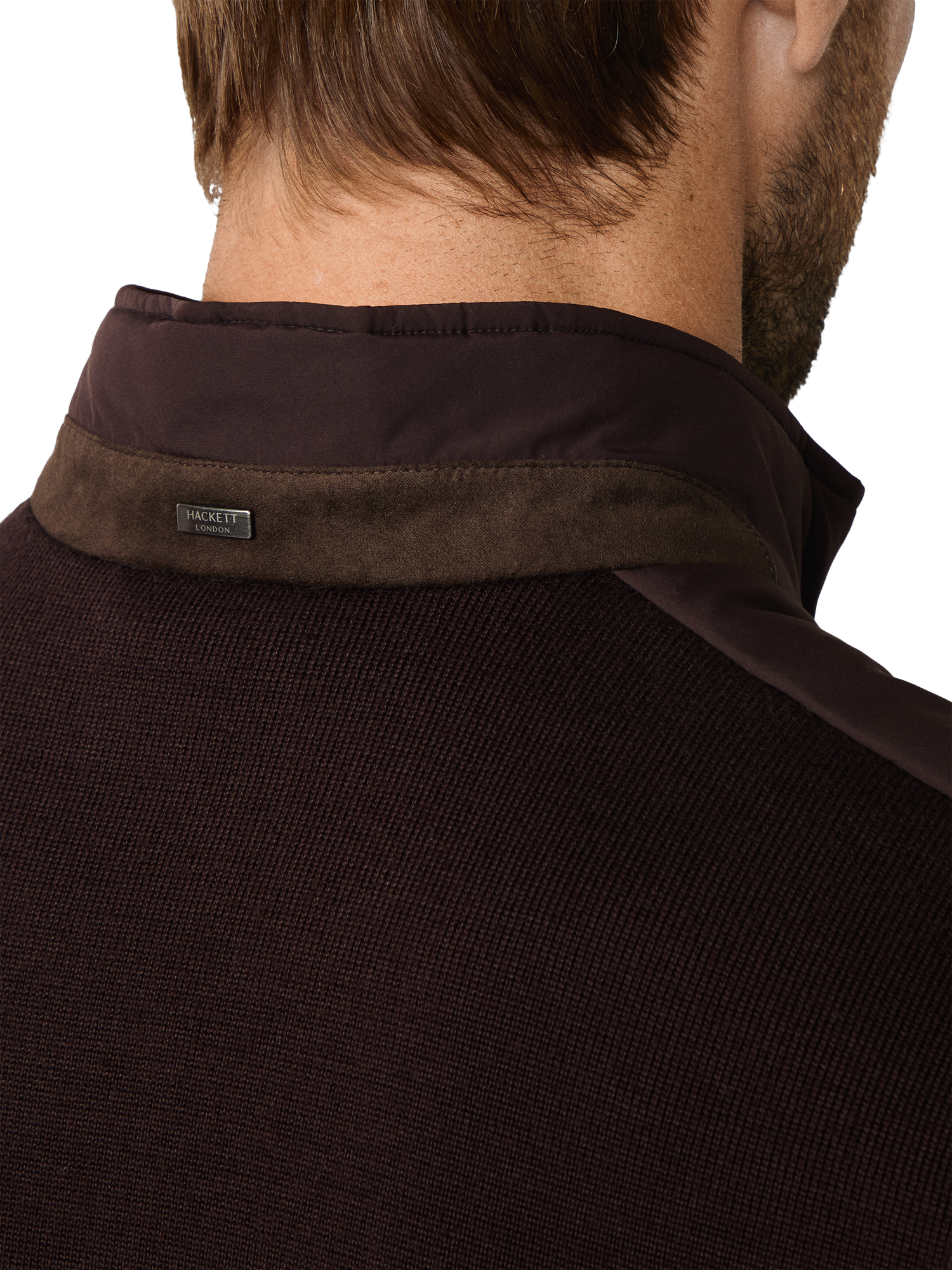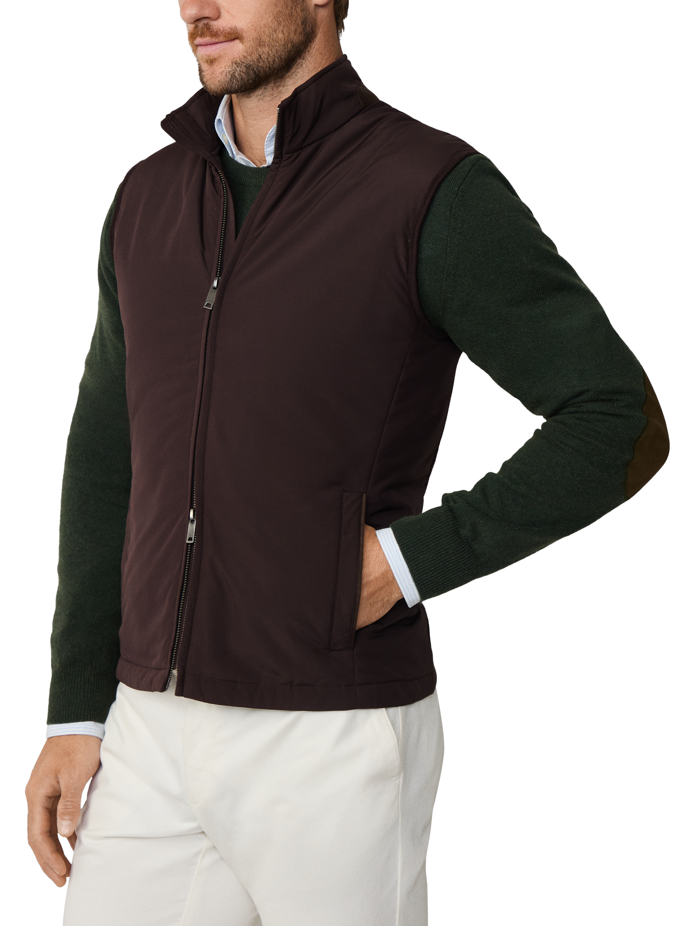 Waistcoat from Hackett London sporting a two-way zip and three outer welt pockets. Fashioned in a hybrid design with nylon front and knit back in a water-resistant finish. Featuring light fill insulation, suede trims and small metal branding on back collar.