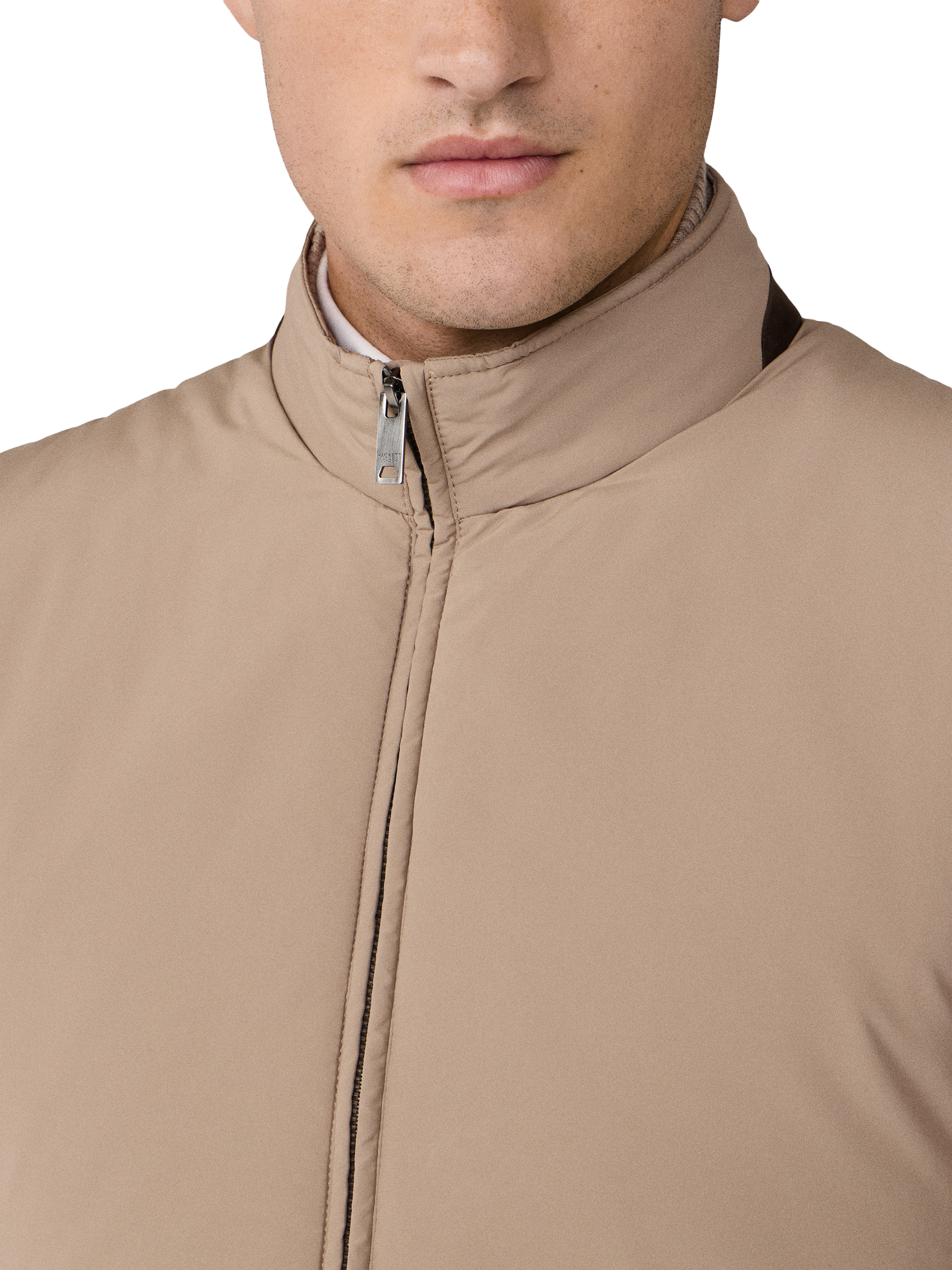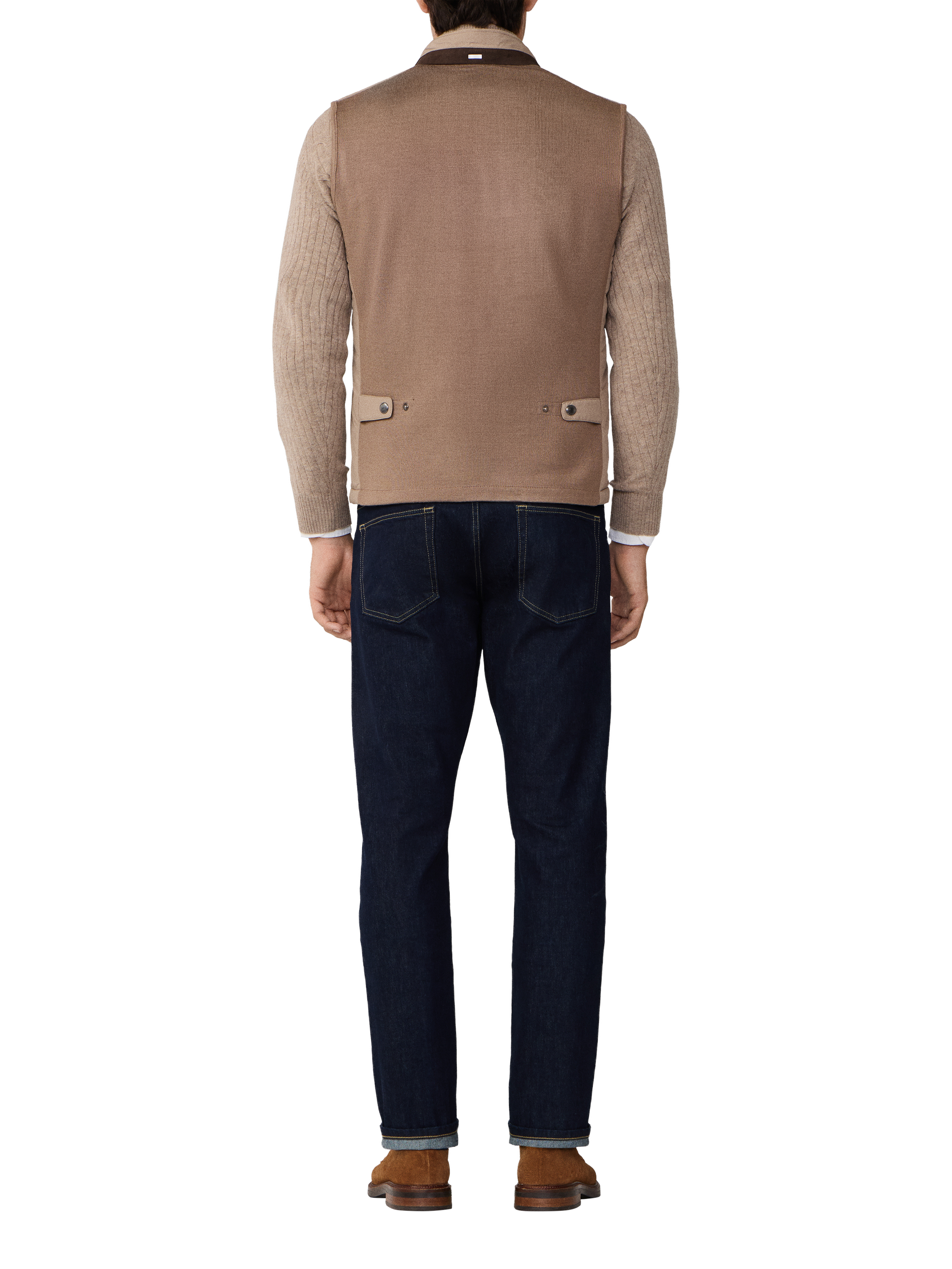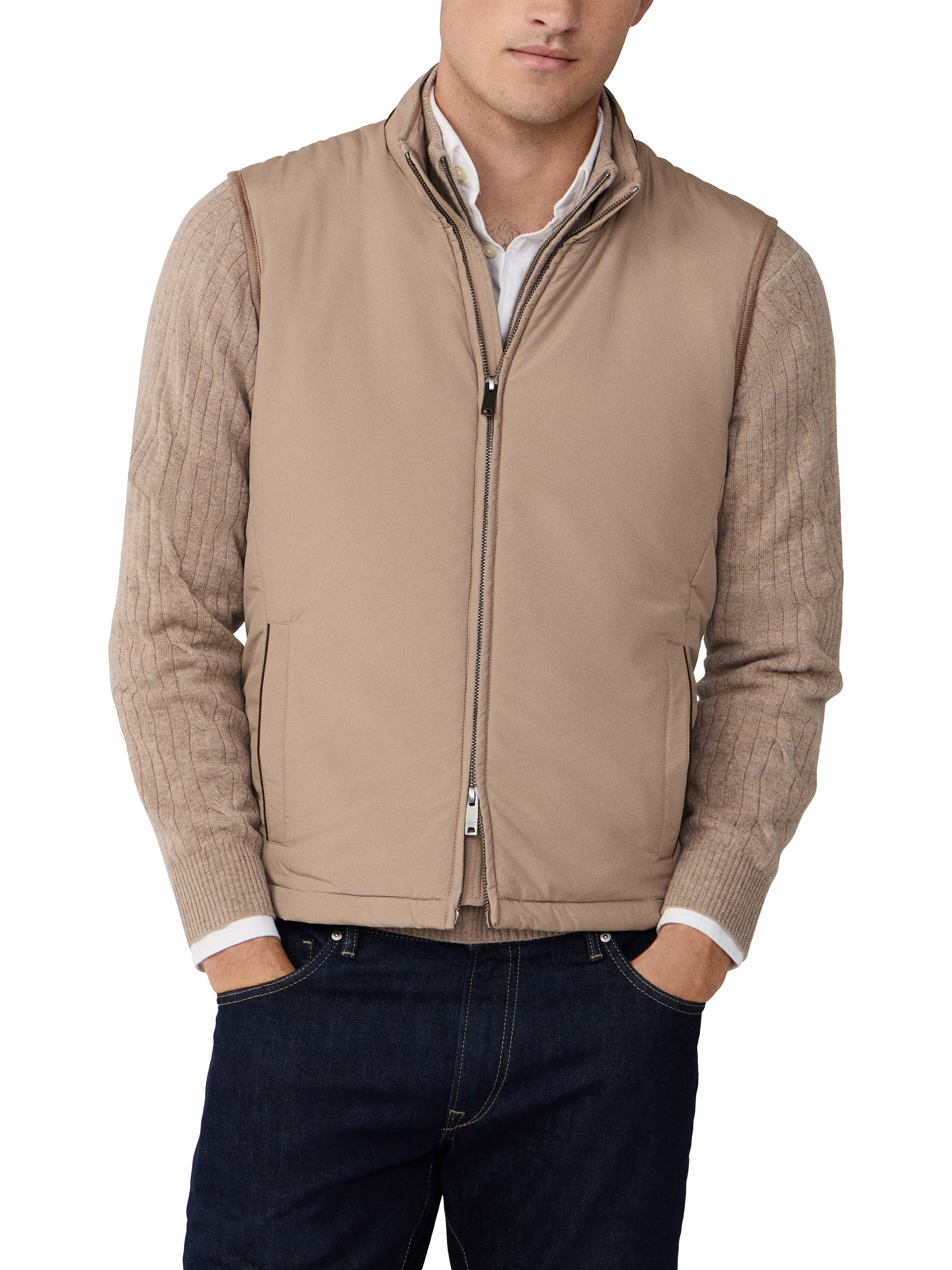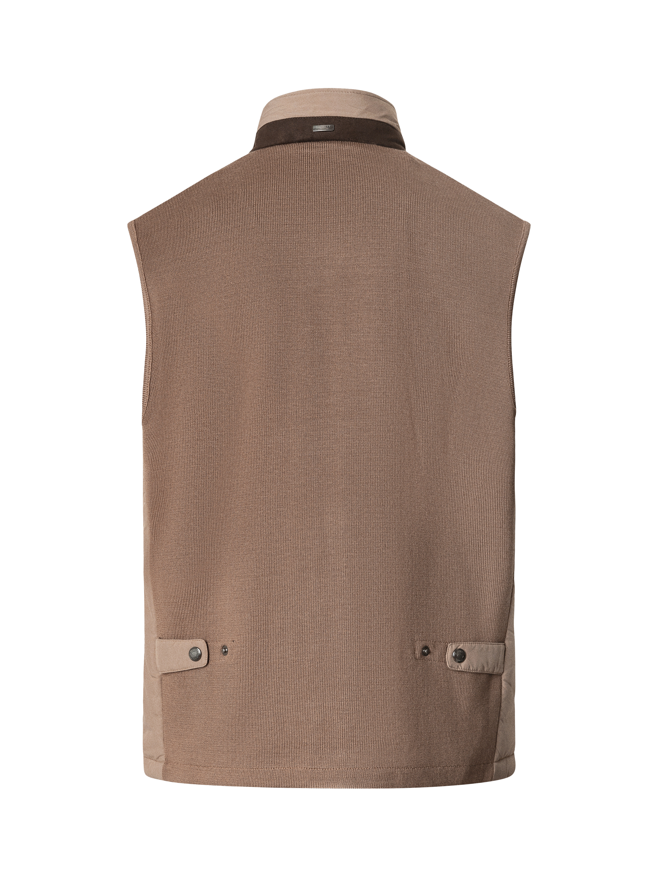Waistcoat from Hackett London sporting a two-way zip and three outer welt pockets. Fashioned in a hybrid design with nylon front and knit back in a water-resistant finish. Featuring light fill insulation, suede trims and small metal branding on back collar.