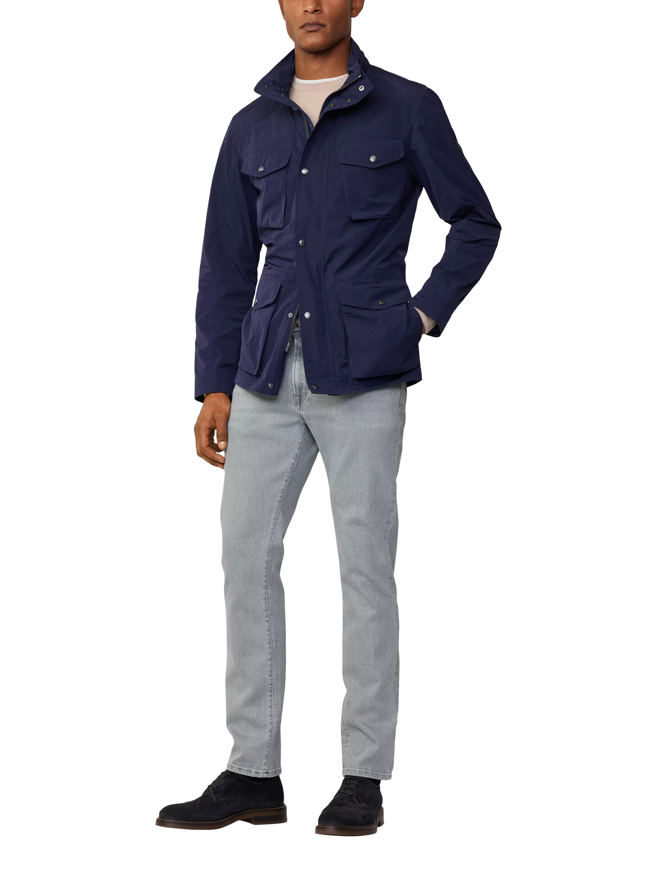 This iconic lightweight jacket from Hackett London comprises compact memory nylon with water-resistant properties. It has four external pockets, including dual-access lower pockets. And it's finessed with a two-way zip, a concealed hood, topstitch detailing, and the Velospeed badge. Don't let your style standards slip while ensuring full practicality.