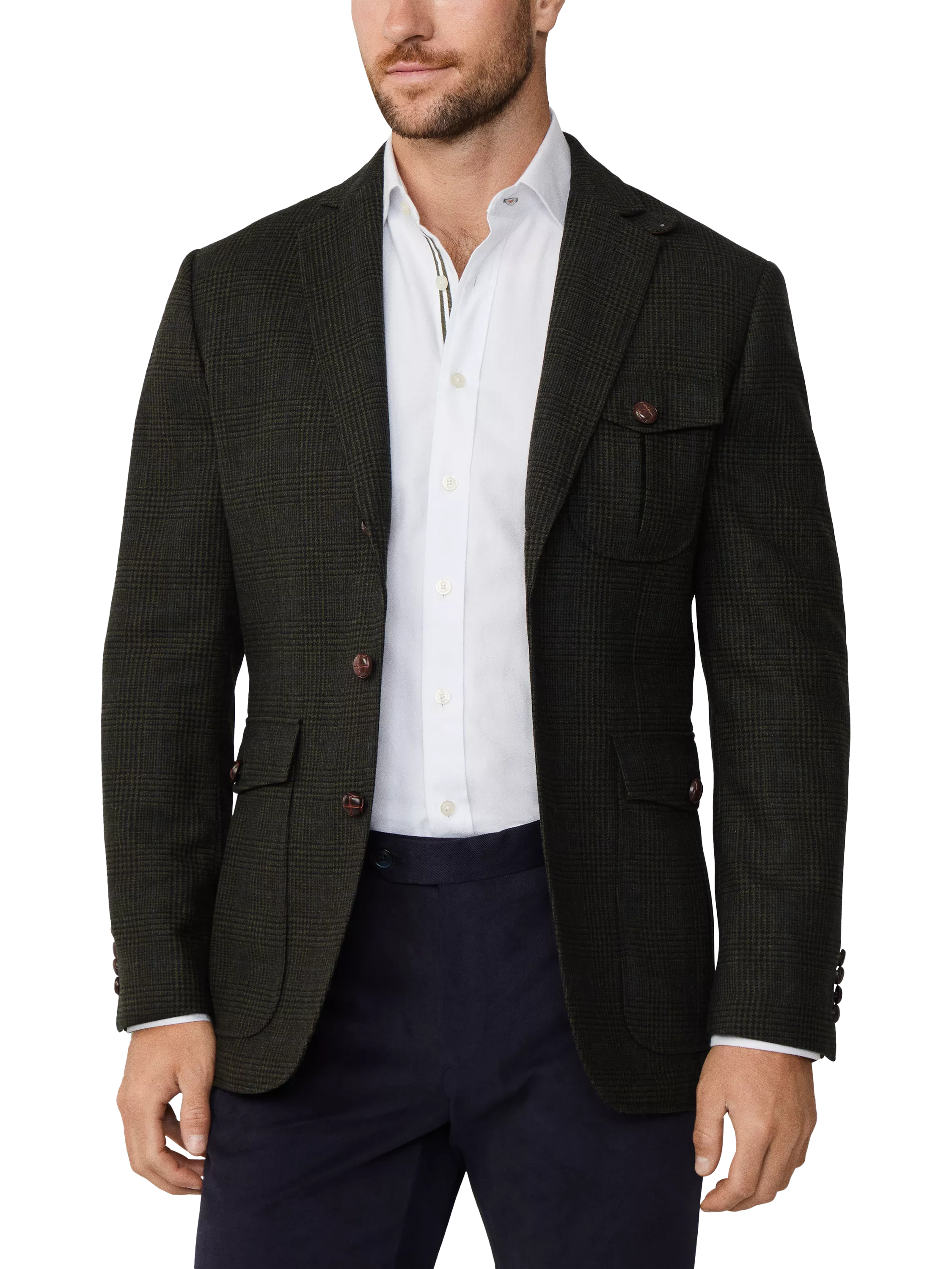 Made in a wool blend fabric with a tonal Price of Wales design, this blazer features three button roll, a notch lapel, button cuffs and patch pockets along with a storm collar tab detail and bright green undercollar.