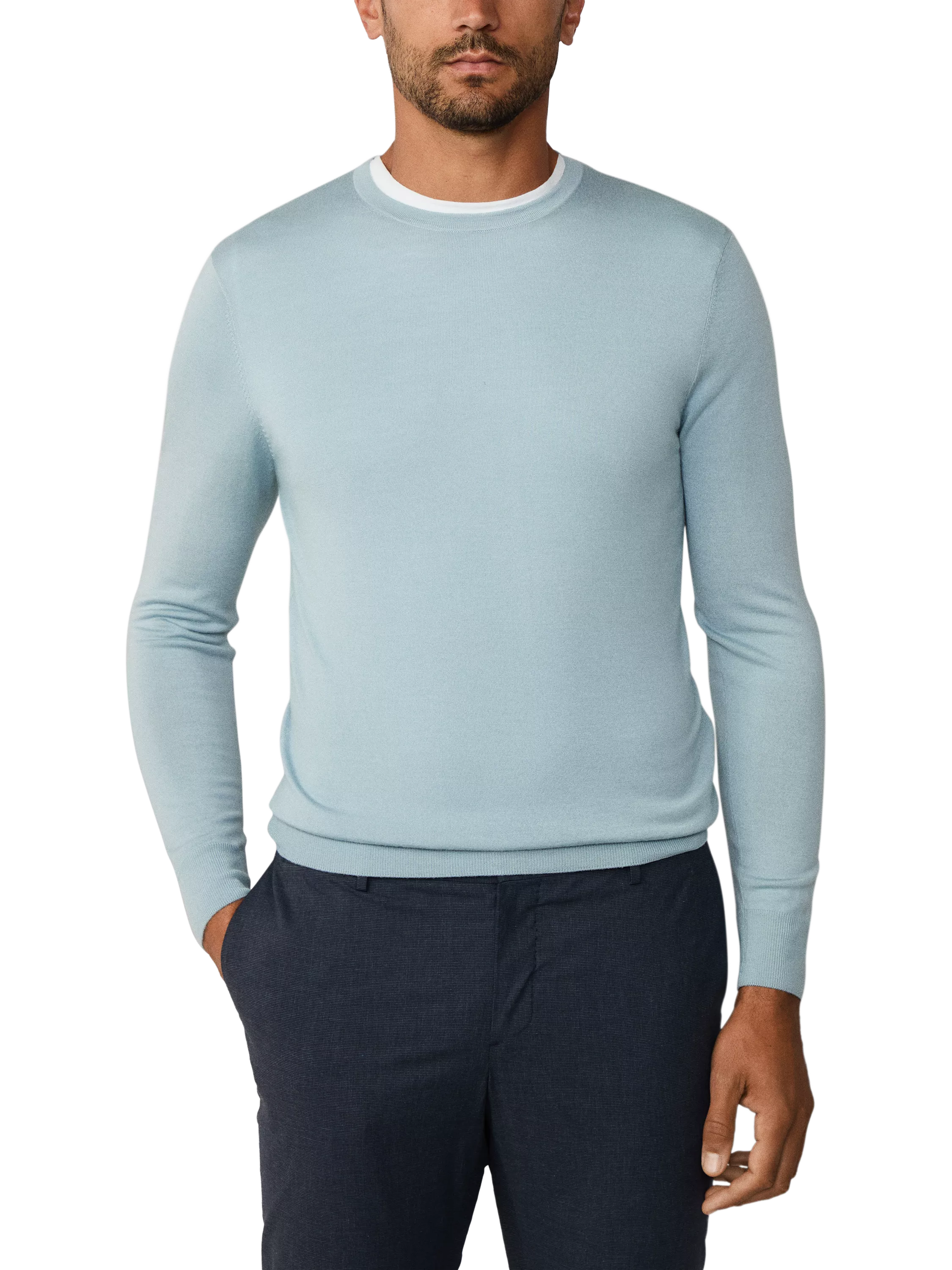 A supersoft crew neck jumper. It's fine merino wool and silk blend keeps you warm without weighing you down, whether you are out and about or taking it easy at home.