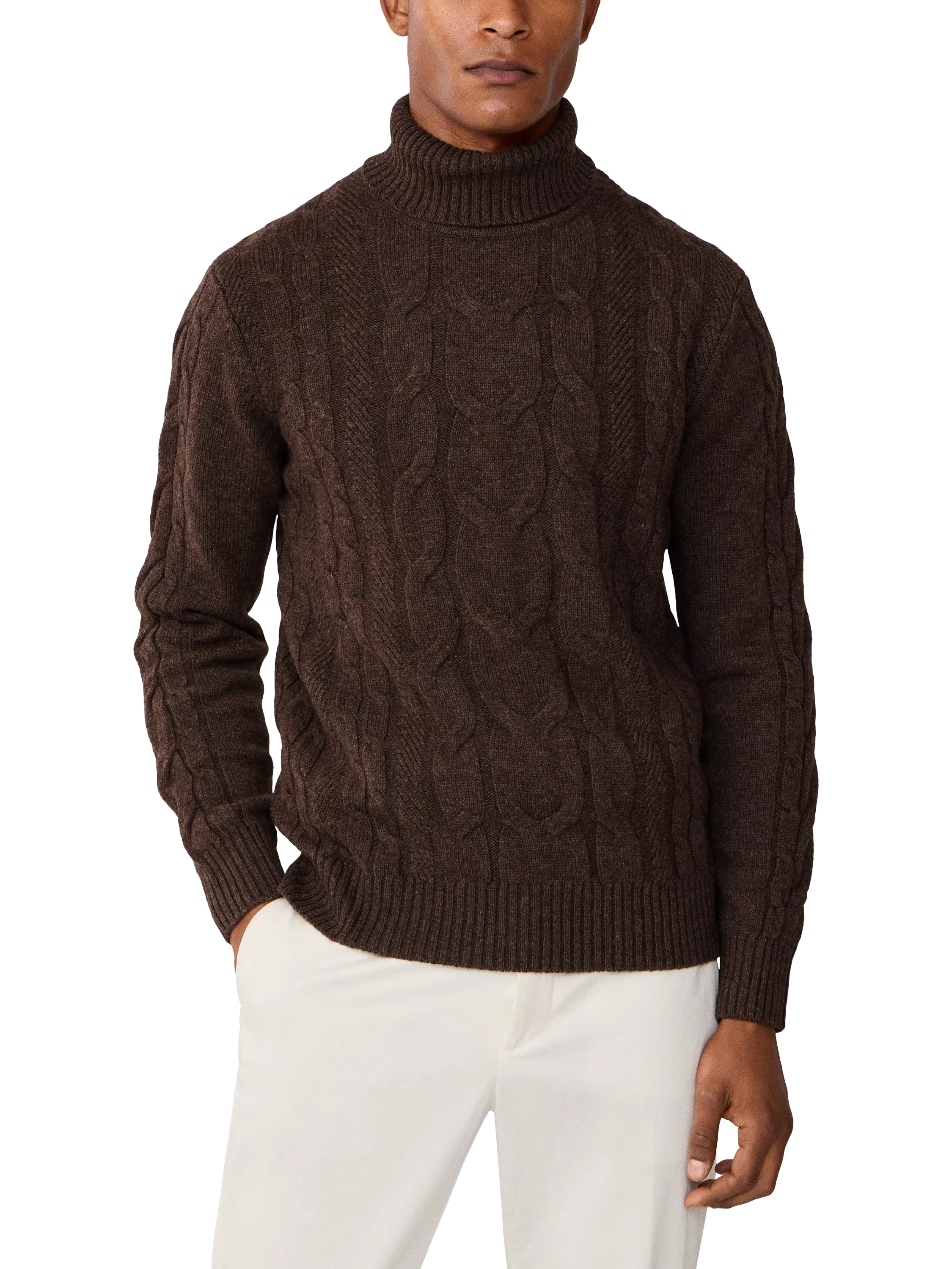 Cut to regular fit, this roll-neck jumper is luxuriously knitted in a Merino-Cashmere Italian yarn blend, featuring a classic cable knit designed with ribbed trims on the collar, hem and cuffs. Fully fashioned for enhanced structure and durability.