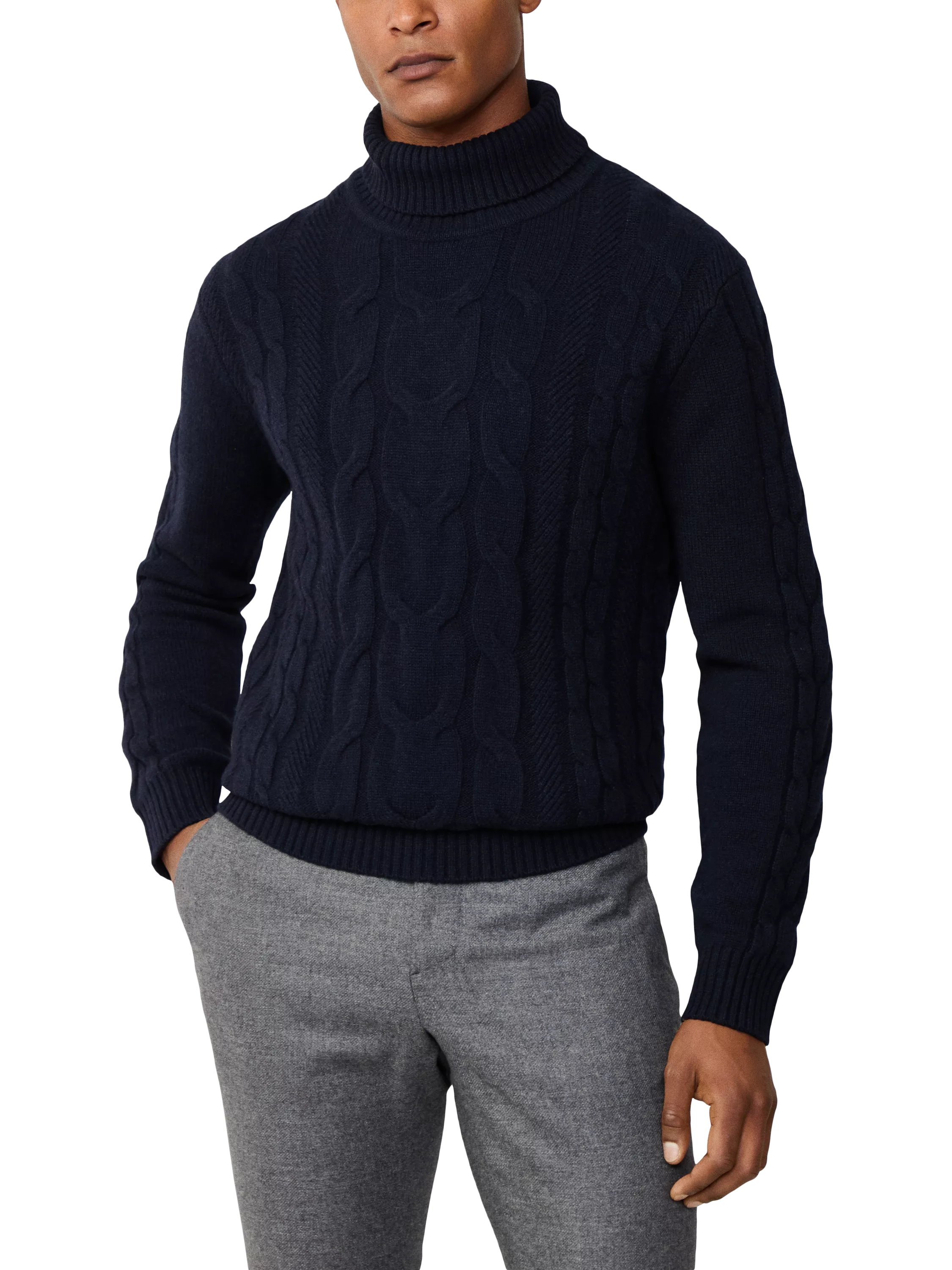 Cut to regular fit, this roll-neck jumper is luxuriously knitted in a Merino-Cashmere Italian yarn blend, featuring a classic cable knit designed with ribbed trims on the collar, hem and cuffs. Fully fashioned for enhanced structure and durability.