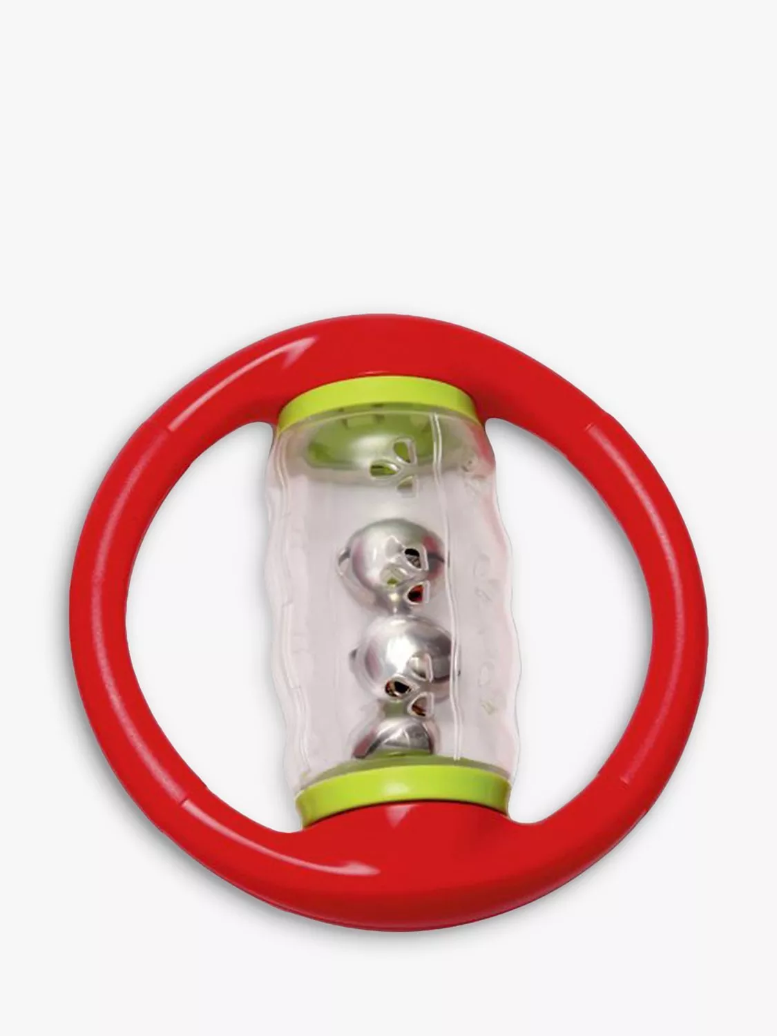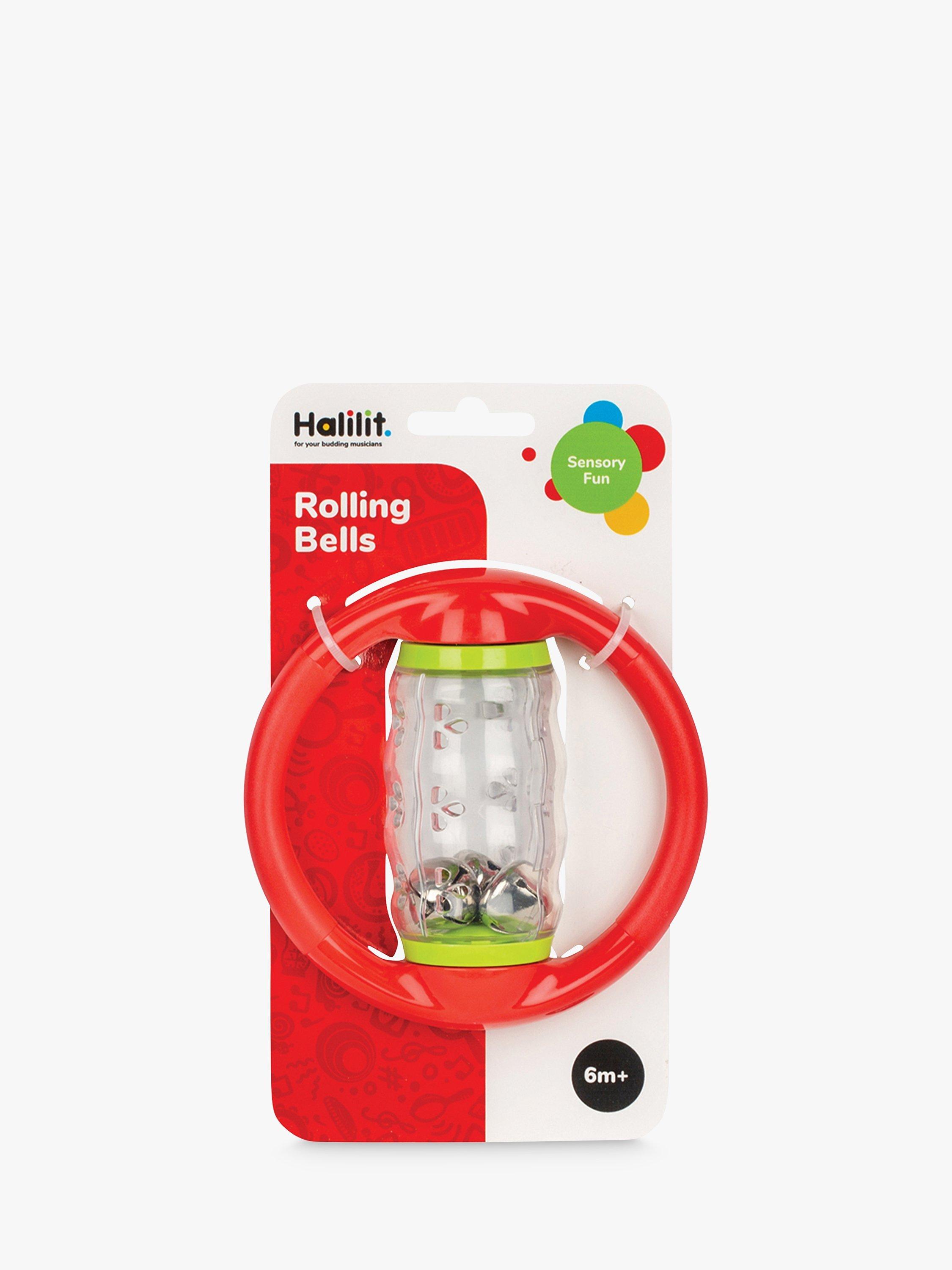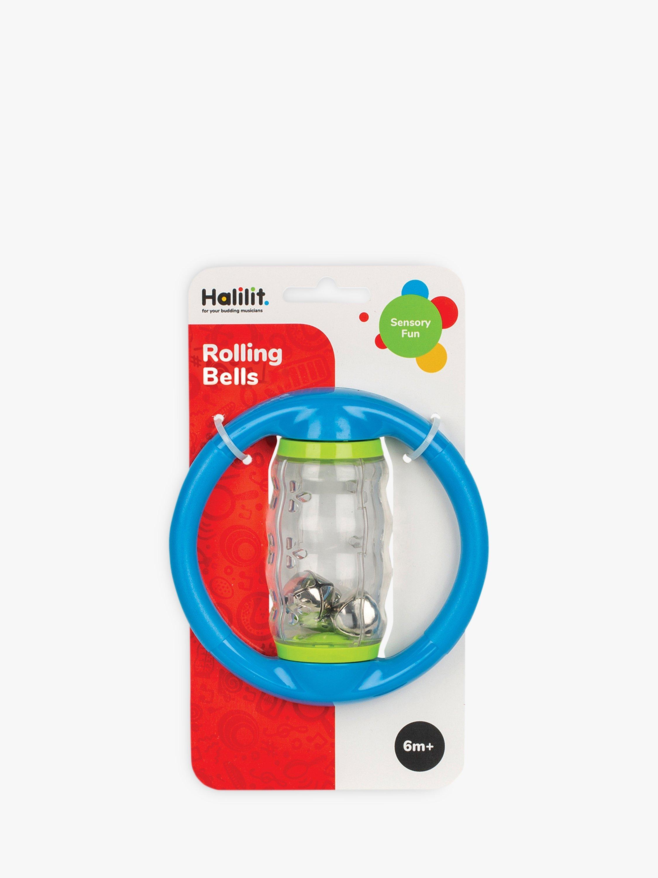 Roll and rattle with the Halilit Rolling Bells. This tactile, transparent spinning tube contains noisy bells that cascade and make wonderful sounds when shaken or spun. It features two easy-grip handles for little hands to hold.
