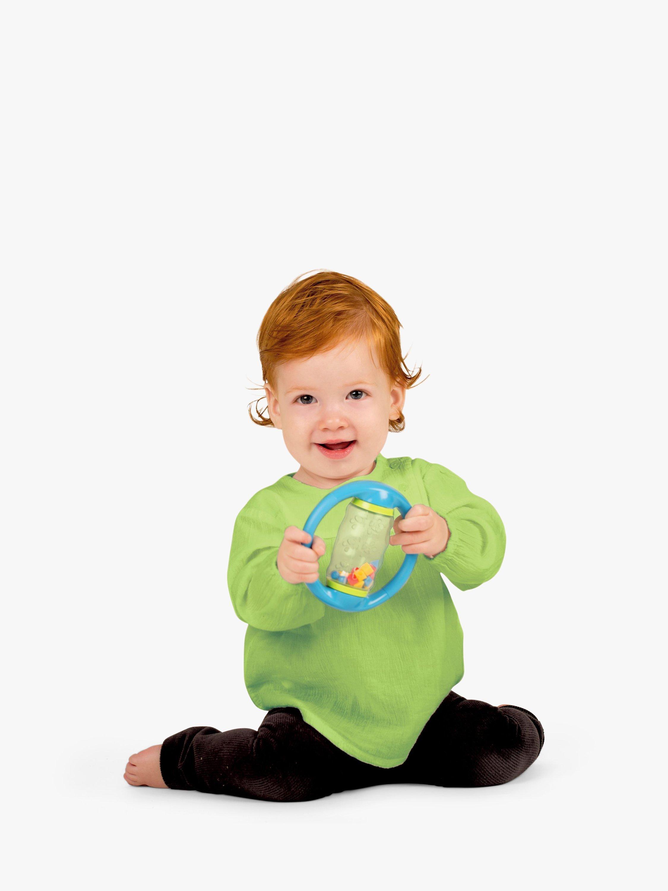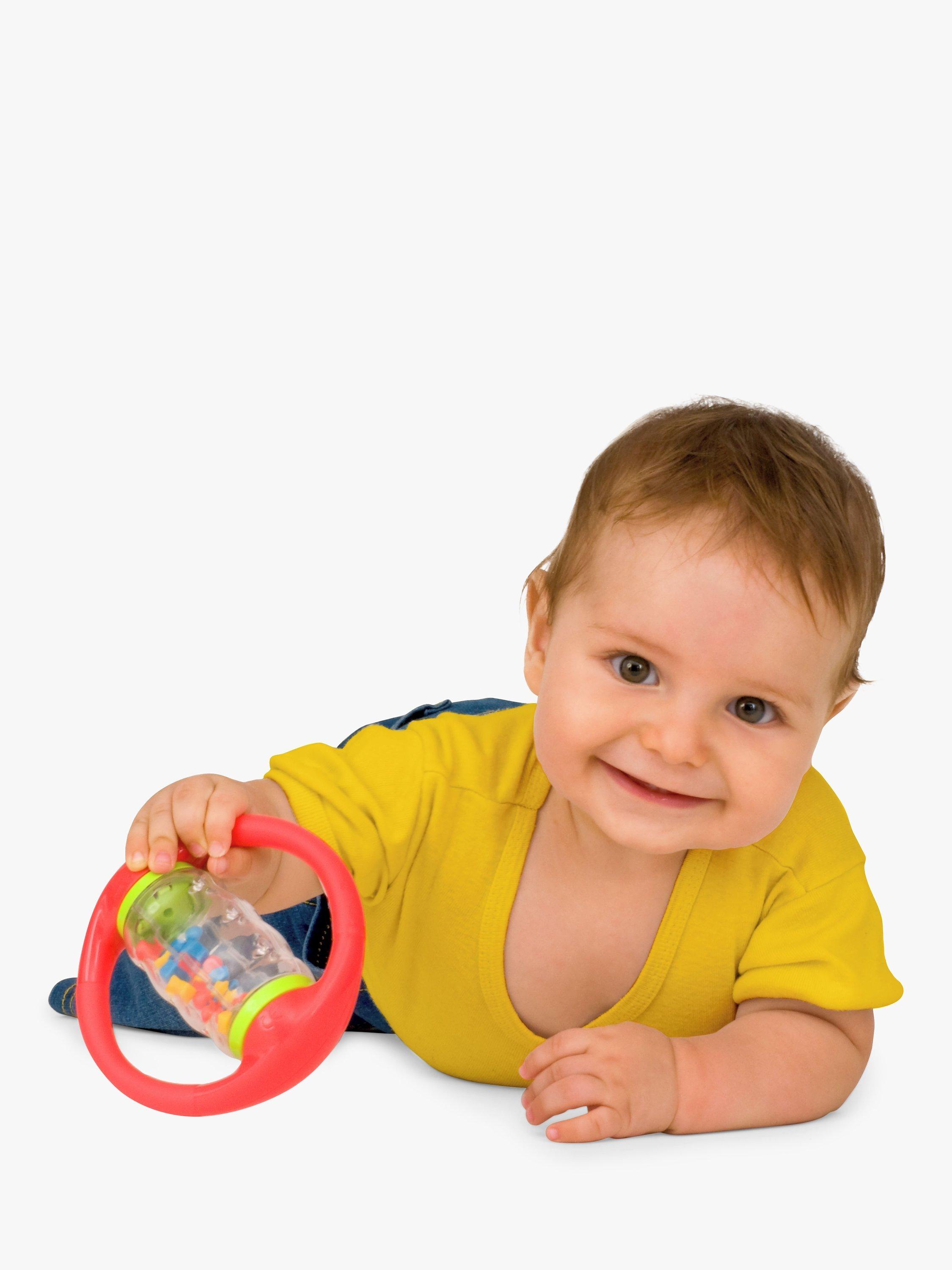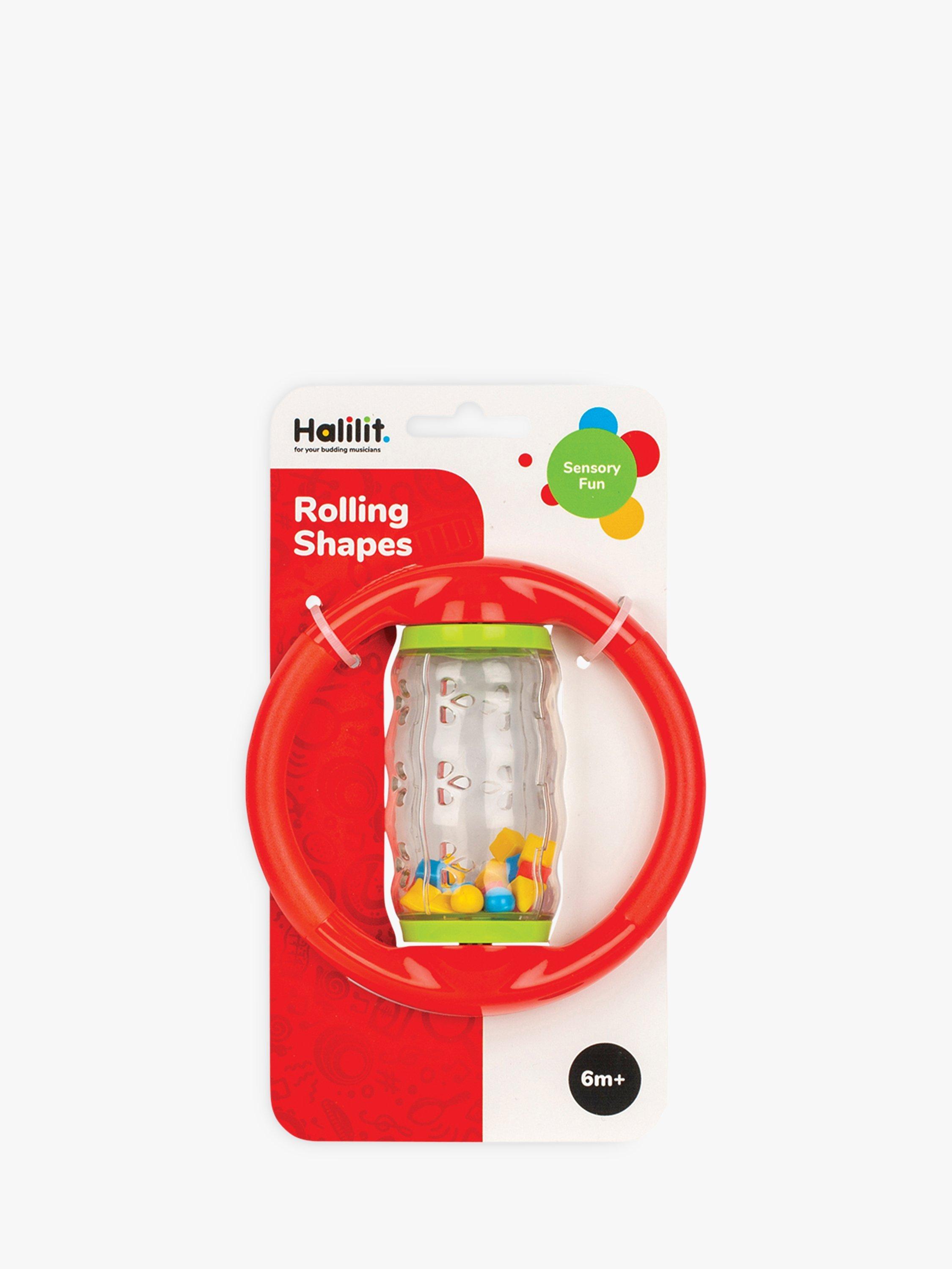 Roll and rattle with the Halilit Rolling Shapes! This tactile, transparent spinning tube contains colourful geometric beads that cascade and make wonderful sounds when shaken or spun. It features two easy-grip handles for little hands to hold.