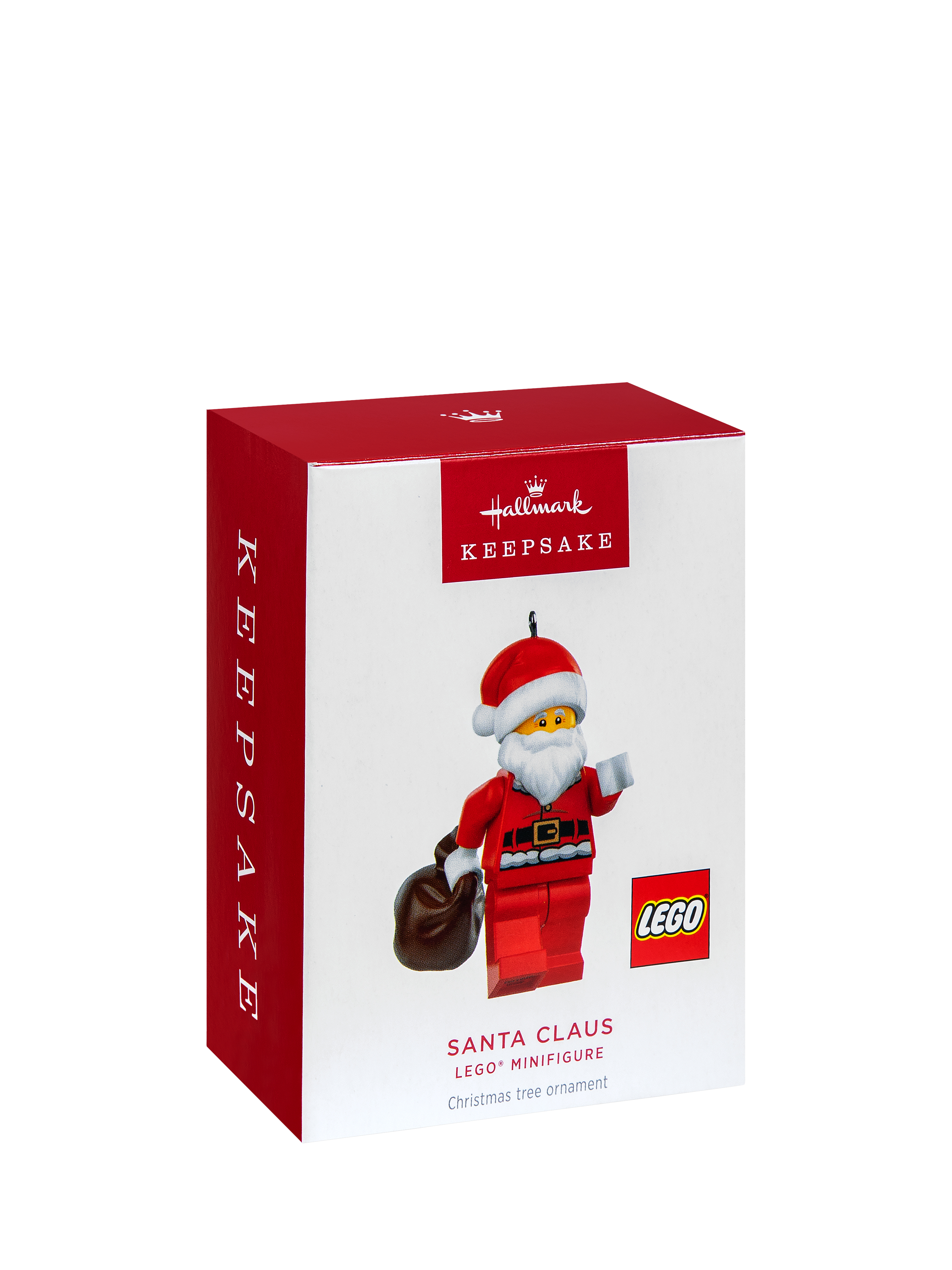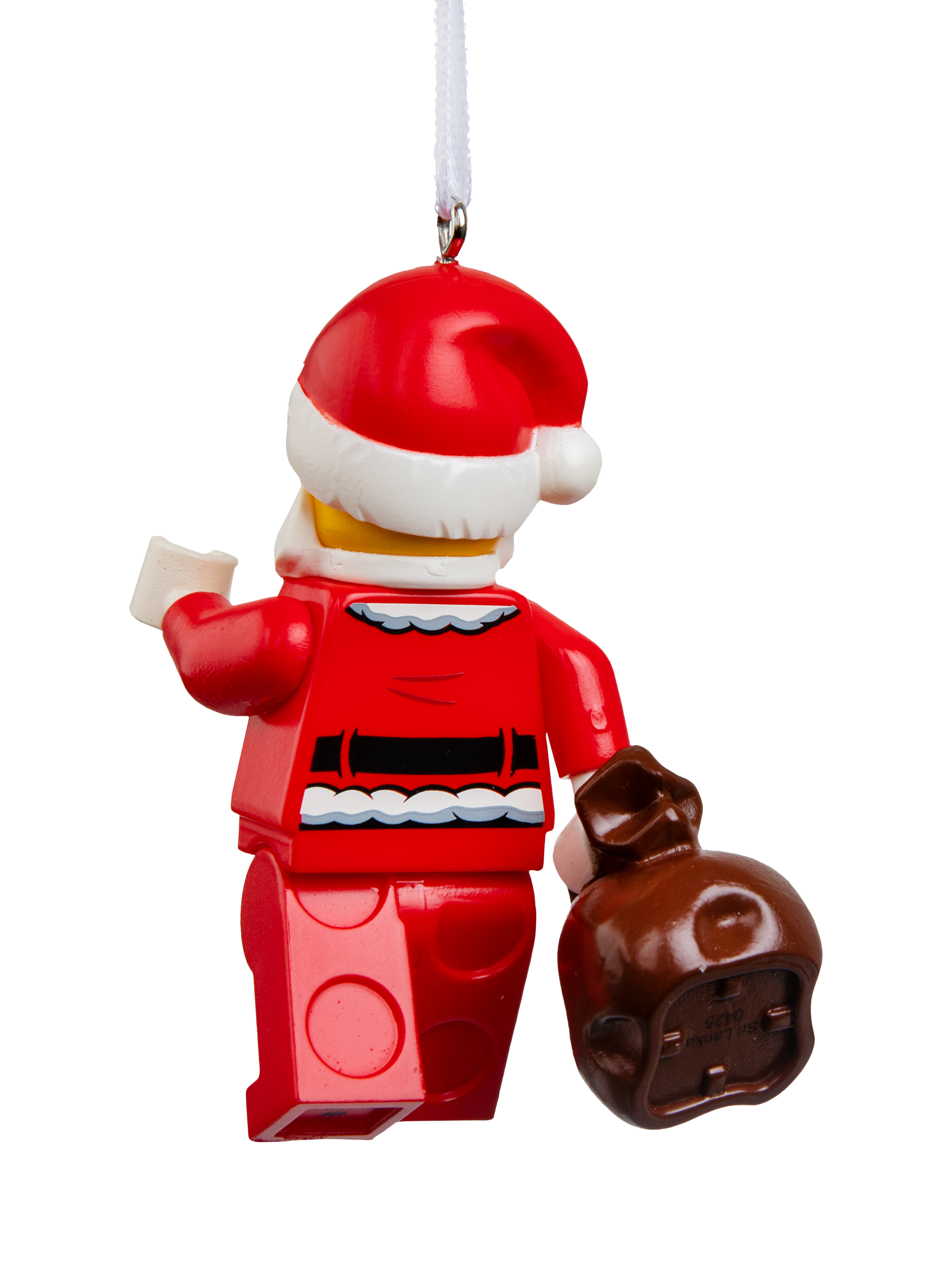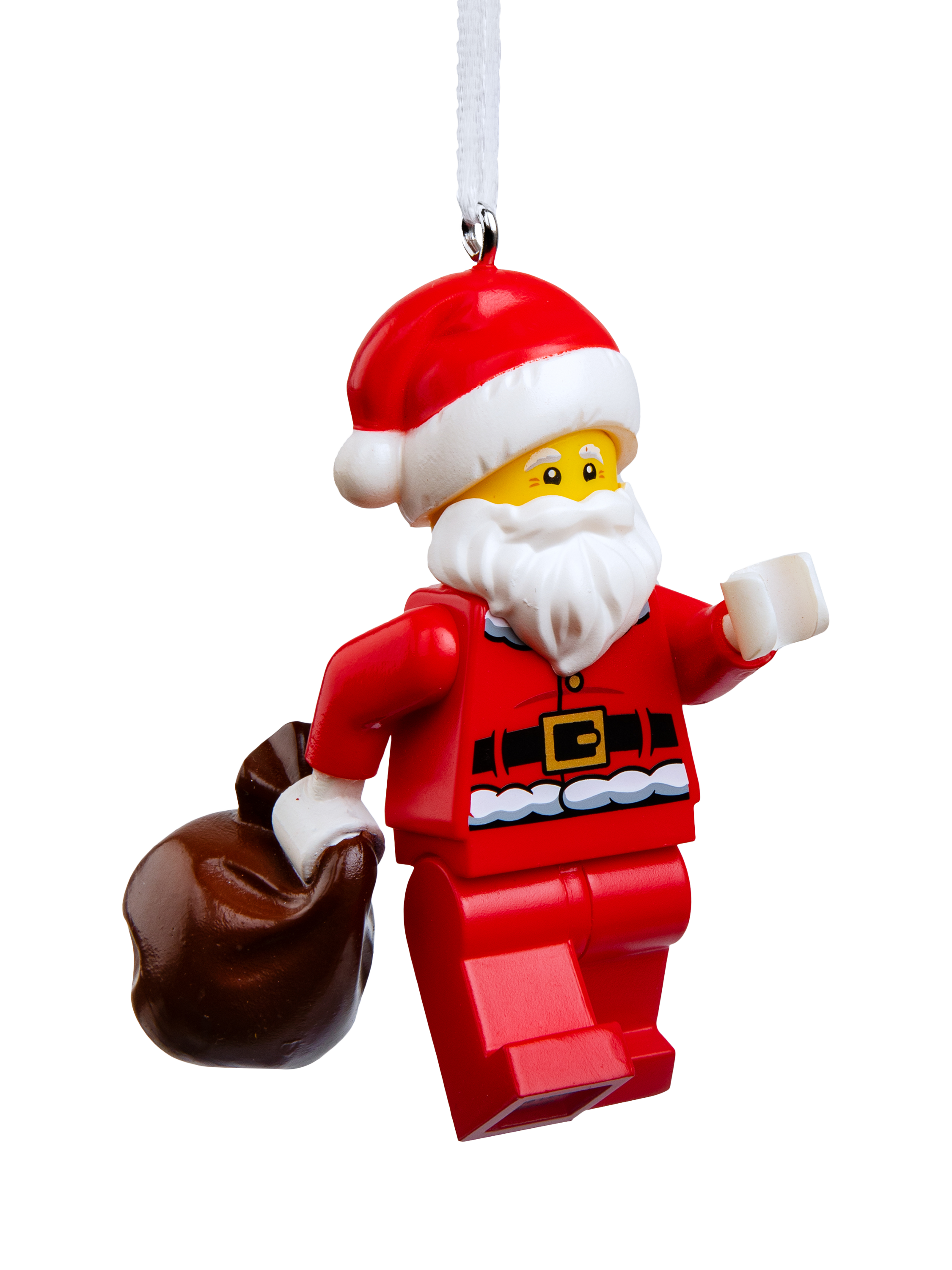 This ornament features Jolly Santa from the LEGO universe holding his Santa sack full of toys with red and white details. It is made of hard-wearing plastic complete with a hanging loop and white ribbon for easy display.