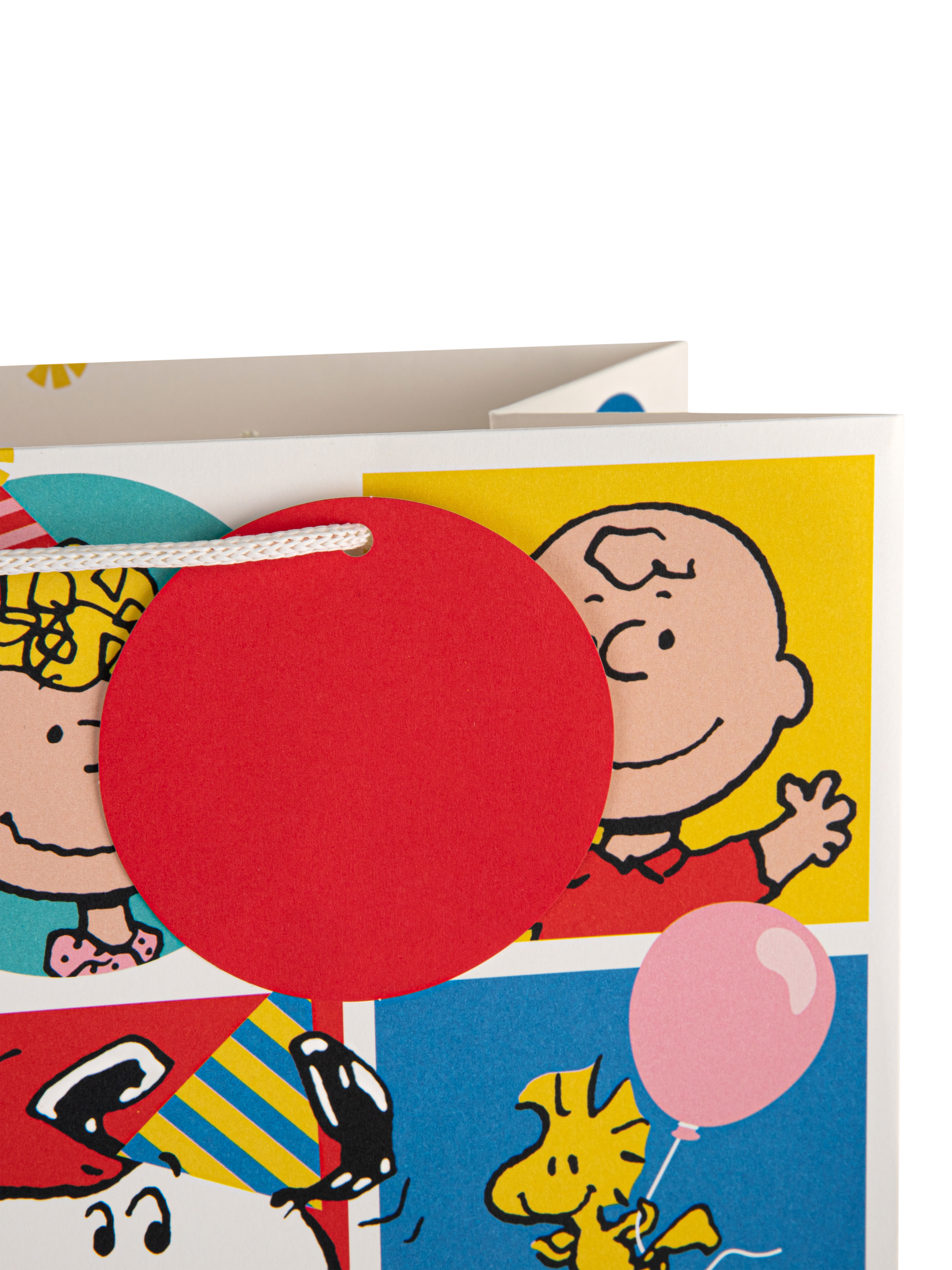 Deliver all the presents and treats they deserve with this bold and colourful large gift bag. Perfect for any occasion, it features PEANUTS™ Snoopy and the rest of the gang including Charlie Brown, Woodstock, Peppermint Patty, Linus Van Pelt, Lucy Van Pelt, Sally Brown, Franklin, Pig-Pen, Marcie and Schroeder. The bag has colourful side panels, a circular red gift tag and white knitted paper cord handles.