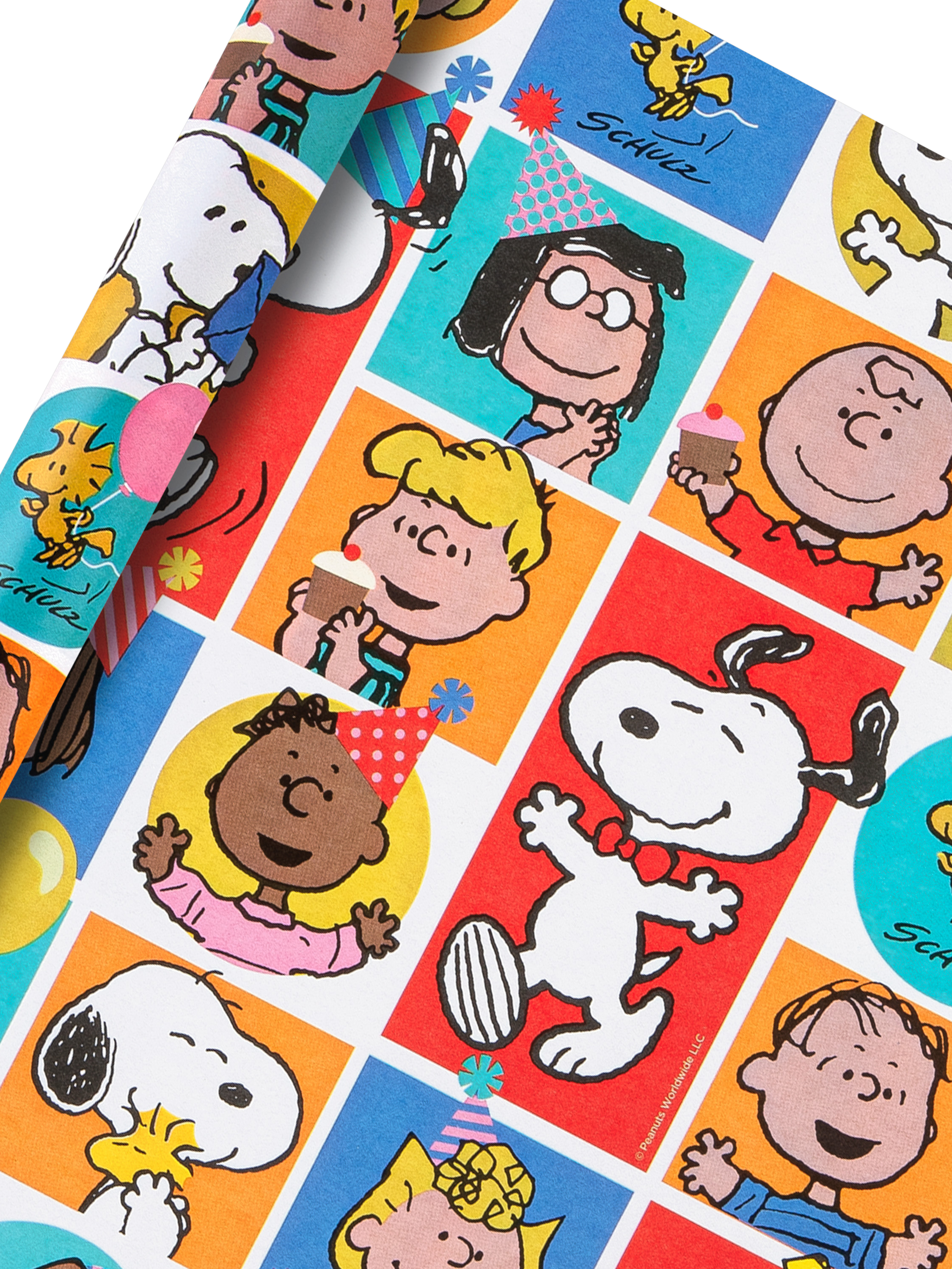 Send all their gifts wrapped up and looking extra exciting, no matter the occasion, with this wonderful wrapping paper roll. Inspired by the PEANUTS™ gang to brighten up their celebrations, from birthdays, Christmas and more. This roll wrap features a bright PEANUTS™ gang design, including SNOOPY, Charlie Brown, WOODSTOCK, Peppermint Patty, Linus Van Pelt, Lucy Van Pelt, Sally Brown, Franklin, Pig-Pen, Marcie and Schroeder. With an easy-open tear strip, simply pull the tab down the full length of the wrap to open. Extra paper is provided to protect the roll. Design on one side and a cutting grid on the reverse.