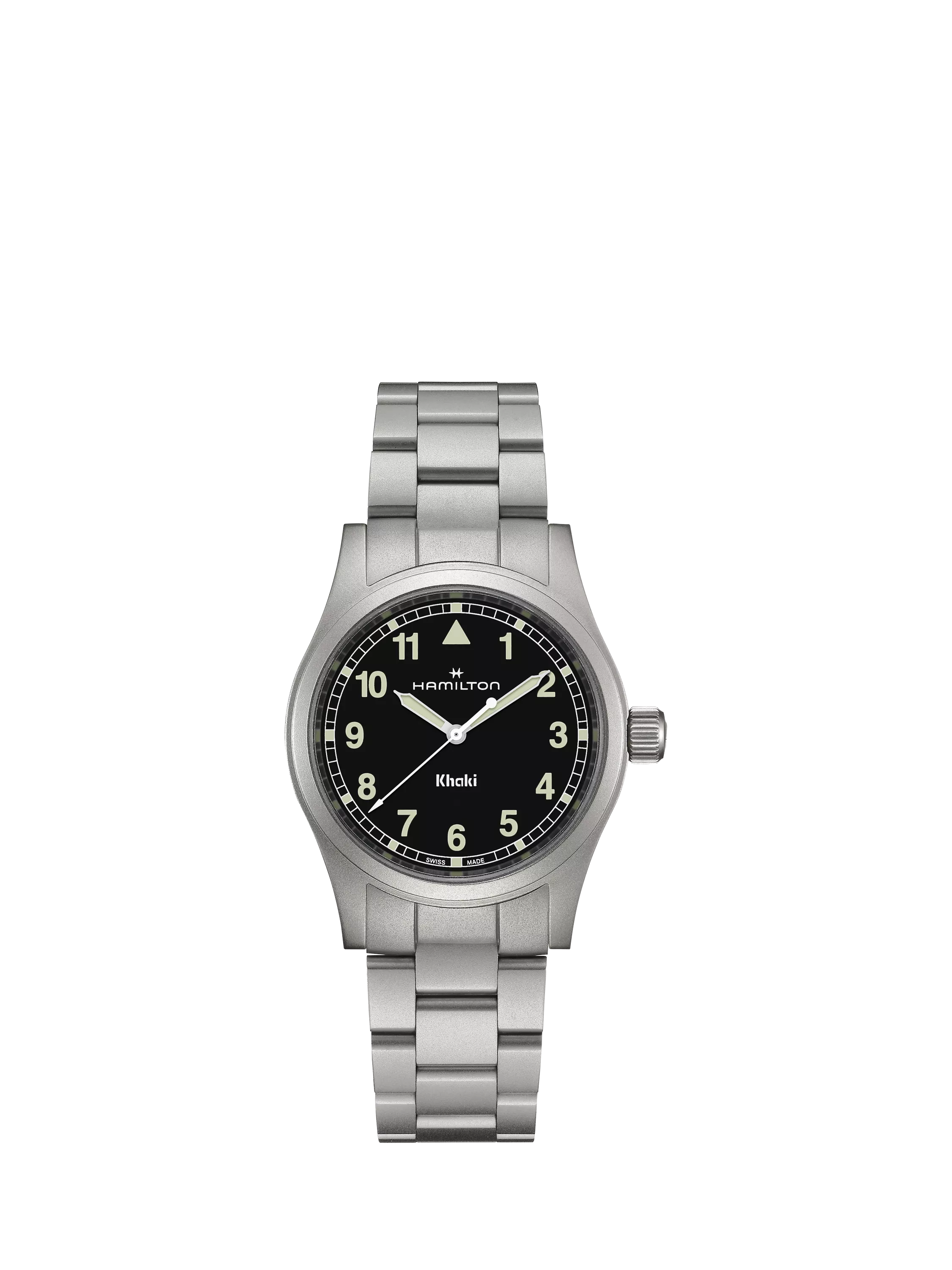 Primed for adventure, the Khaki Field Quartz is a reliable and rugged companion ready for exploration. Taking inspiration from Hamilton's reputation for precision, innovation and utility-focused design, the Khaki Field Quartz pairs a timeless black 38mm dial with a modern metal bracelet.
