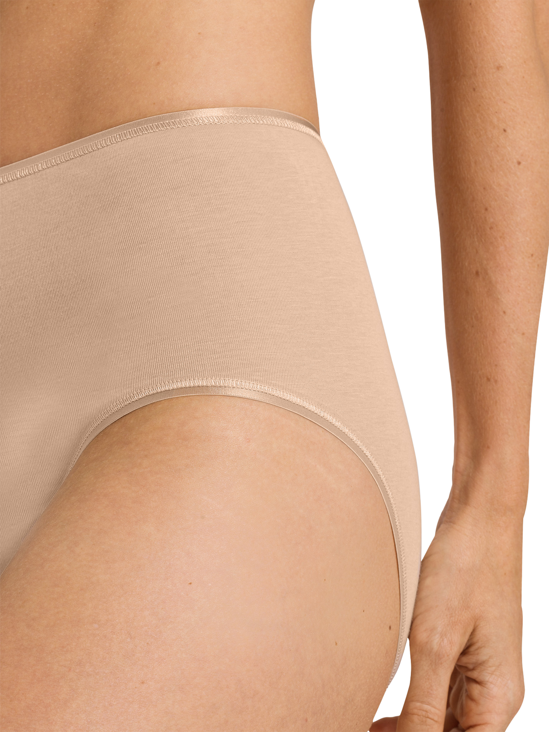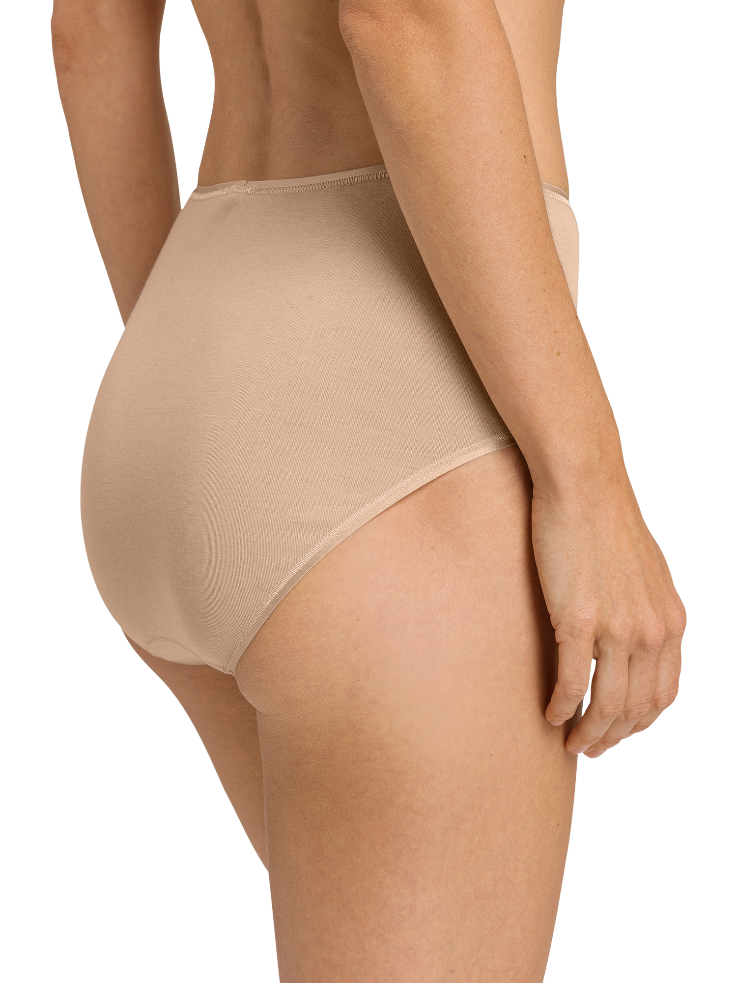 They have the typical seamless design and are crafted from new, soft mercerised 100% cotton. The higher waist and lowered legs create a flattering profile under clothing. Elastic satin trimmings on the waistband and leg openings create a feminine touch and an ideal fit.