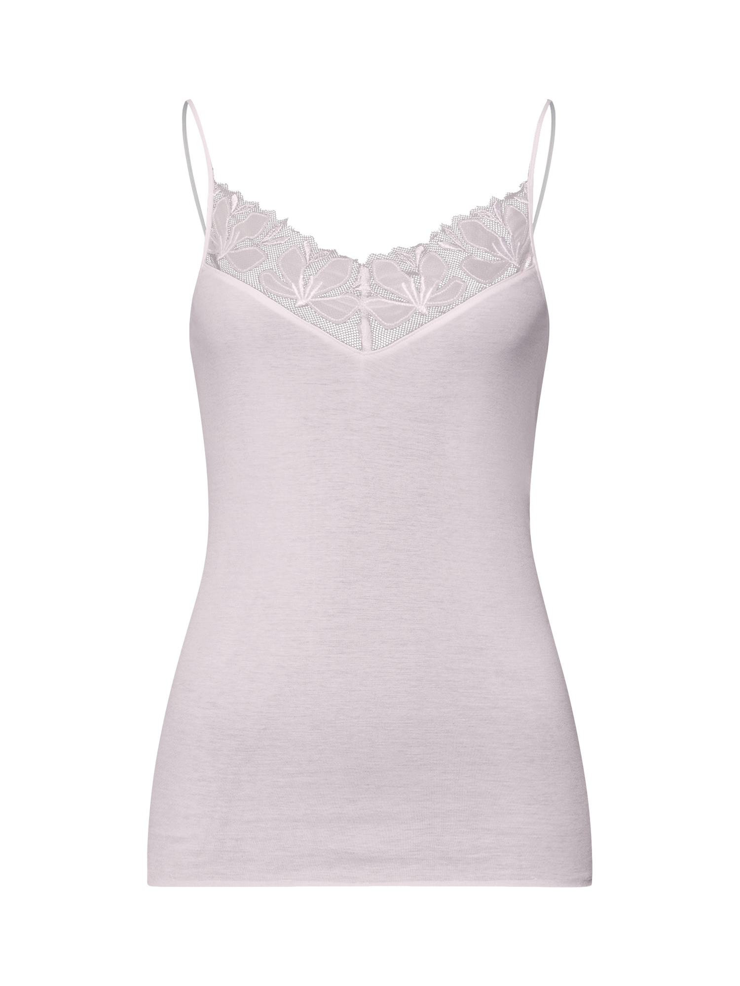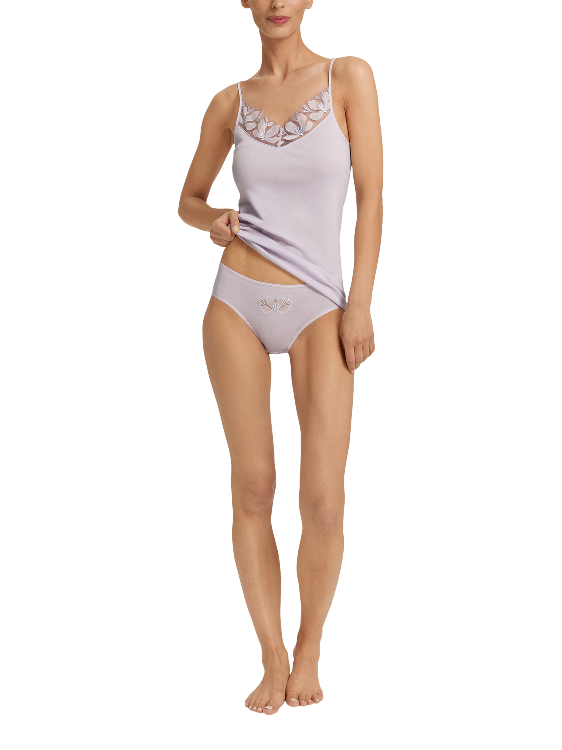 The feminine spaghetti top for cotton lovers. Designed for those who appreciate the softness and breathability of cotton, this collection features a seamless, hem-free top crafted from premium mercerized cotton for a smooth and comfortable fit. A standout detail is the delicate floral embroidery on a fine tulle base from Austria, exclusively created by HANRO design team.