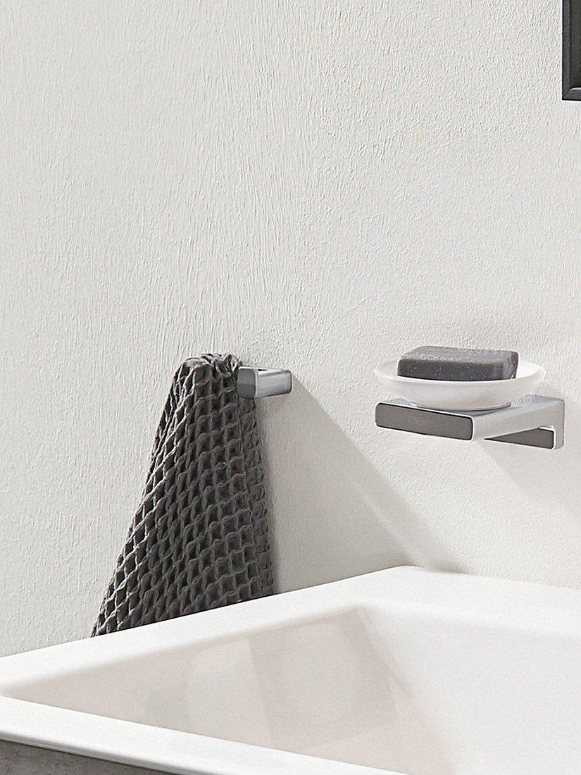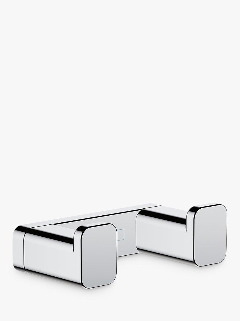 A stylish AddStoris wall-mounted double towel hook, from Hansgrohe, adding visual and functional flair to a bathroom. With this modern and minimalist design, the compact hooks keep bath towels or bathrobes within easy reach.